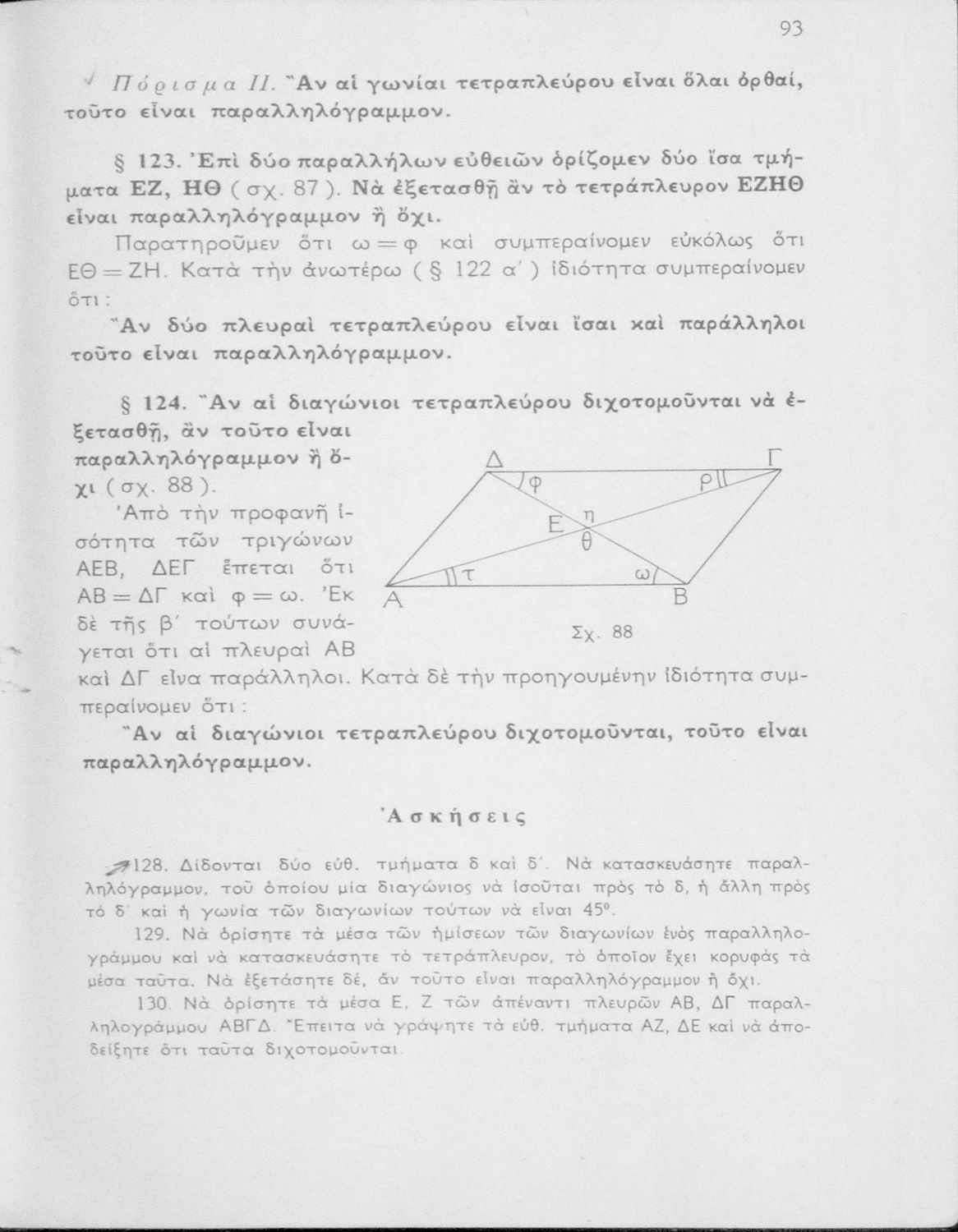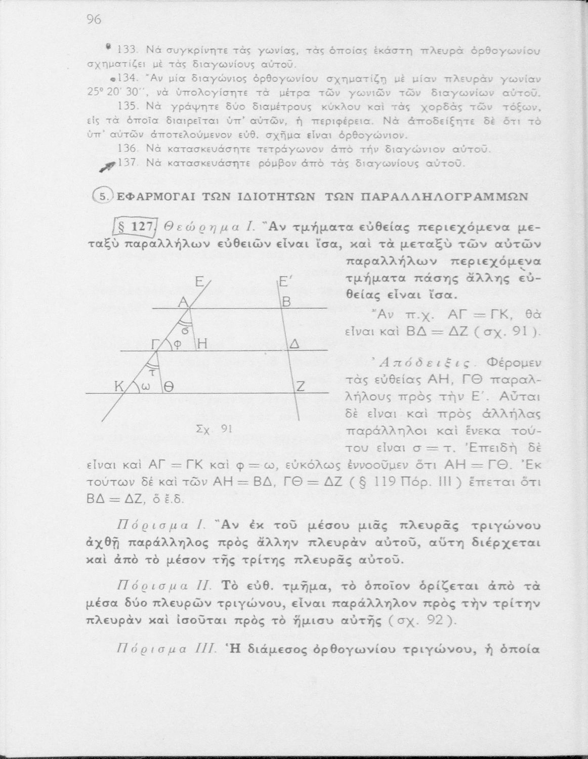 Σχολικό εγχειρίδιο Γεωμετρίας Γυμνασίου που είναι χωρισμένο σε θεωρήματα και ασκήσεις και εστιάζει στα βασικά θεωρήματα και ιδιότητες των γεωμετρικών σχημάτων. .