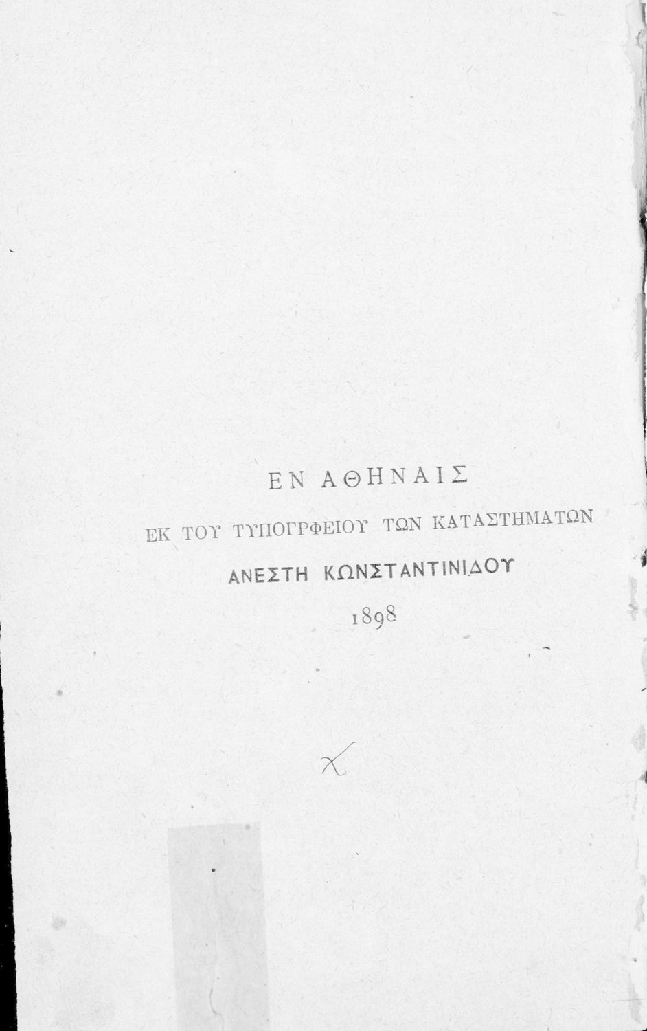 Εκδότης: Ανέστης Κωνσταντινίδης Έτος έκδοσης: 1898 Τόπος έκδοσης: Αθήνα |