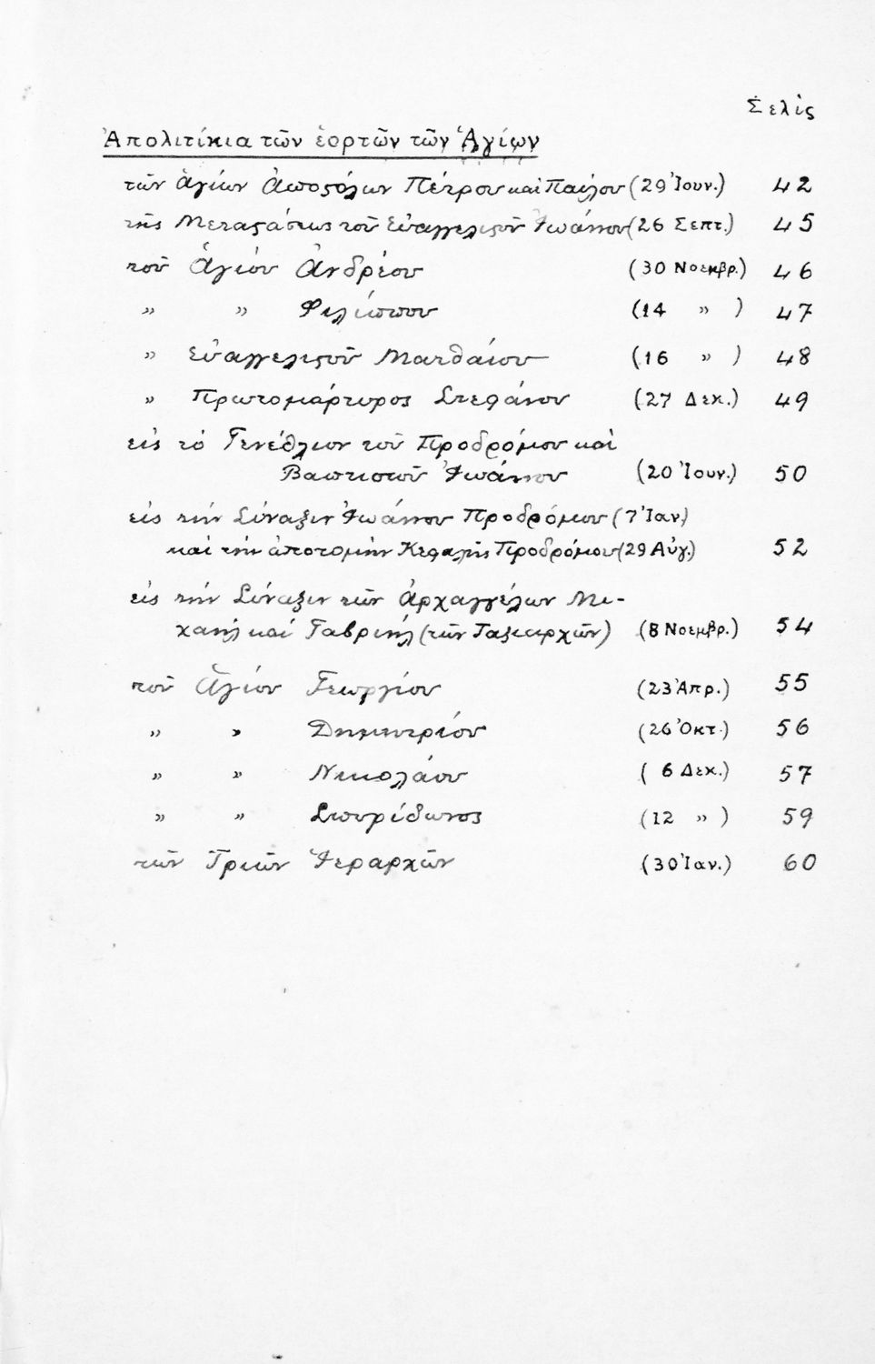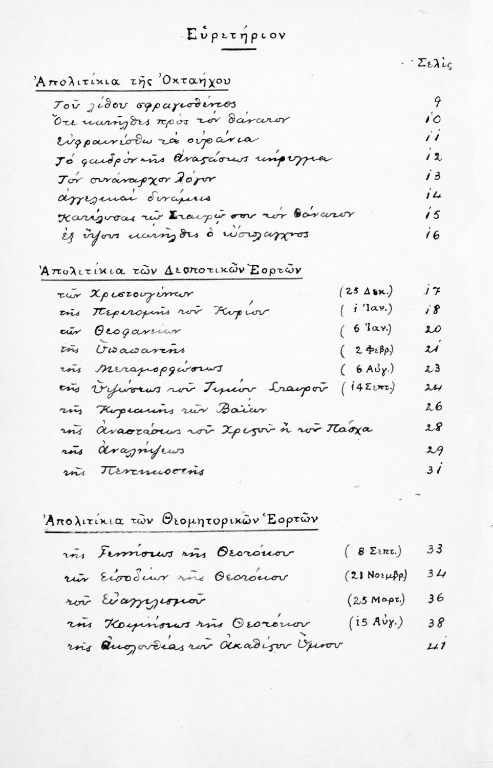 Σχολικό εγχειρίδιο Θρησκευτικών για τις τρεις τάξεις των Ελληνικών Σχολείων. Πρόκειται για βιβλίο που περιέχει συλλογή και εξήγηση από απολυτίκια των δεσποτικών και θεομητορικών εορτών.