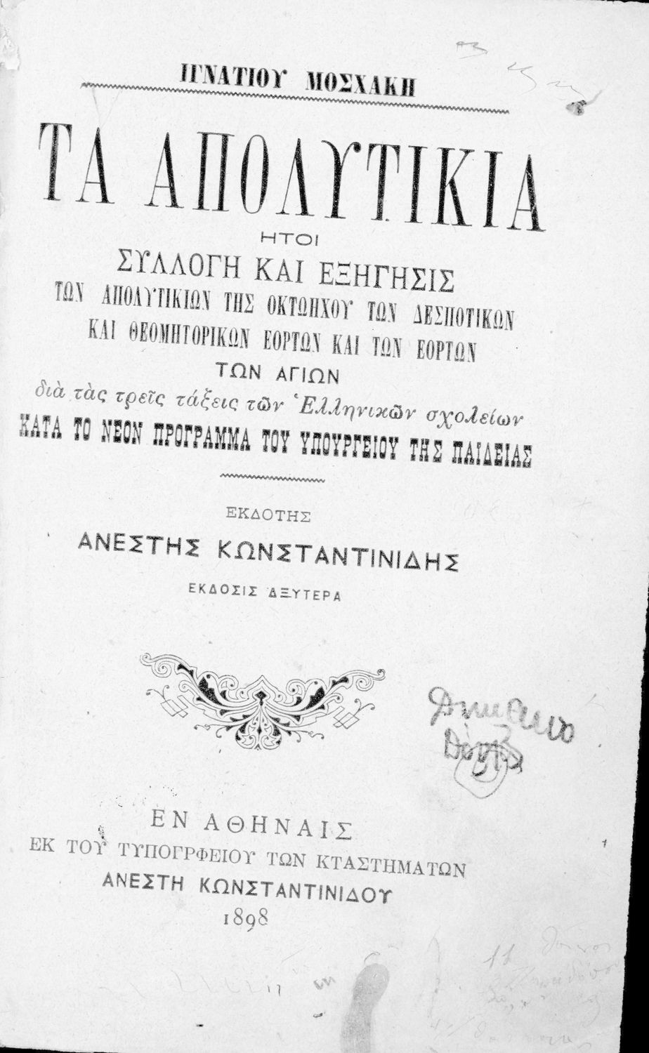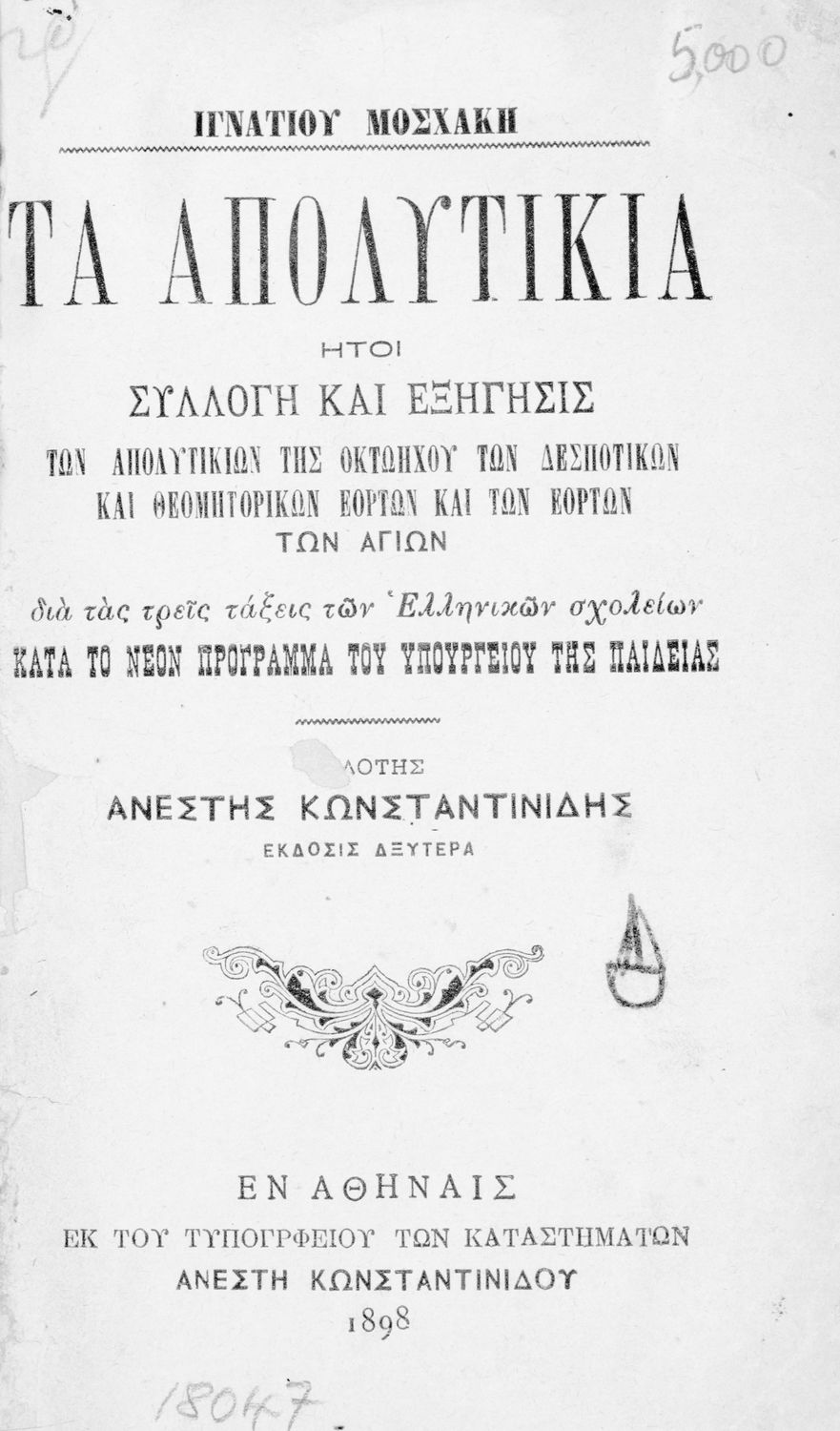 Τίτλος: Τα Απολυτίκια ήτοι συλλογή και εξήγησις των απολυτίκιων της οκτώηχου των δεσποτικών και θεομητορικών εορτών και εορτών των αγίων : δια τας τρεις τάξεις των Ελληνικών Σχολείων