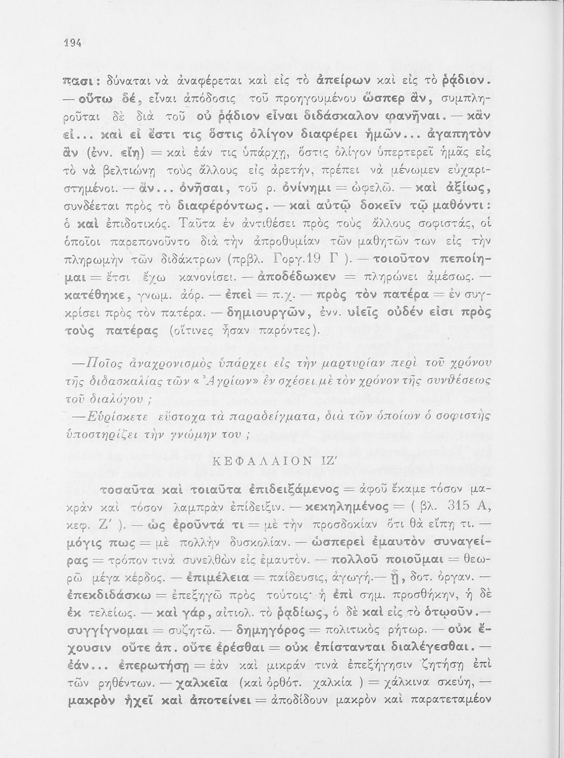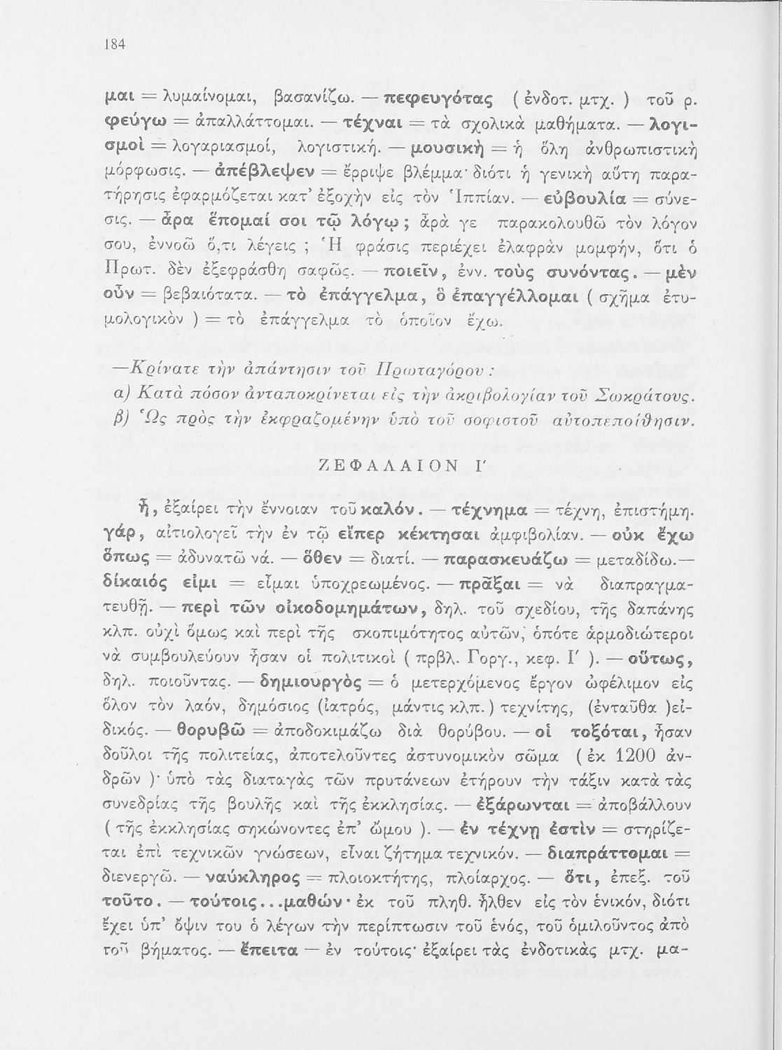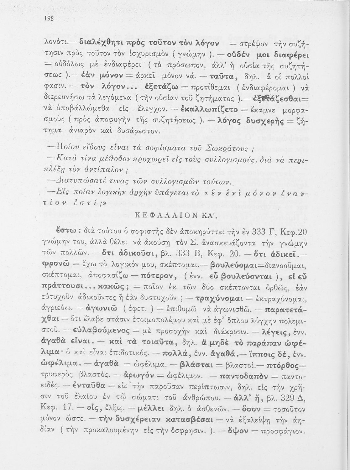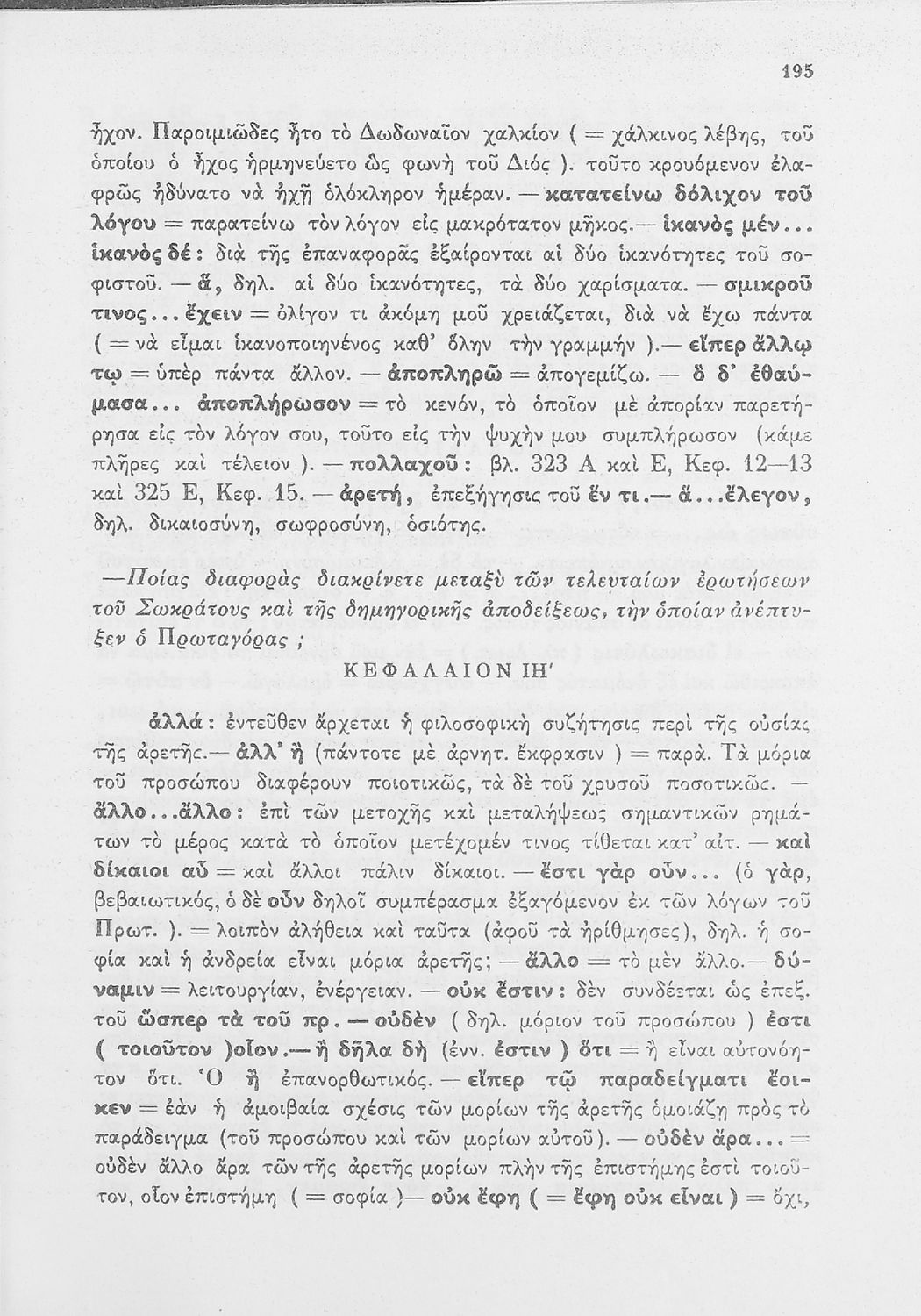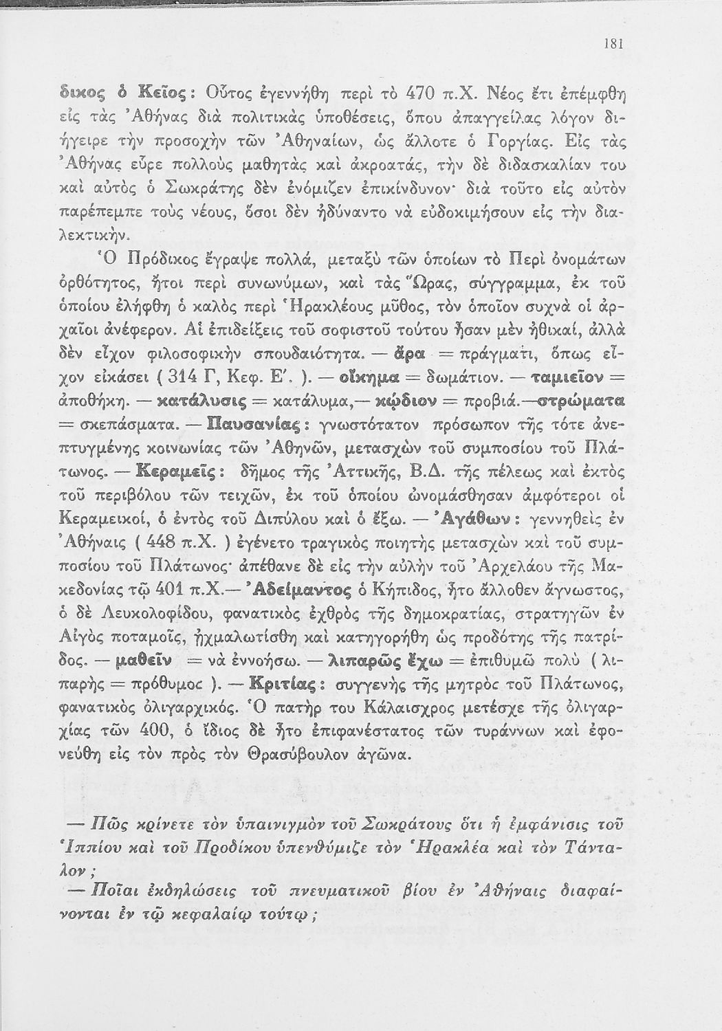 Σχολικό εγχειρίδιο για τις Τάξεις του Γυμνασίου για το μάθημα των Αρχαίων Ελληνικών. Περιλαμβάνει αποσπάσματα του αρχαίου κειμένου από τους διαλόγους του Πλάτωνα. Περιέχει μετάφραση ερμηνευτικά, πραγματολογικά