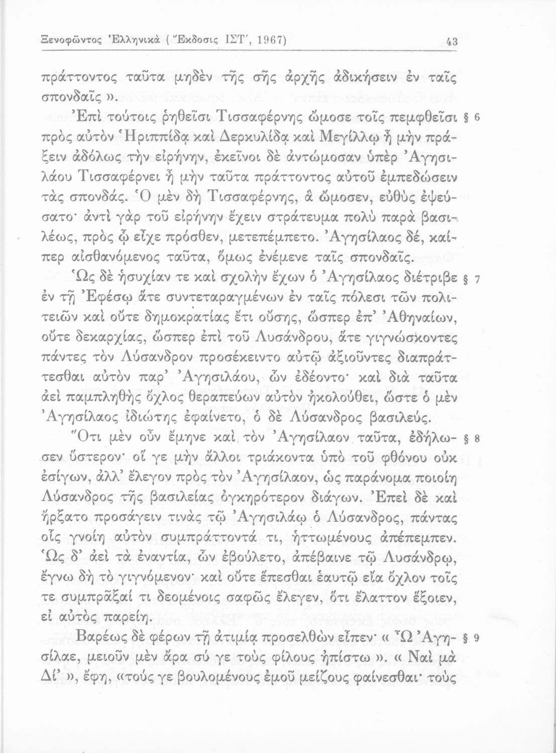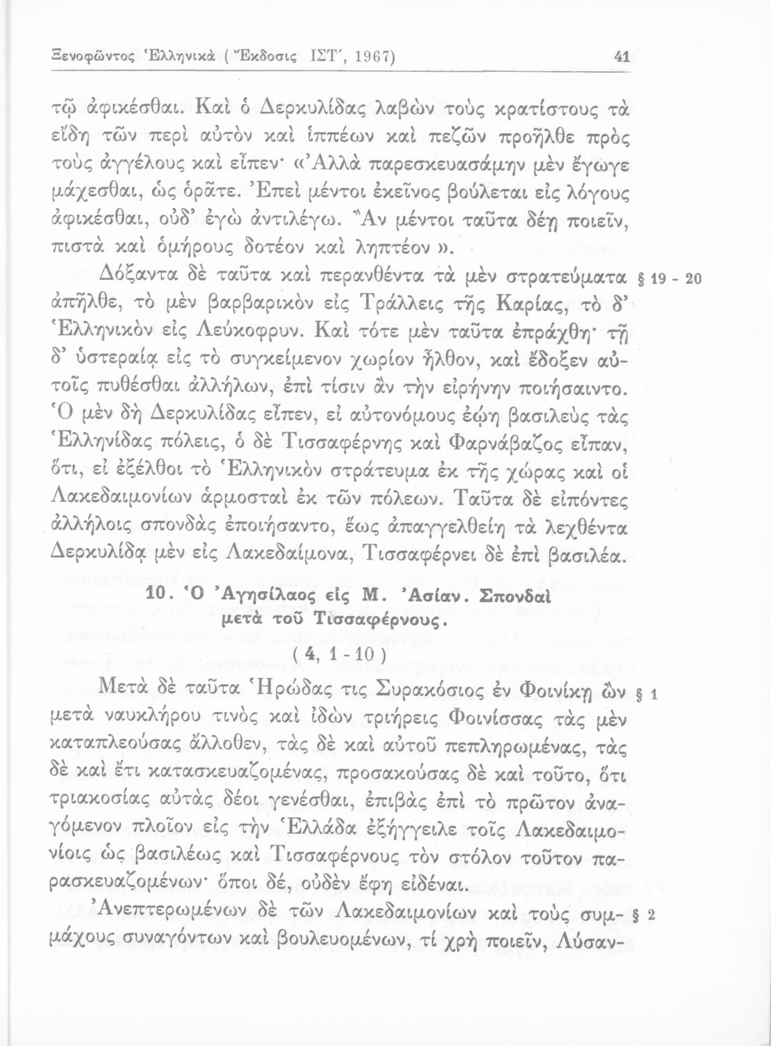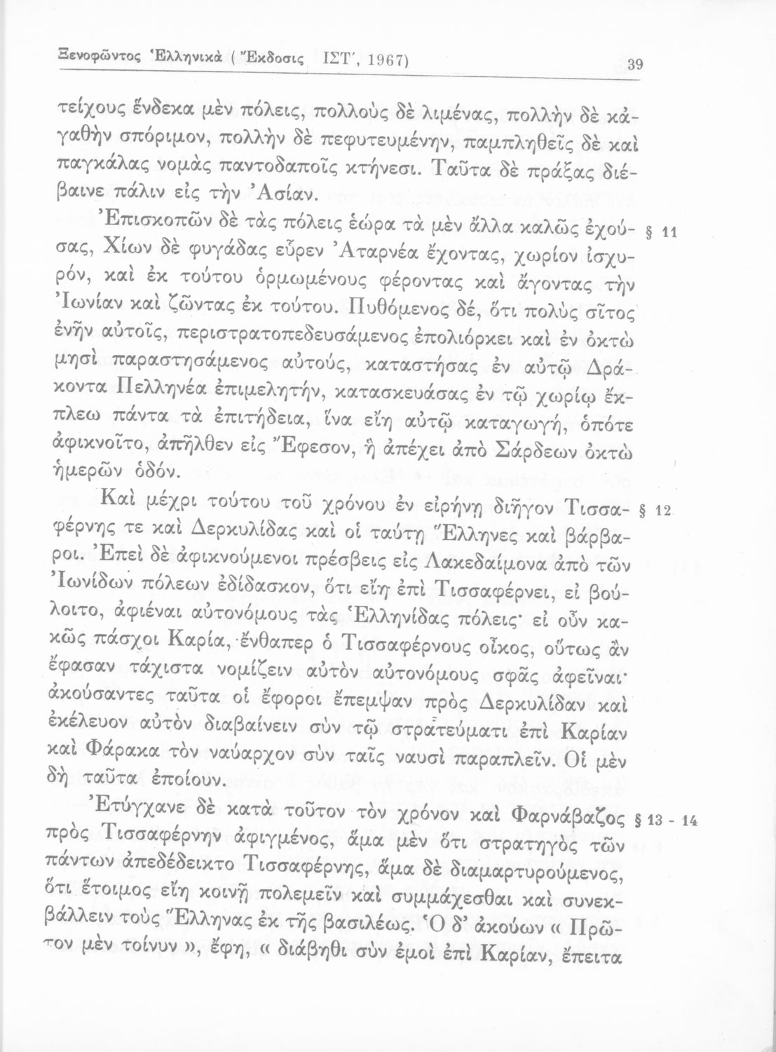 Σχολικό εγχειρίδιο Αρχαίων Ελληνικών το οποίο περιλαμβάνει το έργο του Ξενοφώντα 'Ελληνικά' συνοδευόμενο από εισαγωγικά σχόλια για τη ζωή και το έργο του καθώς και ερμηνευτικές και γραμματικές σημειώσεις.