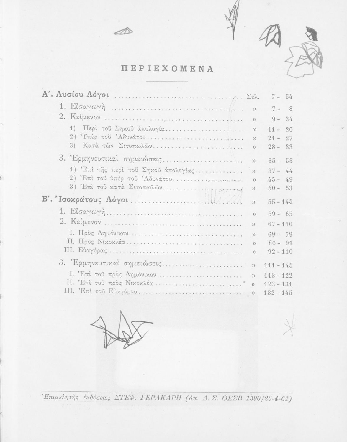 Σχολικό εγχειρίδιο Αρχαίων Ελληνικών που περιλαμβάνει τους Λόγους του Λυσία Περί του σηκού απολογία, Υπέρ του αδυνάτου, και Κατά των σιτοπωλών και του Ισοκράτη Προς Δημόνικον, Προς Νικοκλέα και Ευαγόρας, εισαγωγή στους Λόγους και ερμηνευτικά σχόλια.