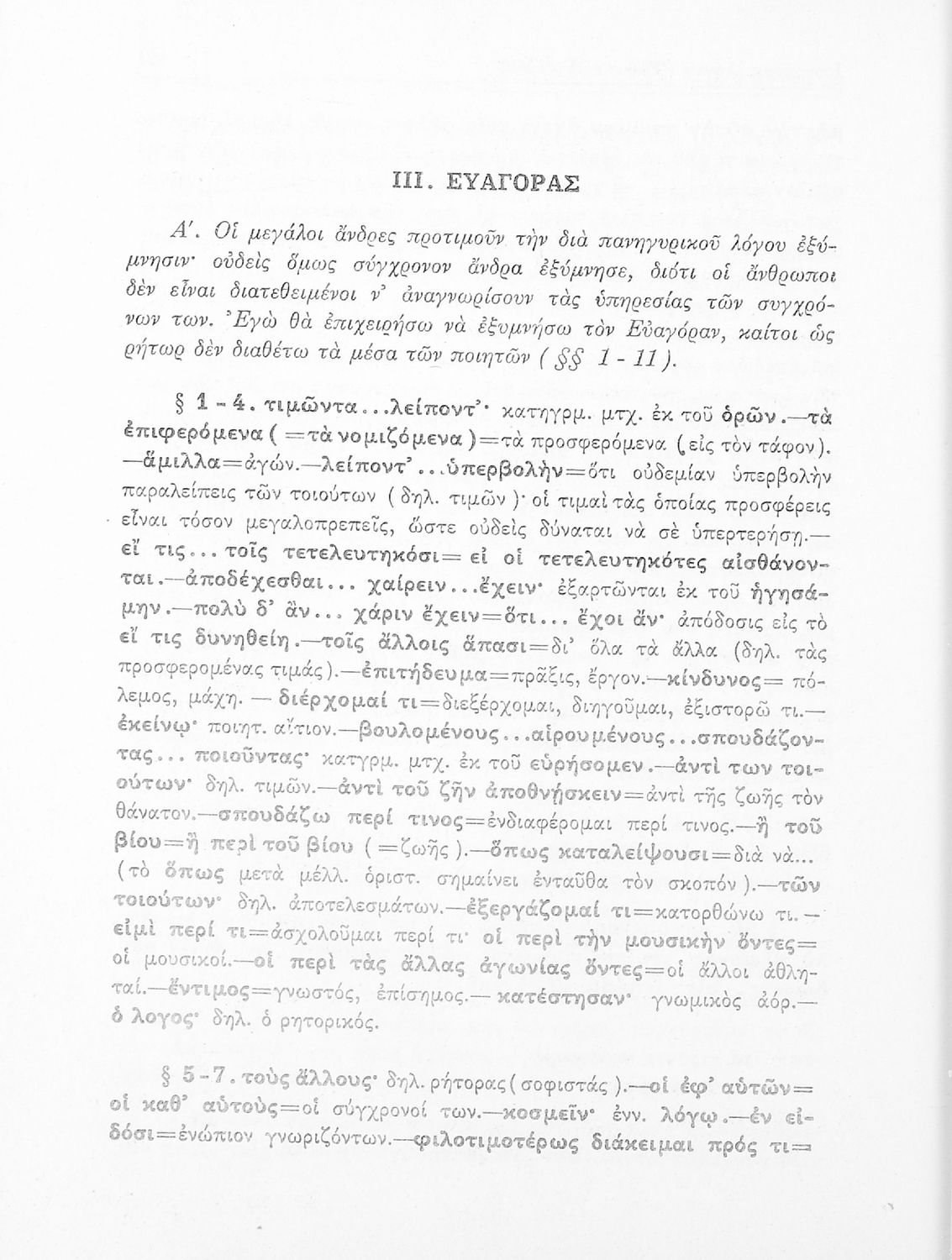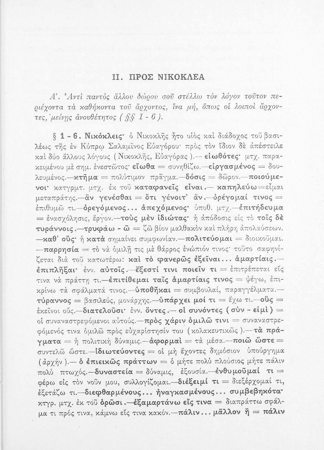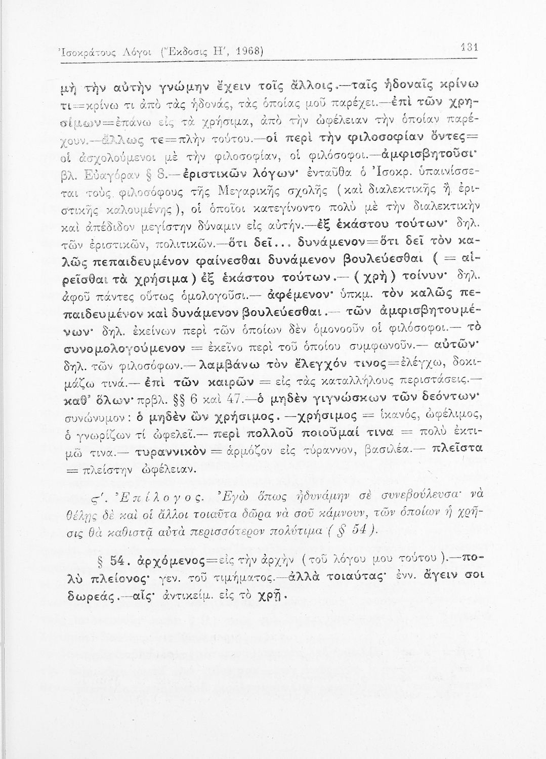 Σχολικό εγχειρίδιο Αρχαίων Ελληνικών που περιλαμβάνει τους Λόγους του Λυσία Περί του σηκού απολογία, Υπέρ του αδυνάτου, και Κατά των σιτοπωλών και του Ισοκράτη Προς Δημόνικον, Προς Νικοκλέα και Ευαγόρας, εισαγωγή στους Λόγους και ερμηνευτικά σχόλια. Φέρει το σύμβολο της δικτατορίας.