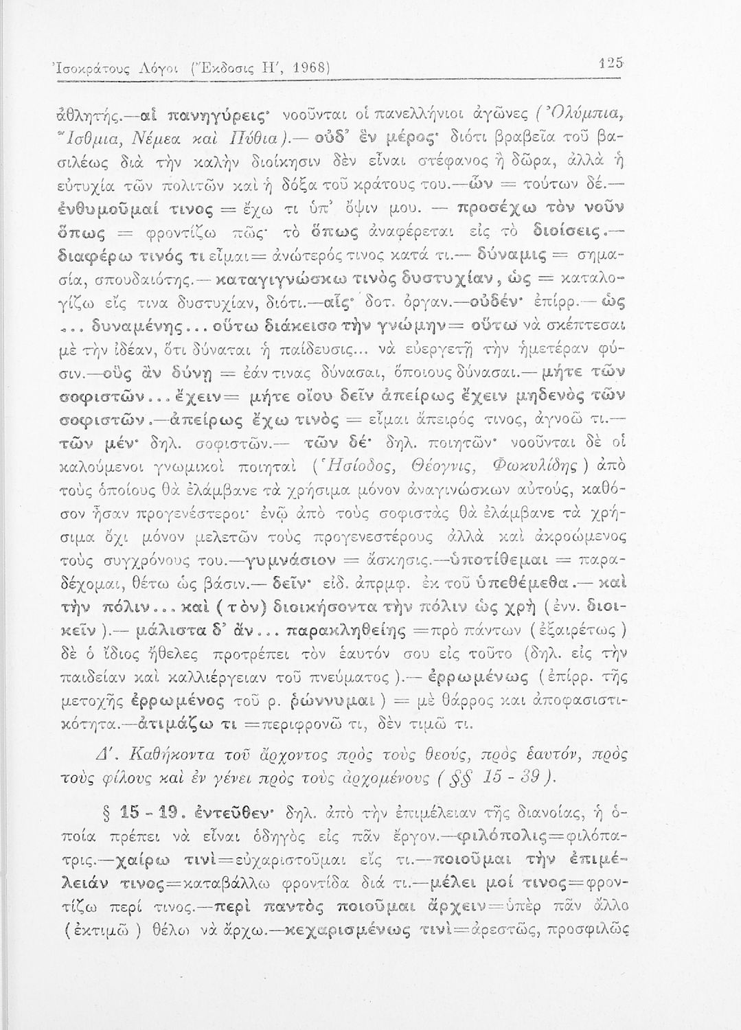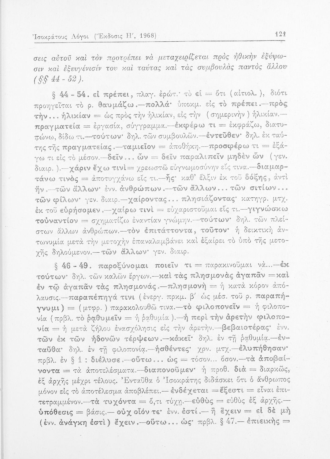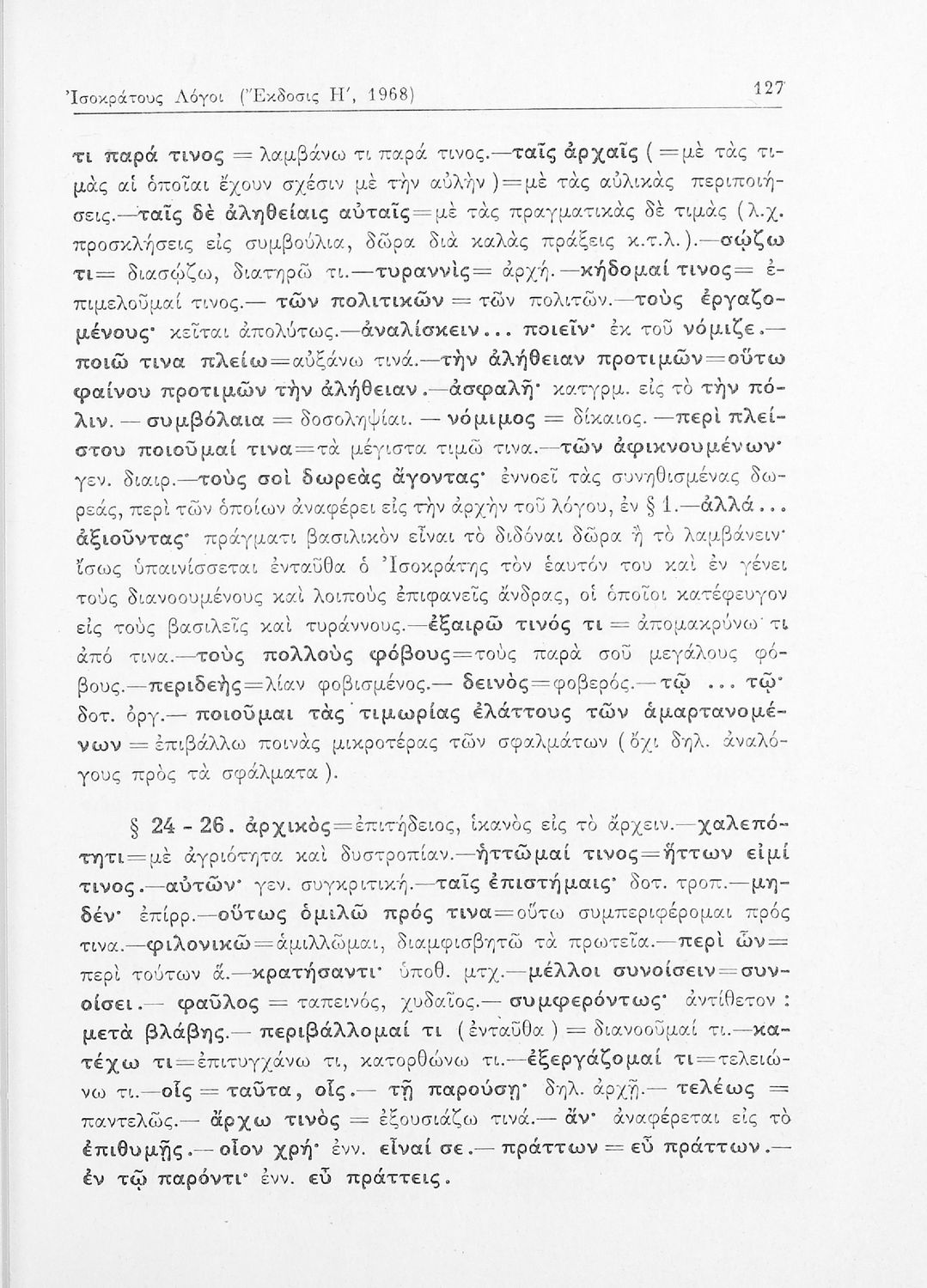 Σχολικό εγχειρίδιο Αρχαίων Ελληνικών που περιλαμβάνει τους Λόγους του Λυσία Περί του σηκού απολογία, Υπέρ του αδυνάτου, και Κατά των σιτοπωλών και του Ισοκράτη Προς Δημόνικον, Προς Νικοκλέα και Ευαγόρας, εισαγωγή στους Λόγους και ερμηνευτικά σχόλια. Φέρει το σύμβολο της δικτατορίας.