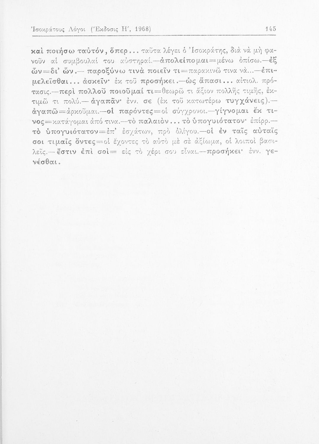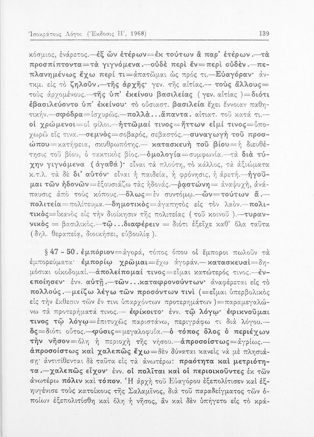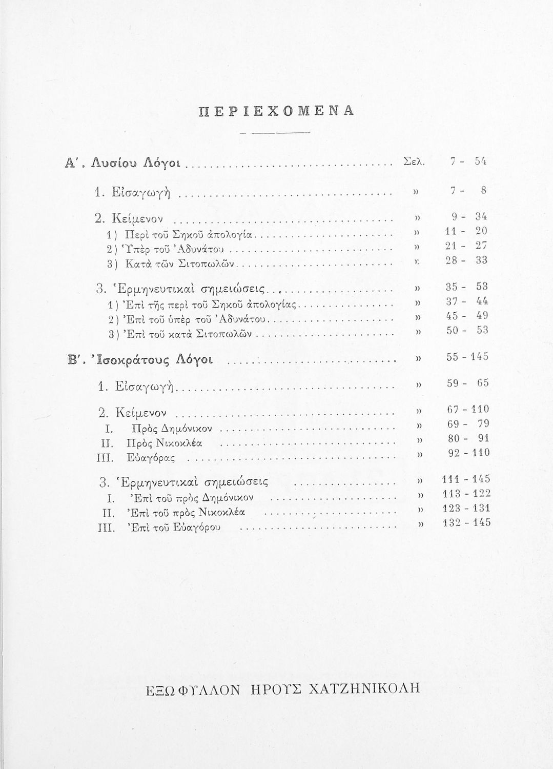 Σχολικό εγχειρίδιο Αρχαίων Ελληνικών που περιλαμβάνει τους Λόγους του Λυσία Περί του σηκού απολογία, Υπέρ του αδυνάτου, και Κατά των σιτοπωλών και του Ισοκράτη Προς Δημόνικον, Προς Νικοκλέα και Ευαγόρας, εισαγωγή στους Λόγους και ερμηνευτικά σχόλια. Φέρει το σύμβολο της δικτατορίας.