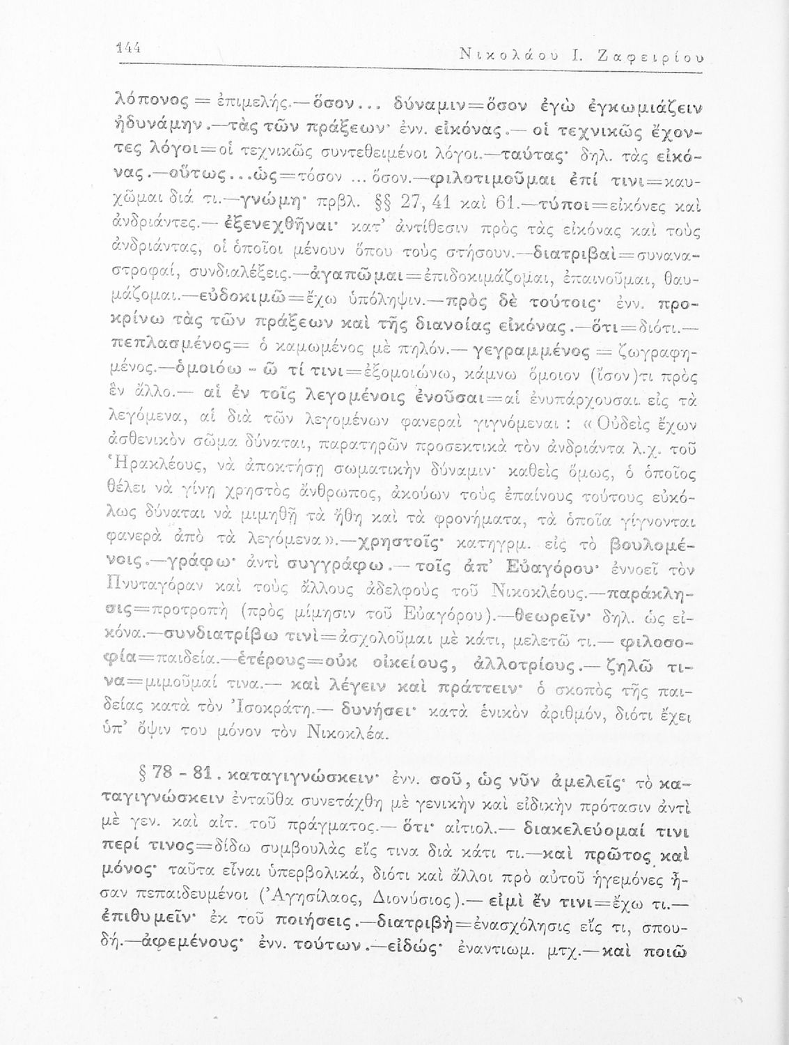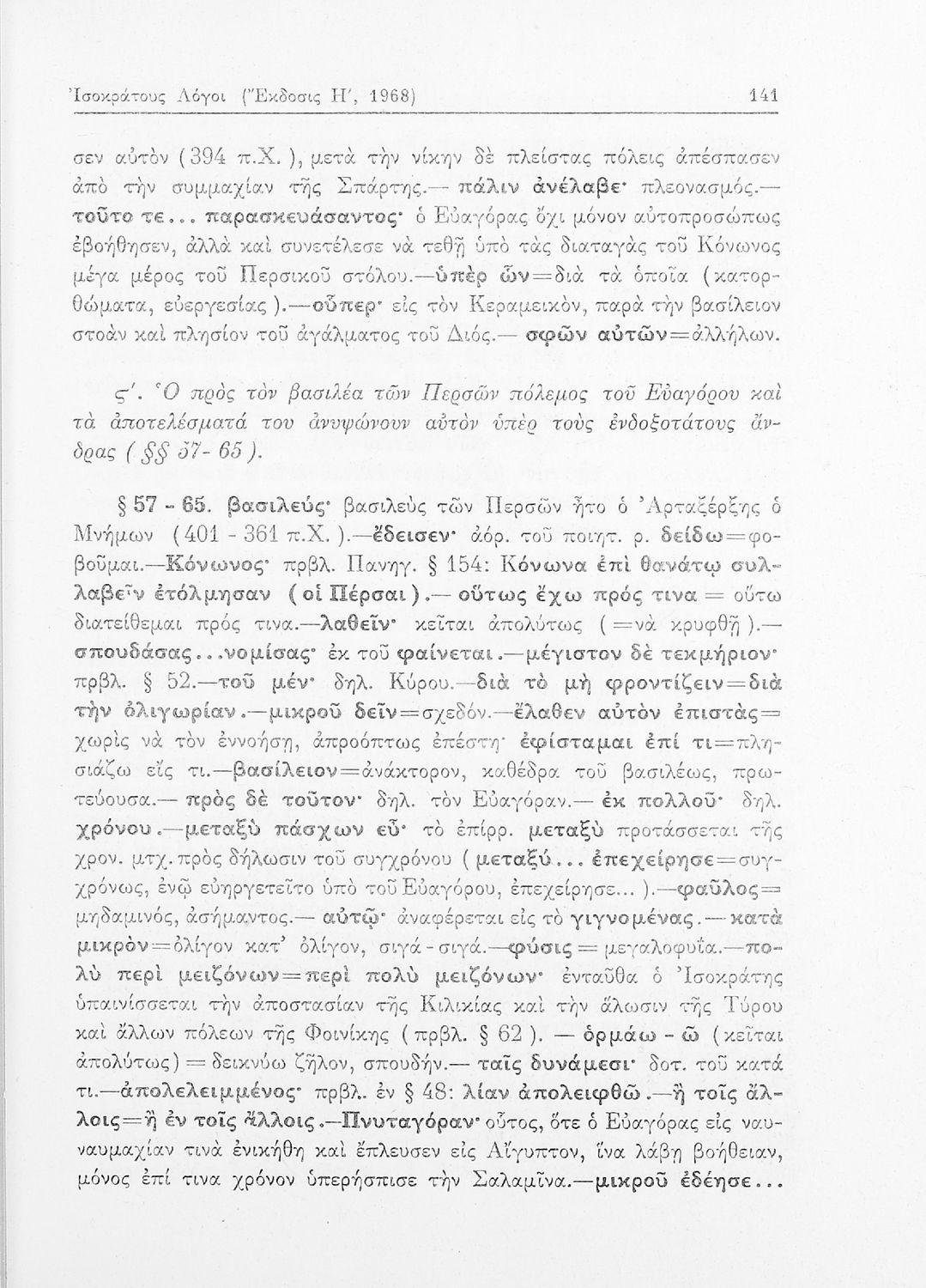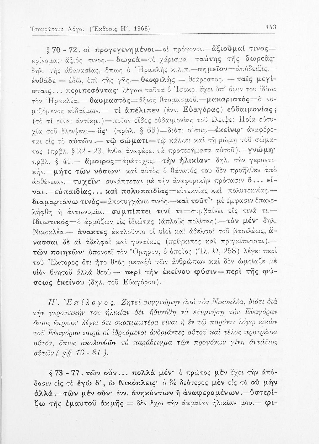 Σχολικό εγχειρίδιο Αρχαίων Ελληνικών που περιλαμβάνει τους Λόγους του Λυσία Περί του σηκού απολογία, Υπέρ του αδυνάτου, και Κατά των σιτοπωλών και του Ισοκράτη Προς Δημόνικον, Προς Νικοκλέα και Ευαγόρας, εισαγωγή στους Λόγους και ερμηνευτικά σχόλια. Φέρει το σύμβολο της δικτατορίας.