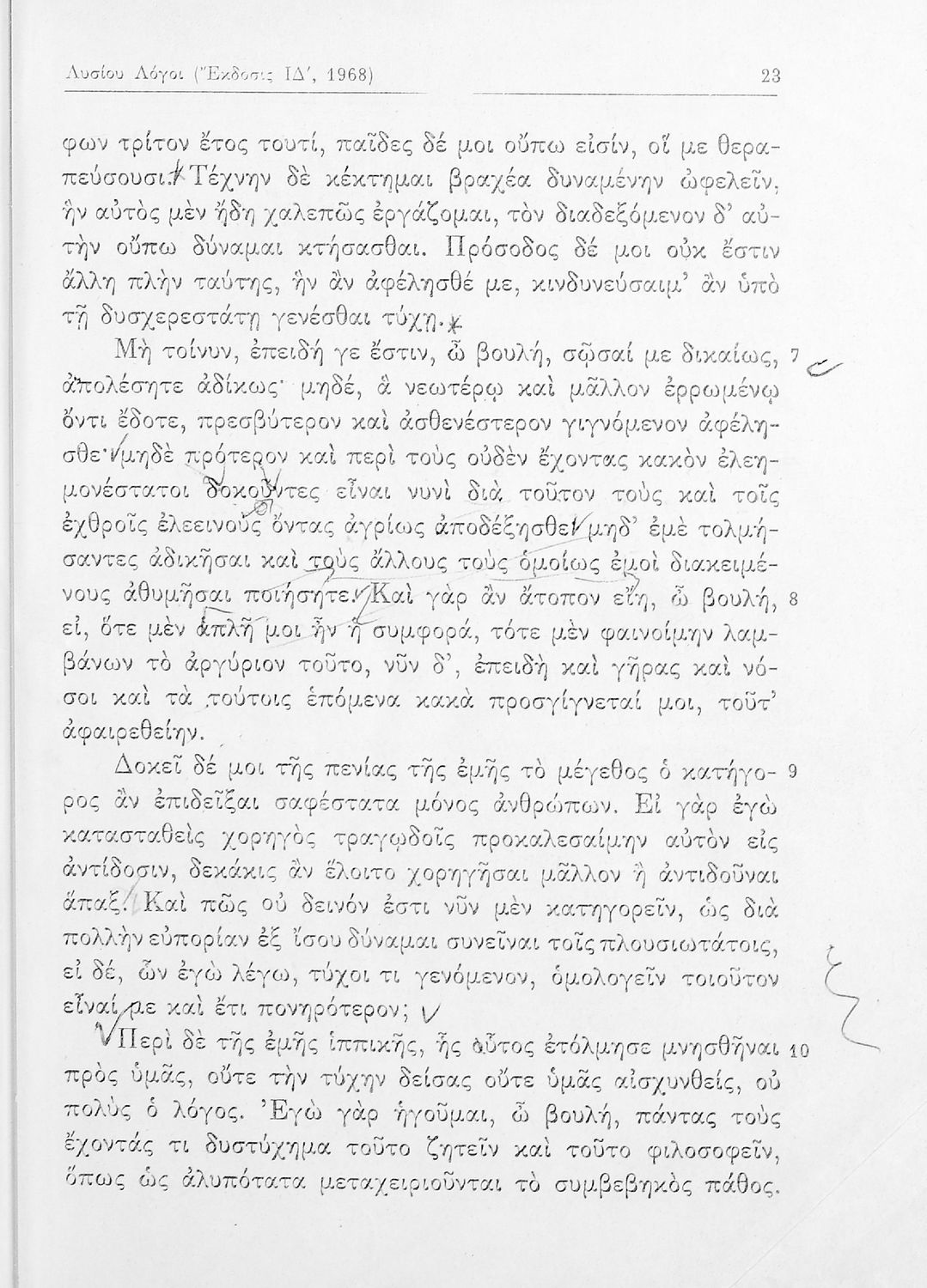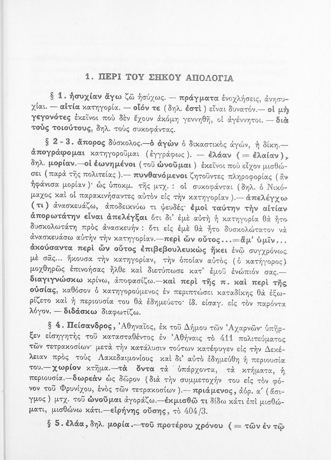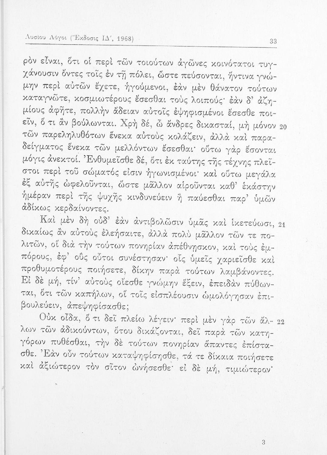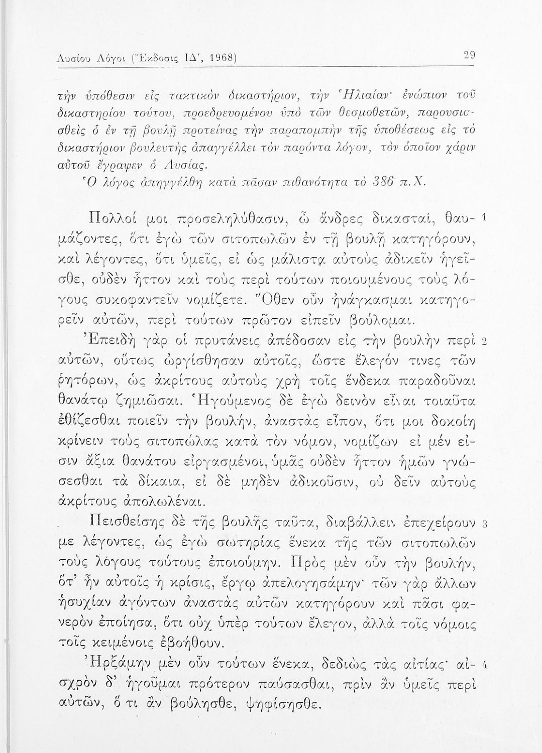 Σχολικό εγχειρίδιο Αρχαίων Ελληνικών που περιλαμβάνει τους Λόγους του Λυσία Περί του σηκού απολογία, Υπέρ του αδυνάτου, και Κατά των σιτοπωλών και του Ισοκράτη Προς Δημόνικον, Προς Νικοκλέα και Ευαγόρας, εισαγωγή στους Λόγους και ερμηνευτικά σχόλια. Φέρει το σύμβολο της δικτατορίας.