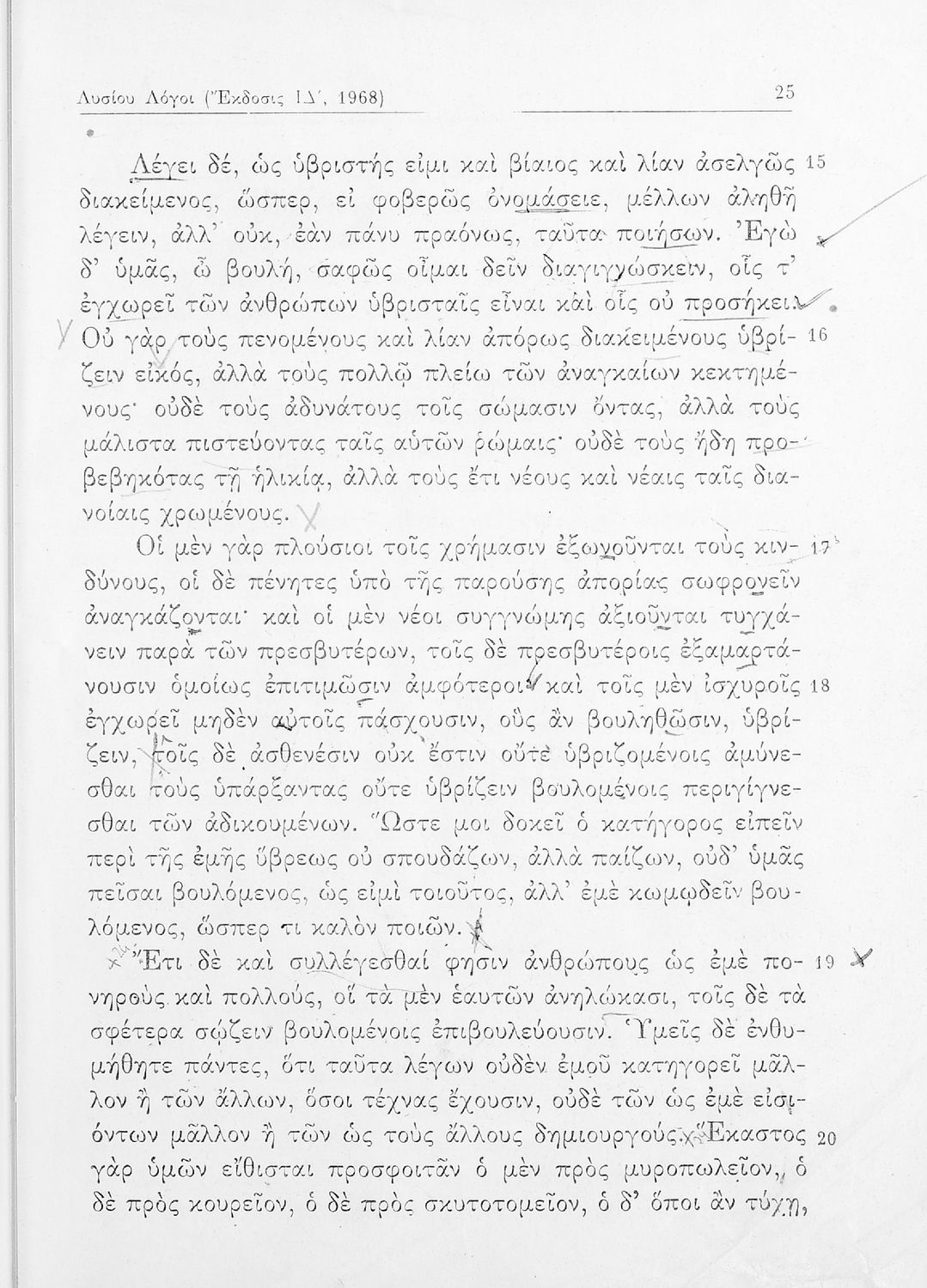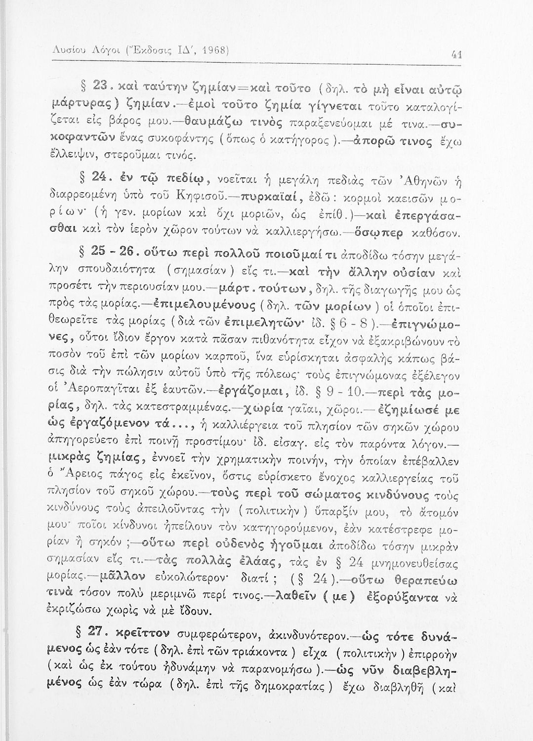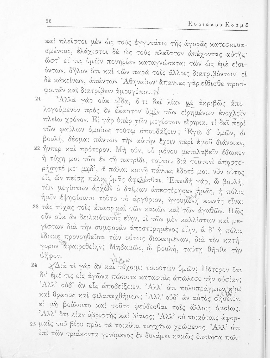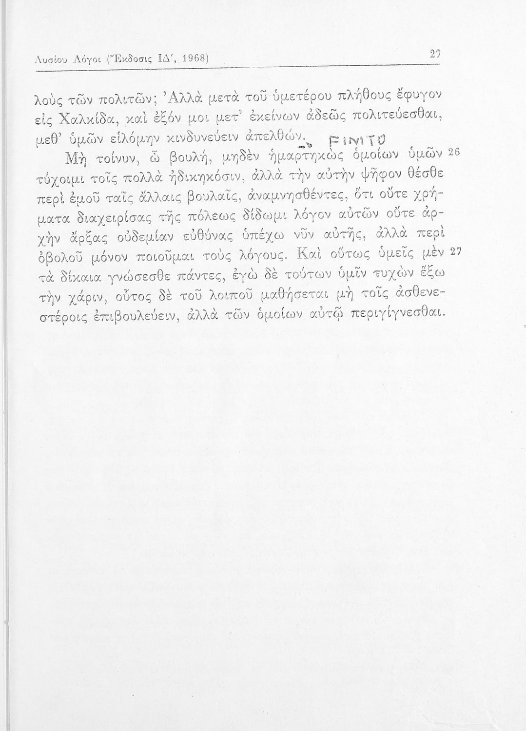 Σχολικό εγχειρίδιο Αρχαίων Ελληνικών που περιλαμβάνει τους Λόγους του Λυσία Περί του σηκού απολογία, Υπέρ του αδυνάτου, και Κατά των σιτοπωλών και του Ισοκράτη Προς Δημόνικον, Προς Νικοκλέα και Ευαγόρας, εισαγωγή στους Λόγους και ερμηνευτικά σχόλια. Φέρει το σύμβολο της δικτατορίας.
