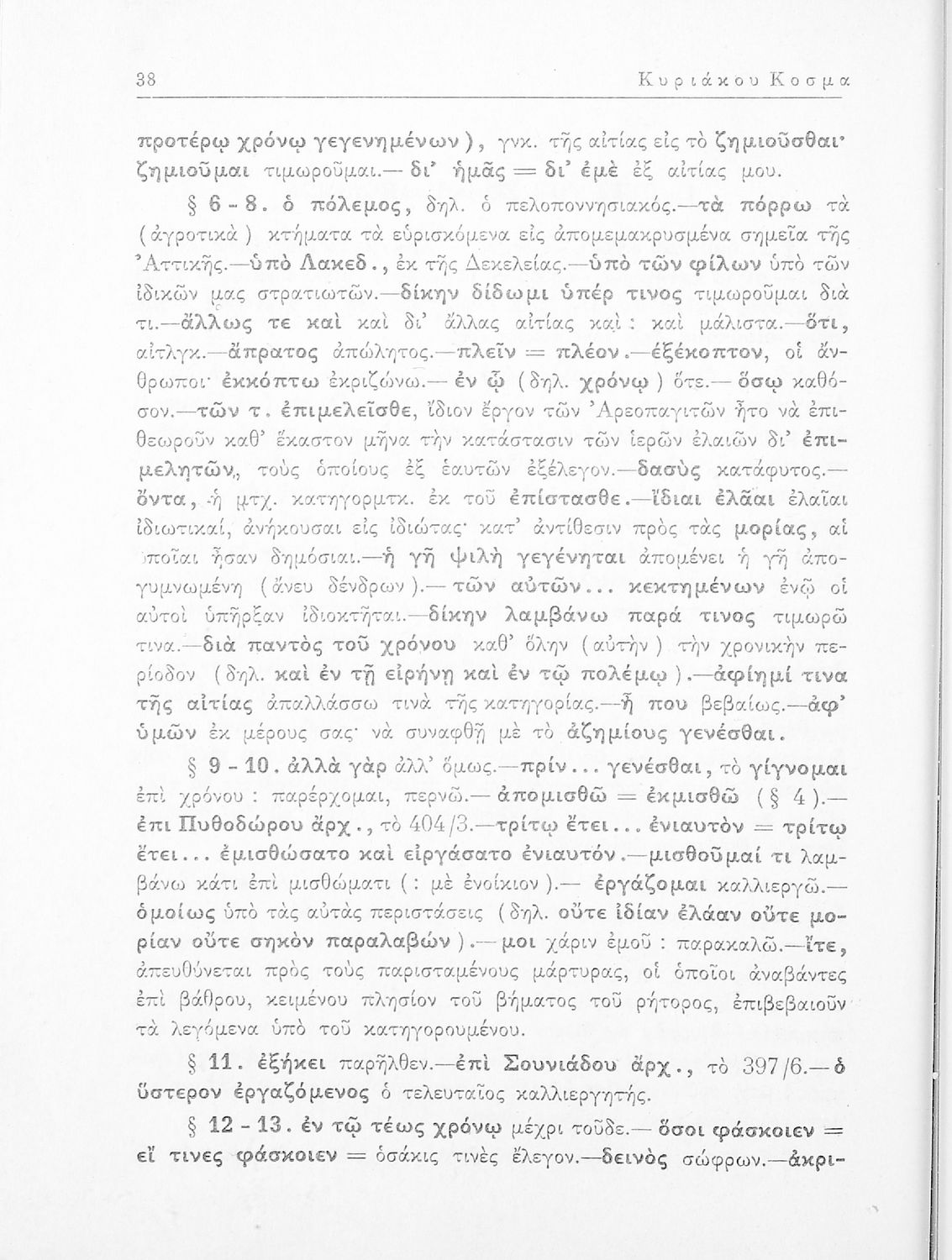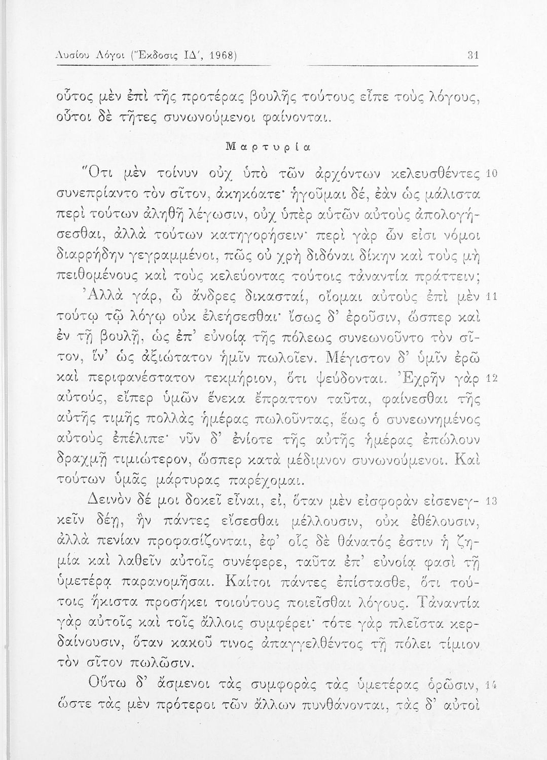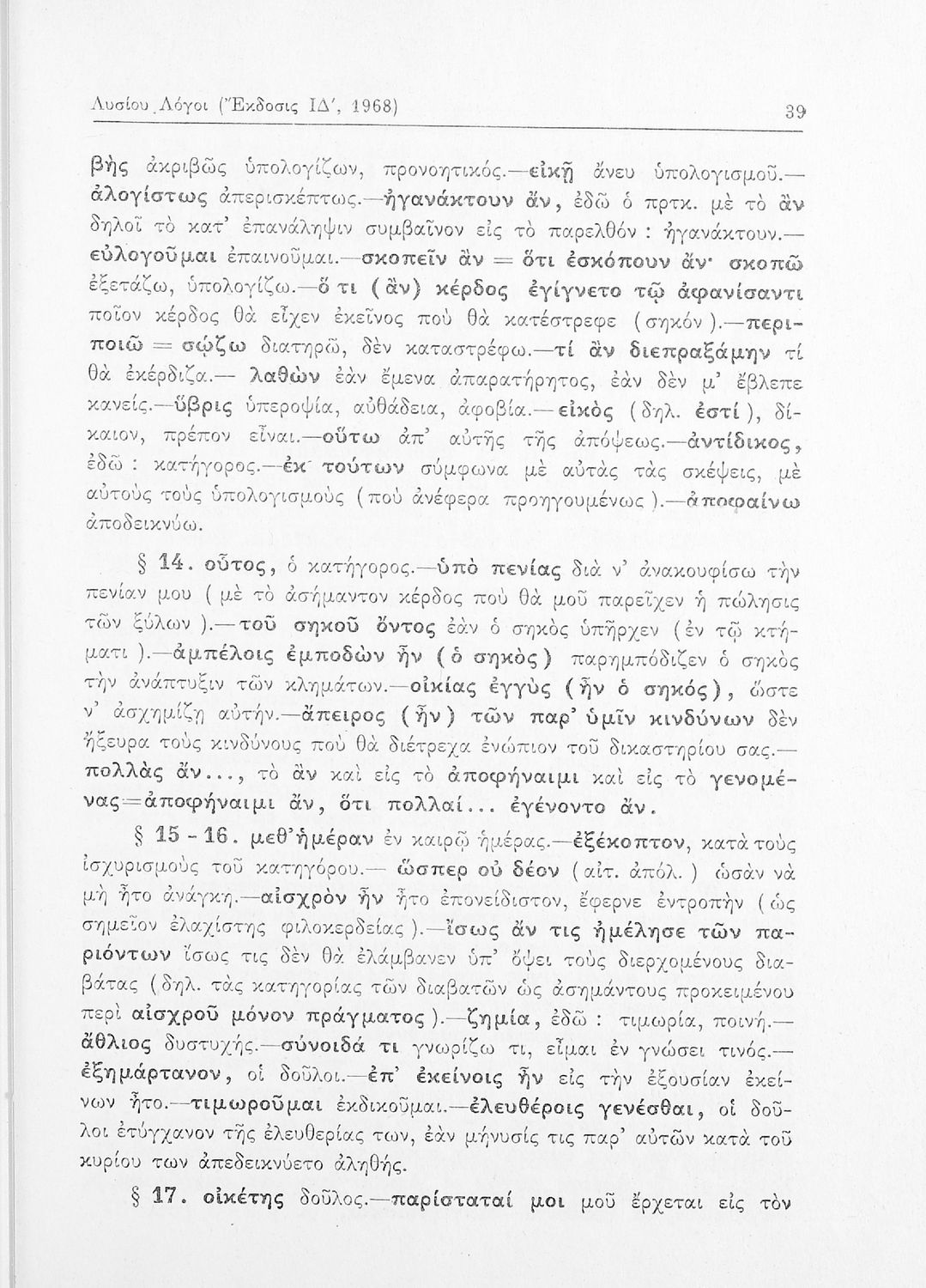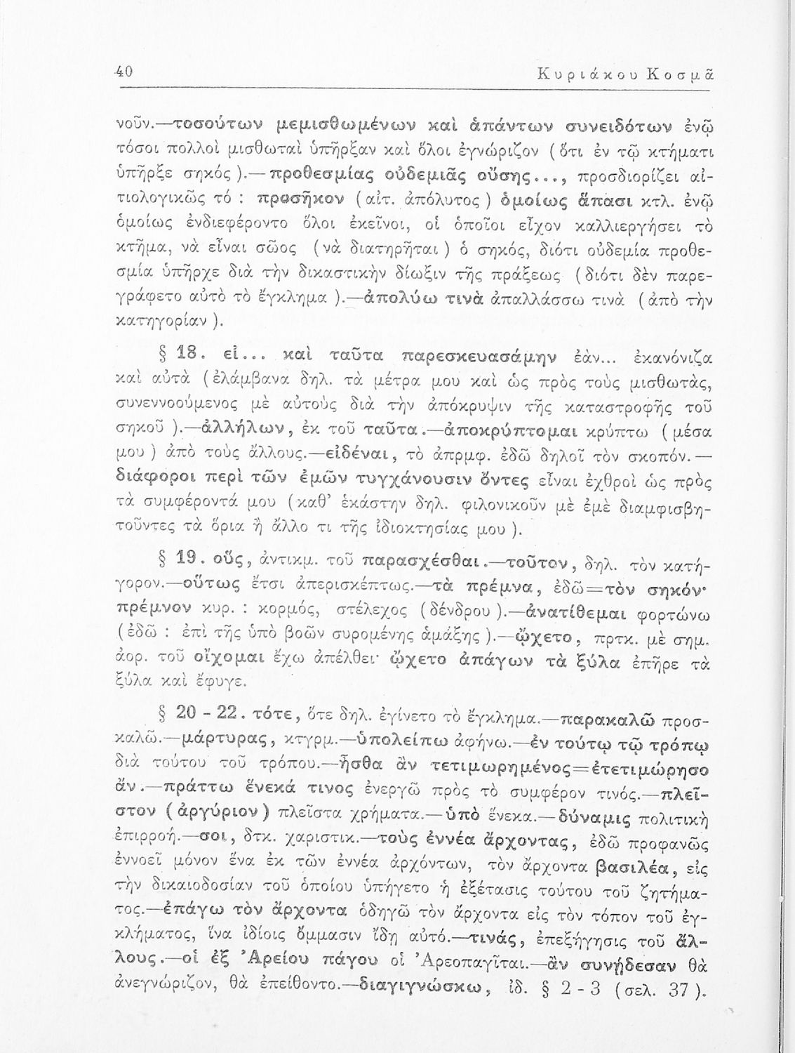 Σχολικό εγχειρίδιο Αρχαίων Ελληνικών που περιλαμβάνει τους Λόγους του Λυσία Περί του σηκού απολογία, Υπέρ του αδυνάτου, και Κατά των σιτοπωλών και του Ισοκράτη Προς Δημόνικον, Προς Νικοκλέα και Ευαγόρας, εισαγωγή στους Λόγους και ερμηνευτικά σχόλια. Φέρει το σύμβολο της δικτατορίας.