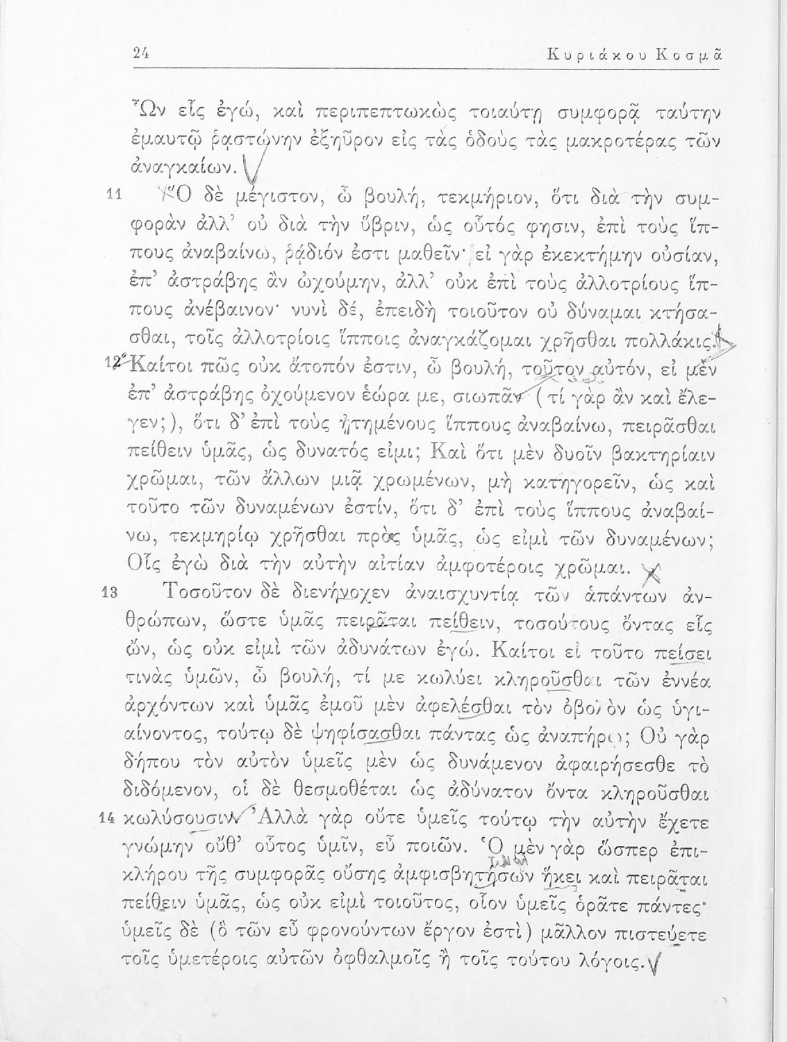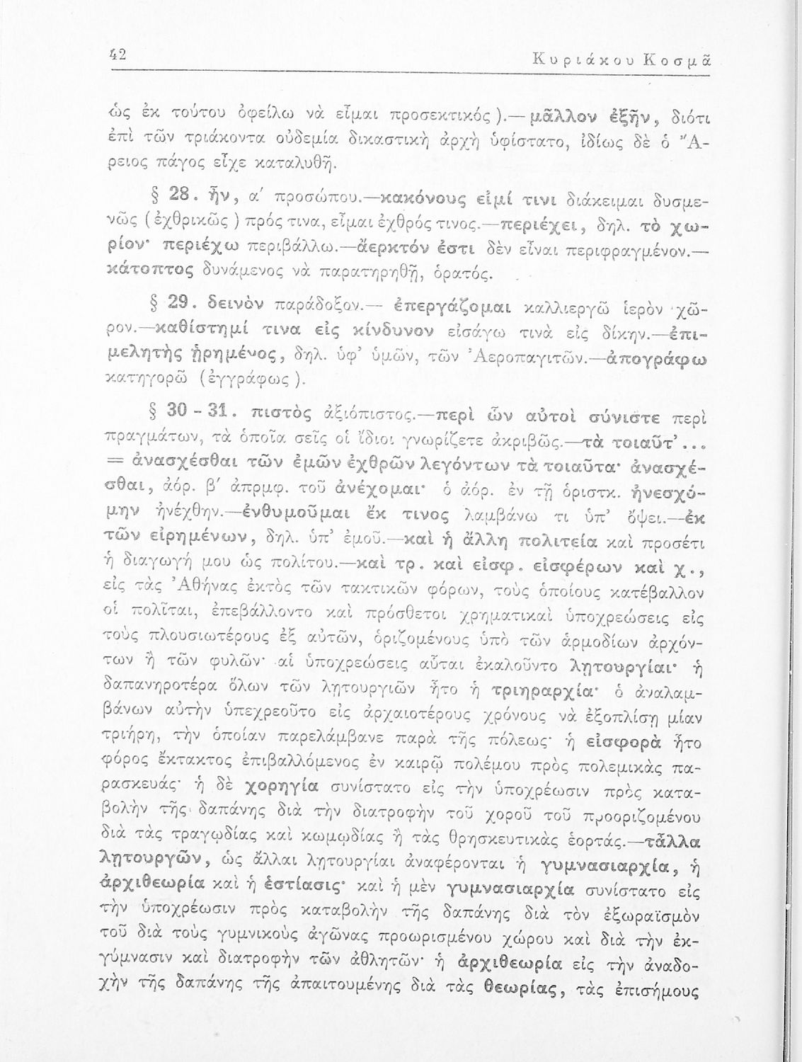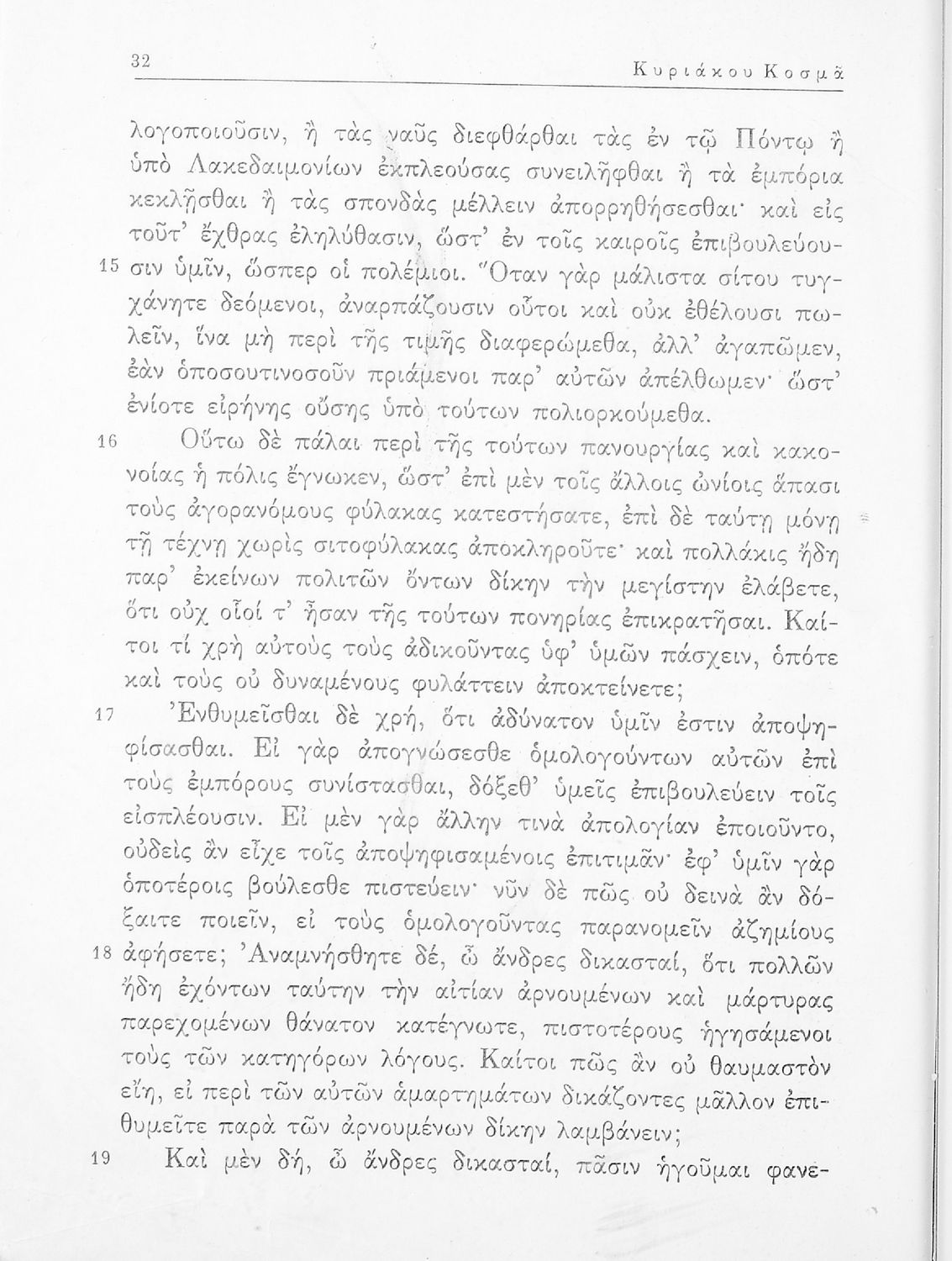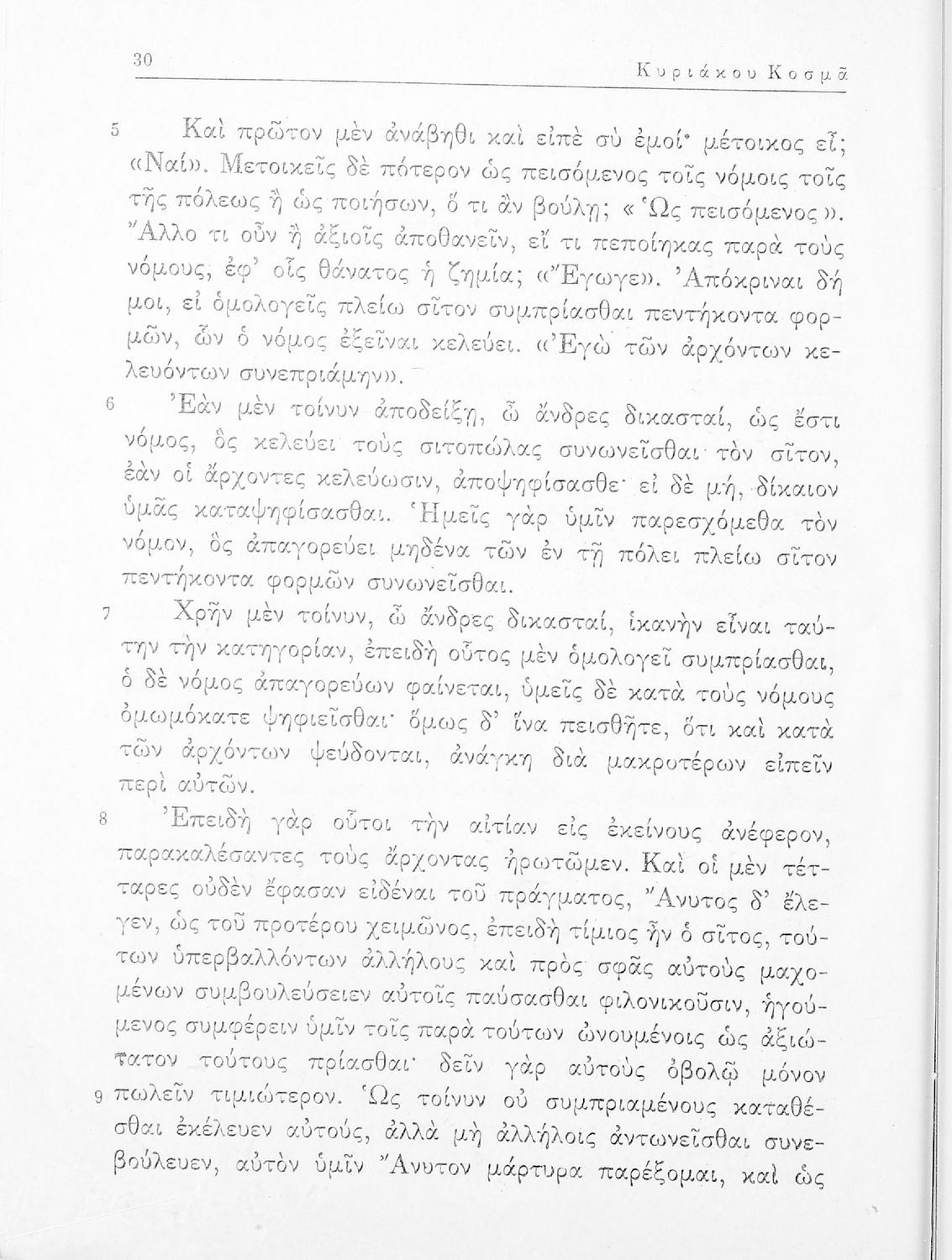 Σχολικό εγχειρίδιο Αρχαίων Ελληνικών που περιλαμβάνει τους Λόγους του Λυσία Περί του σηκού απολογία, Υπέρ του αδυνάτου, και Κατά των σιτοπωλών και του Ισοκράτη Προς Δημόνικον, Προς Νικοκλέα και Ευαγόρας, εισαγωγή στους Λόγους και ερμηνευτικά σχόλια. Φέρει το σύμβολο της δικτατορίας.