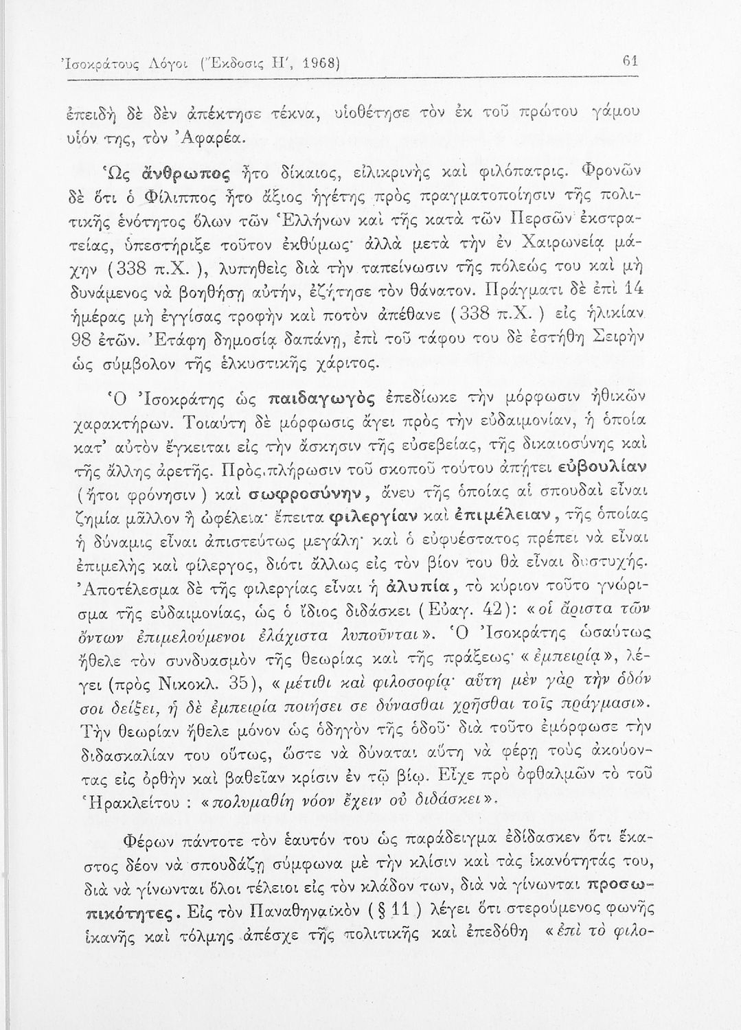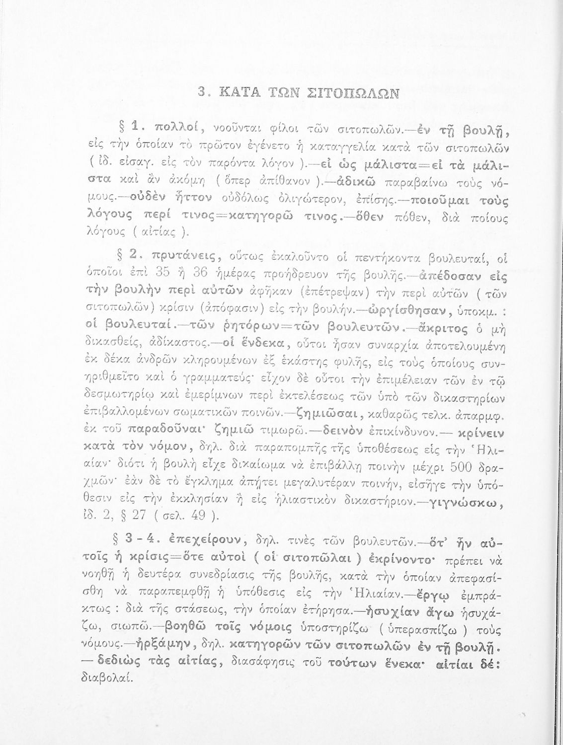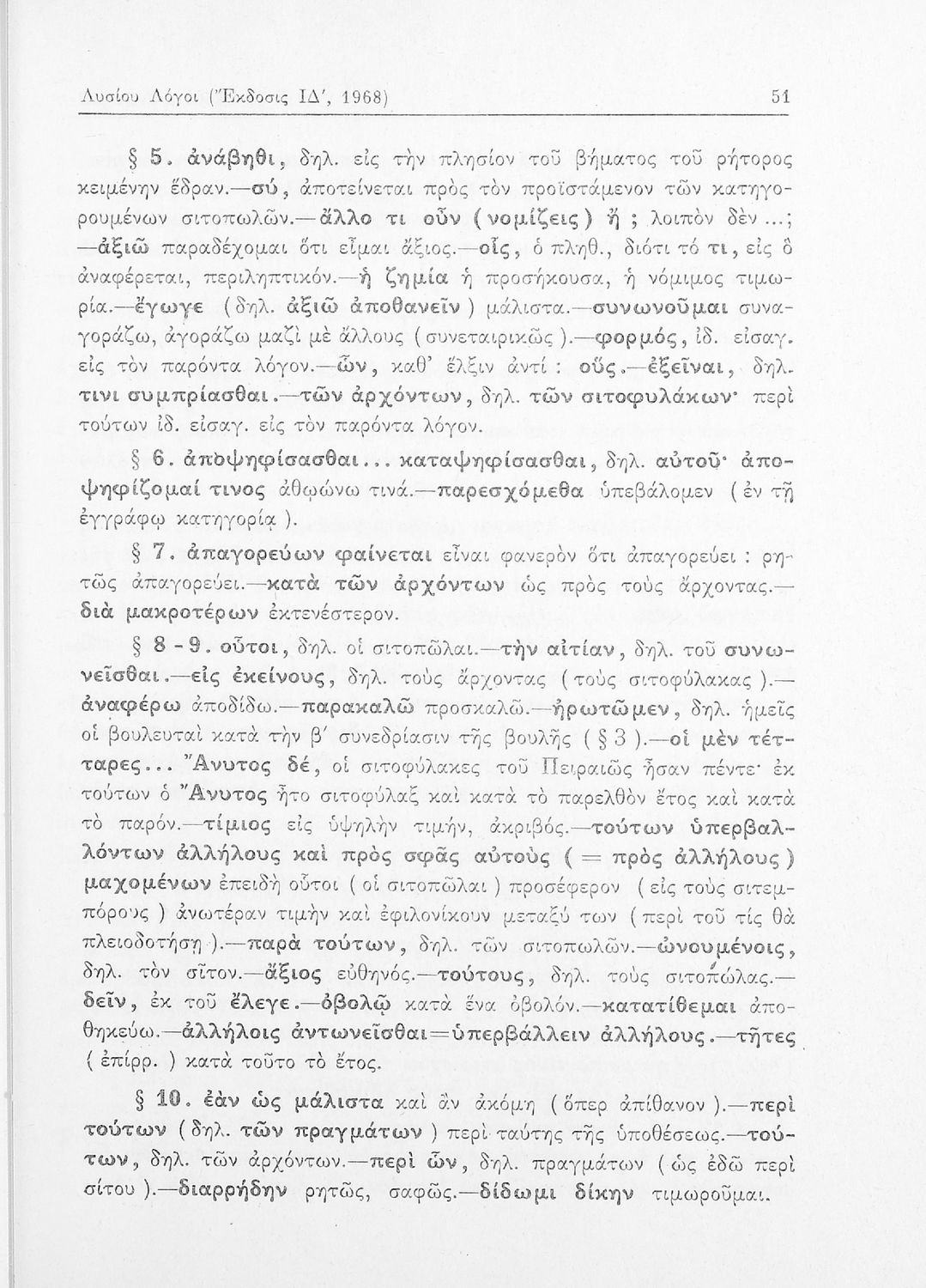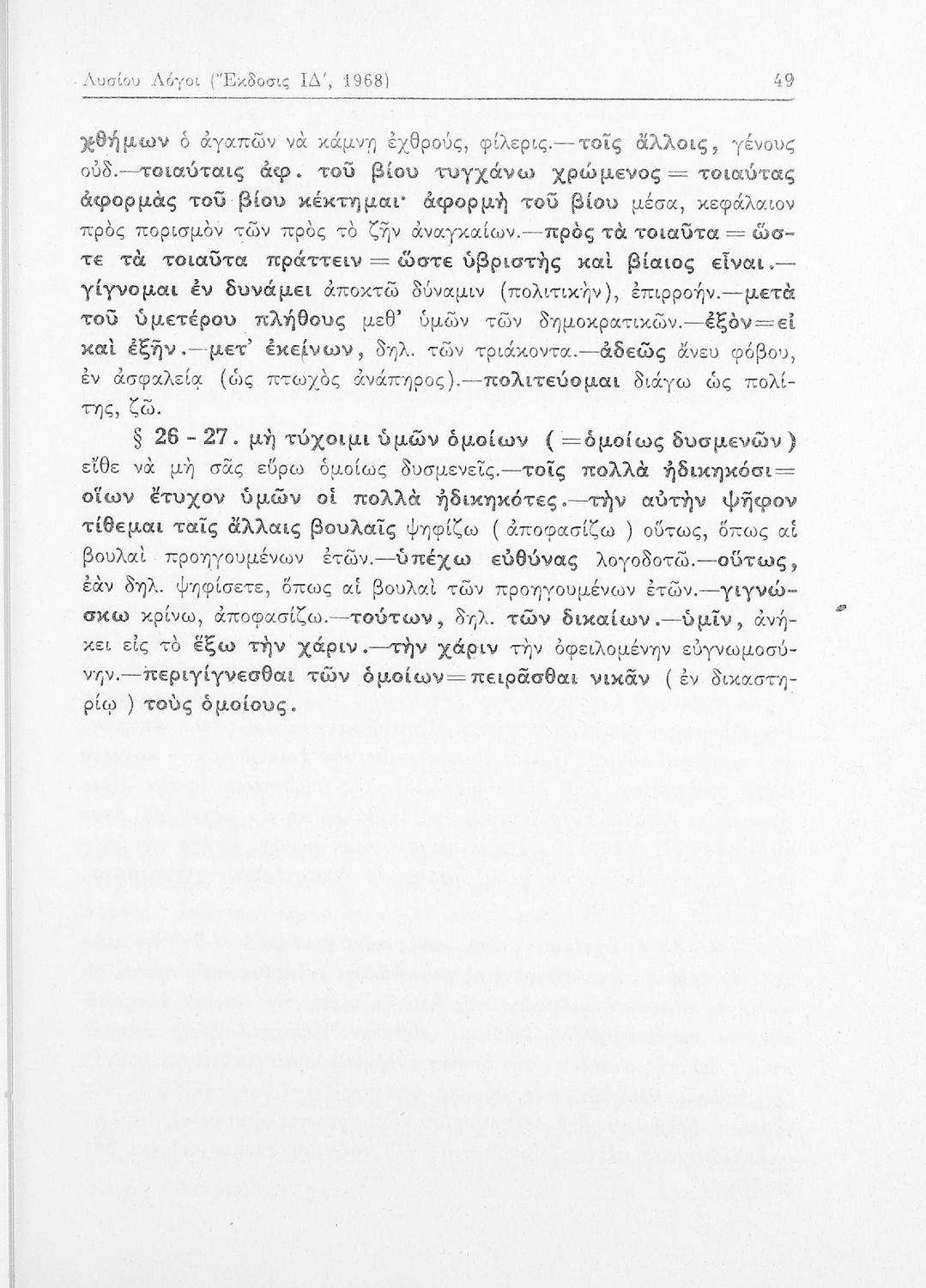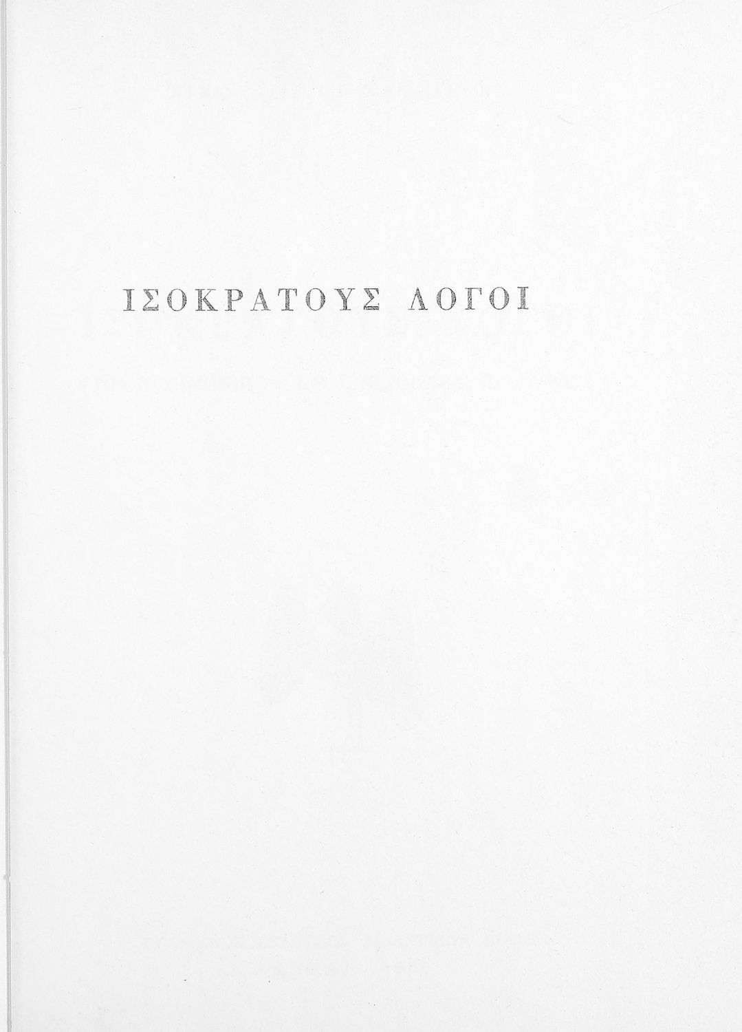 Σχολικό εγχειρίδιο Αρχαίων Ελληνικών που περιλαμβάνει τους Λόγους του Λυσία Περί του σηκού απολογία, Υπέρ του αδυνάτου, και Κατά των σιτοπωλών και του Ισοκράτη Προς Δημόνικον, Προς Νικοκλέα και Ευαγόρας, εισαγωγή στους Λόγους και ερμηνευτικά σχόλια. Φέρει το σύμβολο της δικτατορίας.