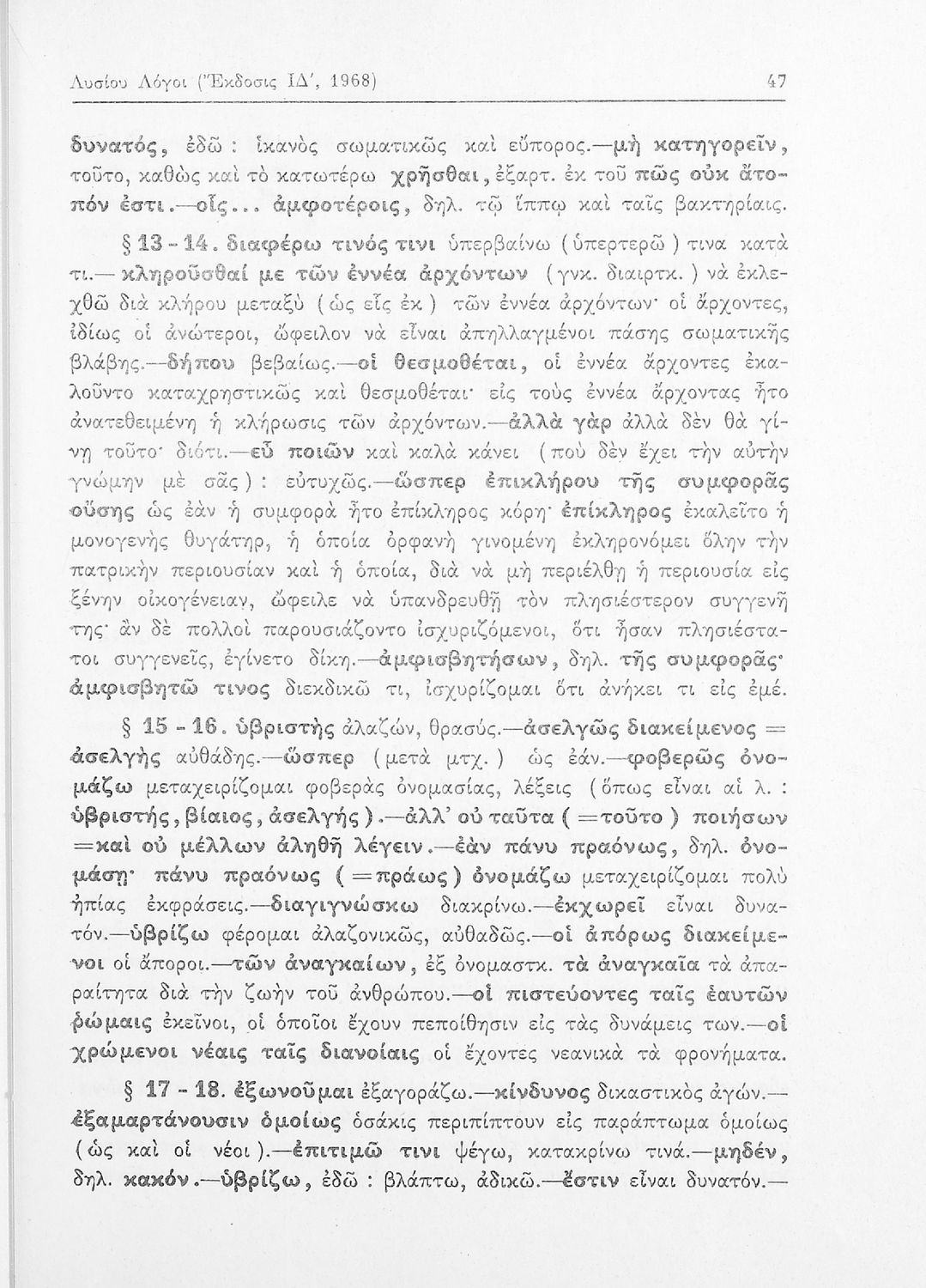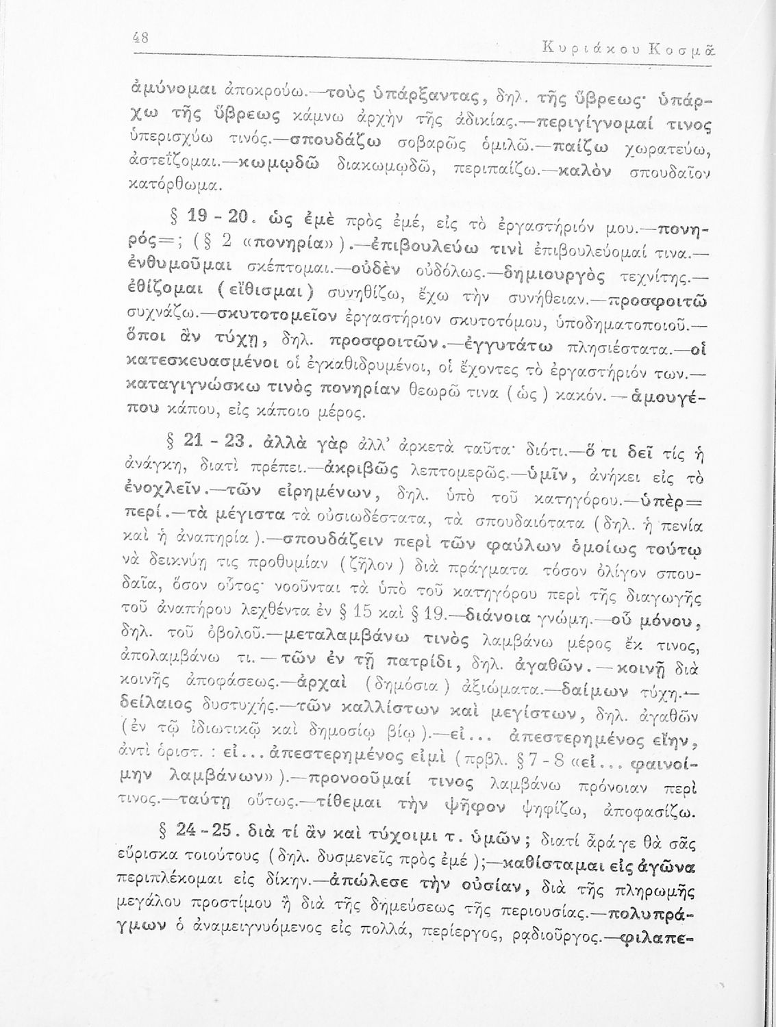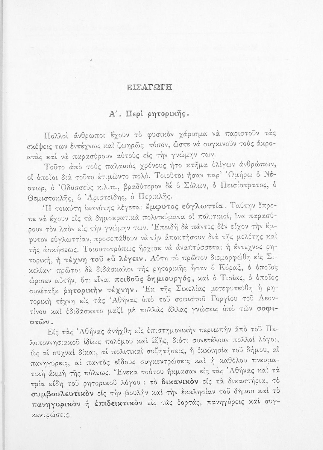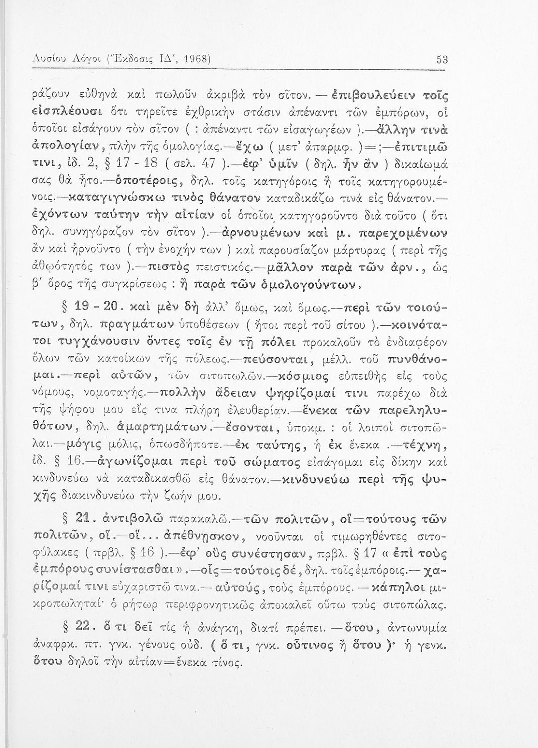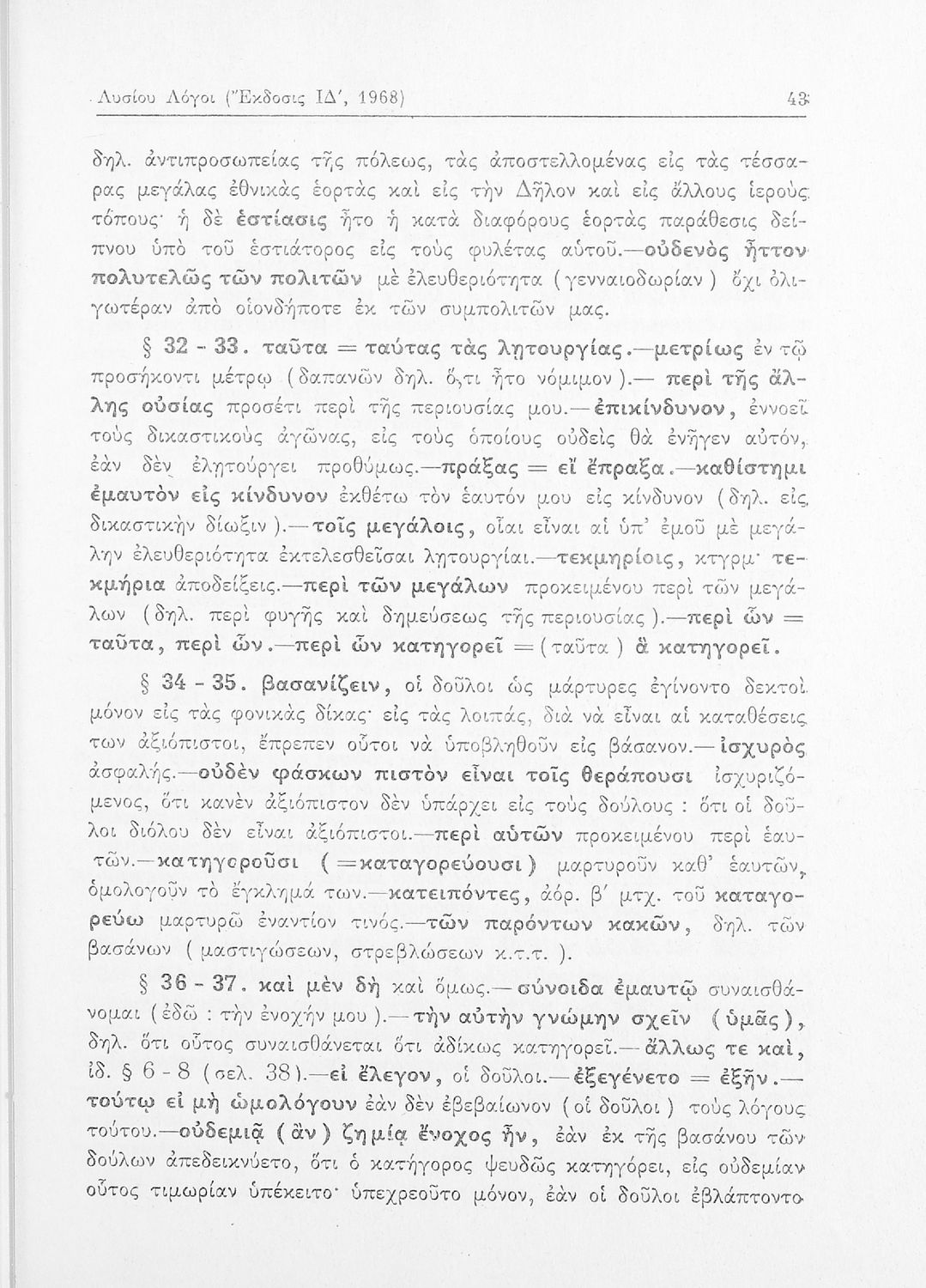 Σχολικό εγχειρίδιο Αρχαίων Ελληνικών που περιλαμβάνει τους Λόγους του Λυσία Περί του σηκού απολογία, Υπέρ του αδυνάτου, και Κατά των σιτοπωλών και του Ισοκράτη Προς Δημόνικον, Προς Νικοκλέα και Ευαγόρας, εισαγωγή στους Λόγους και ερμηνευτικά σχόλια. Φέρει το σύμβολο της δικτατορίας.