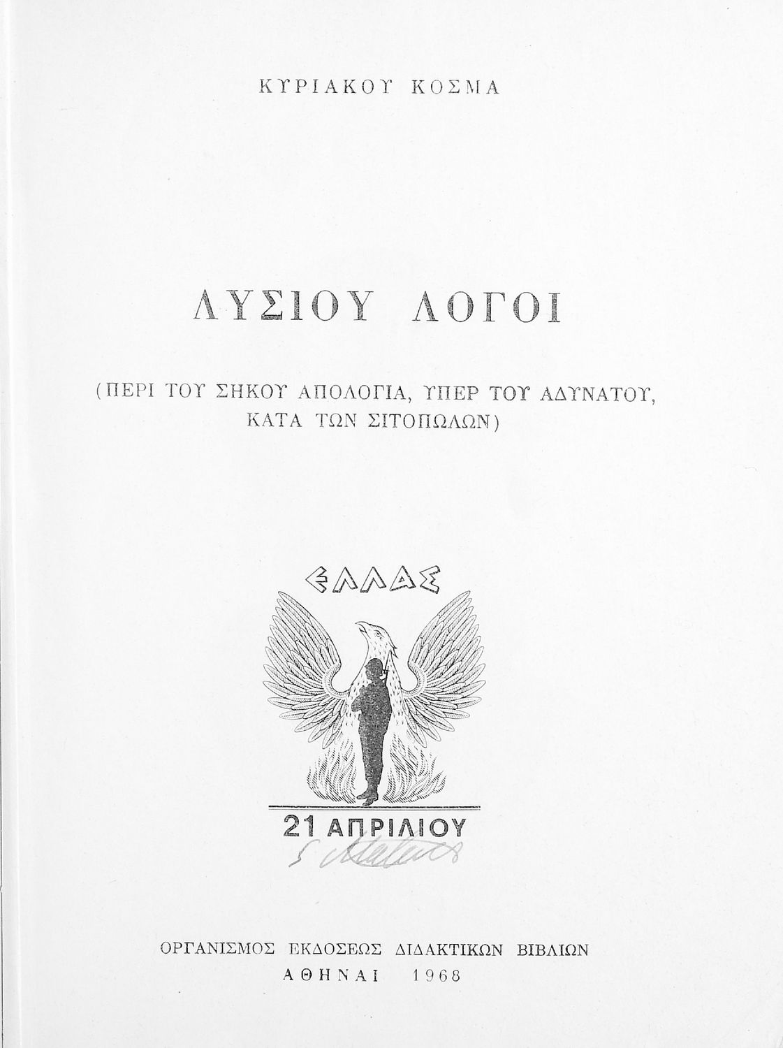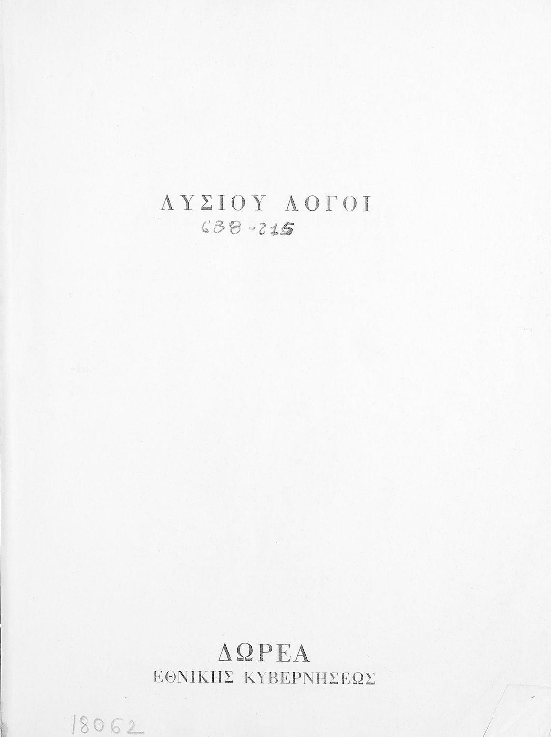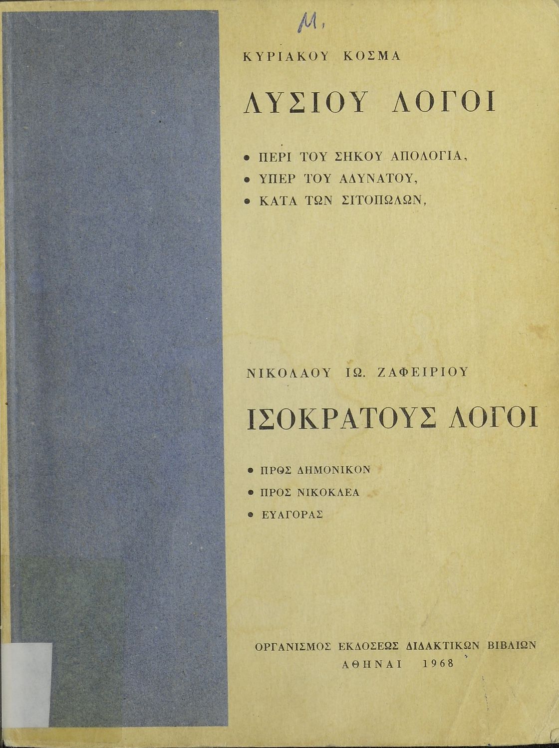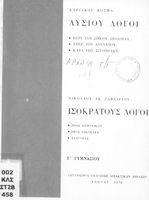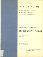 Σχολικό εγχειρίδιο Αρχαίων Ελληνικών που περιλαμβάνει τους Λόγους του Λυσία Περί του σηκού απολογία, Υπέρ του αδυνάτου, και Κατά των σιτοπωλών και του Ισοκράτη Προς Δημόνικον, Προς Νικοκλέα και Ευαγόρας, εισαγωγή στους Λόγους και ερμηνευτικά σχόλια. Φέρει το σύμβολο της δικτατορίας.