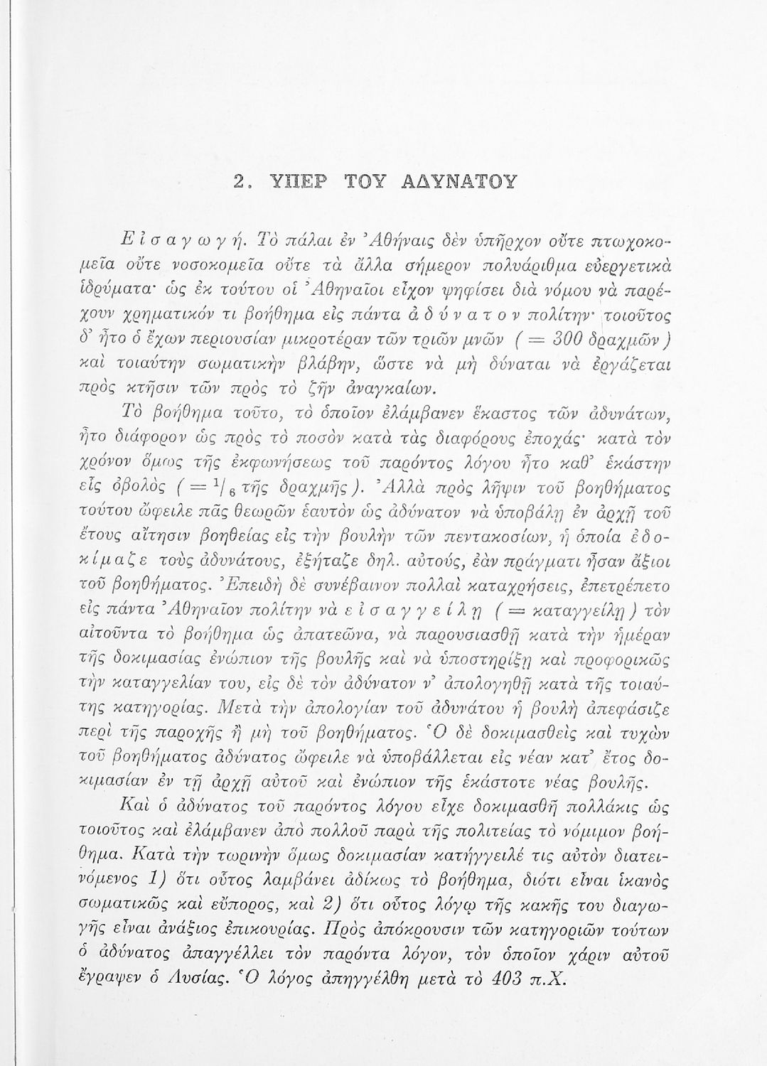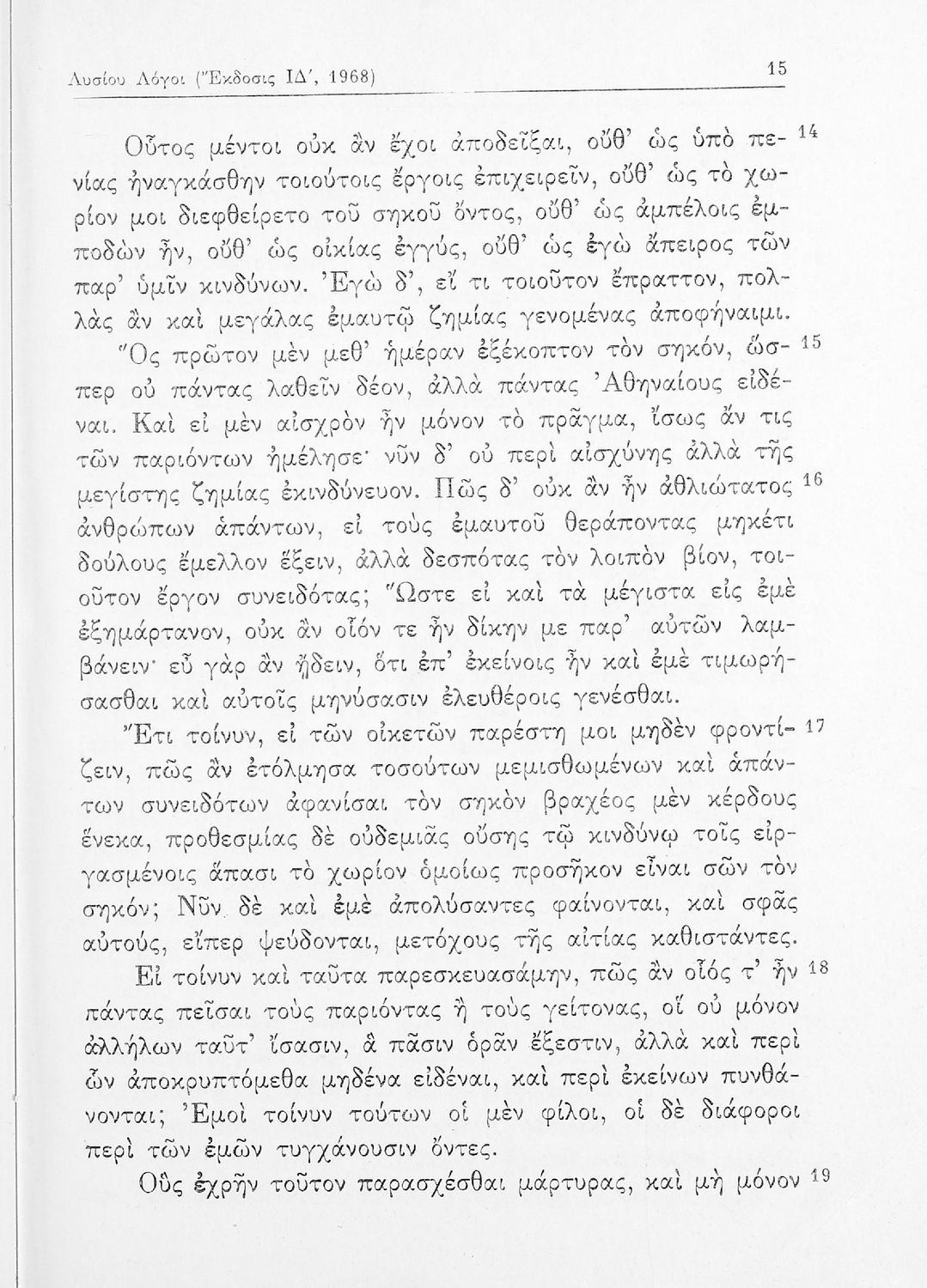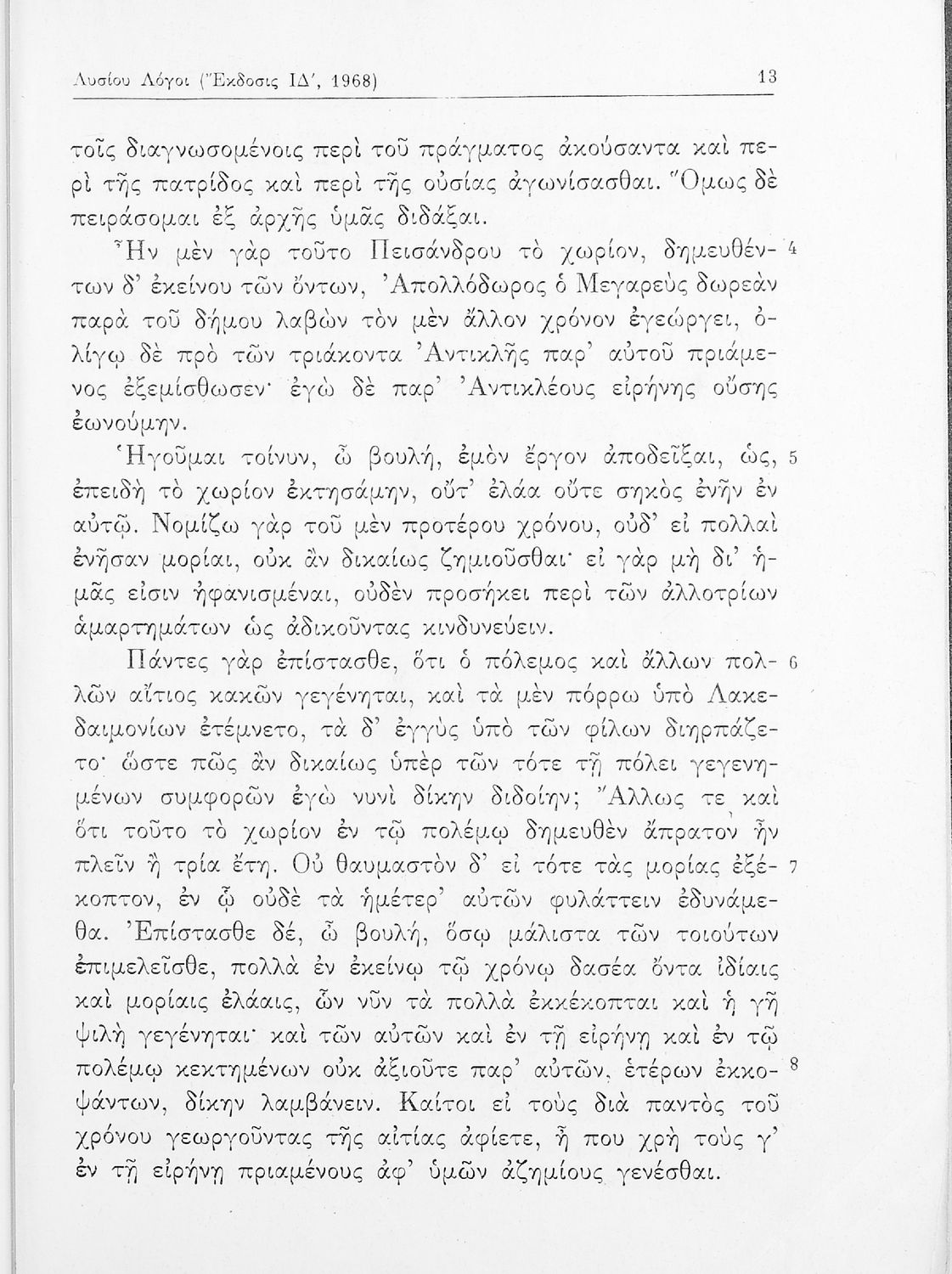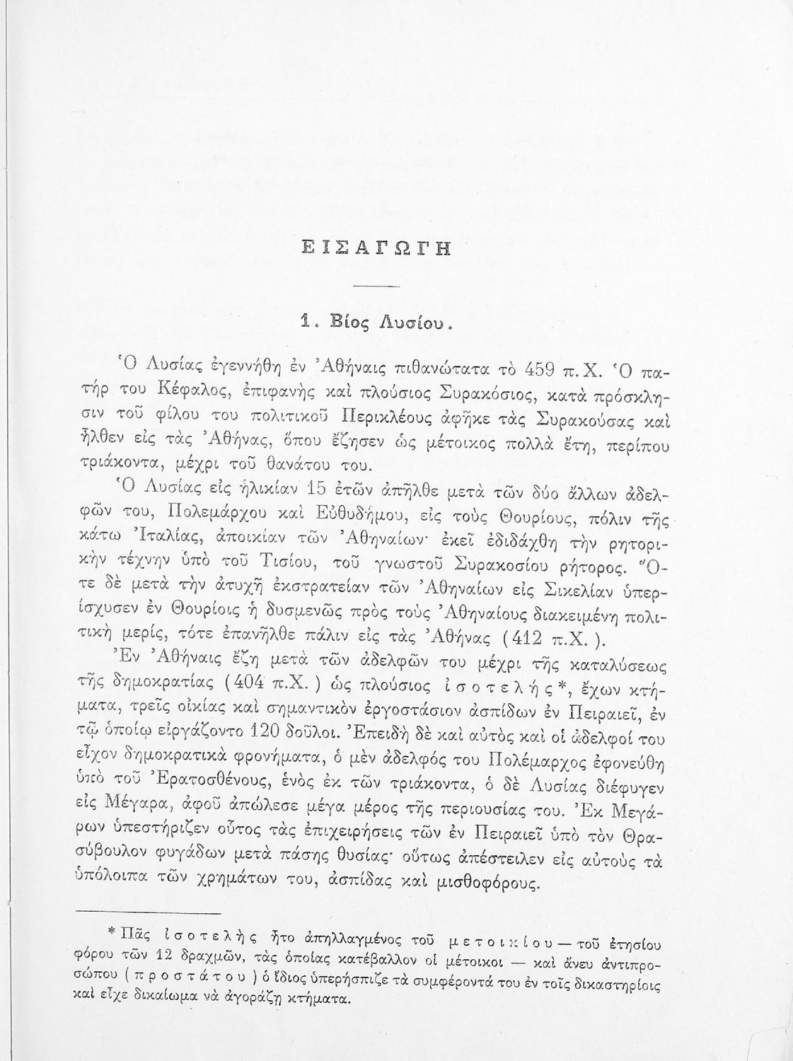 Σχολικό εγχειρίδιο Αρχαίων Ελληνικών που περιλαμβάνει τους Λόγους του Λυσία Περί του σηκού απολογία, Υπέρ του αδυνάτου, και Κατά των σιτοπωλών και του Ισοκράτη Προς Δημόνικον, Προς Νικοκλέα και Ευαγόρας, εισαγωγή στους Λόγους και ερμηνευτικά σχόλια. Φέρει το σύμβολο της δικτατορίας.