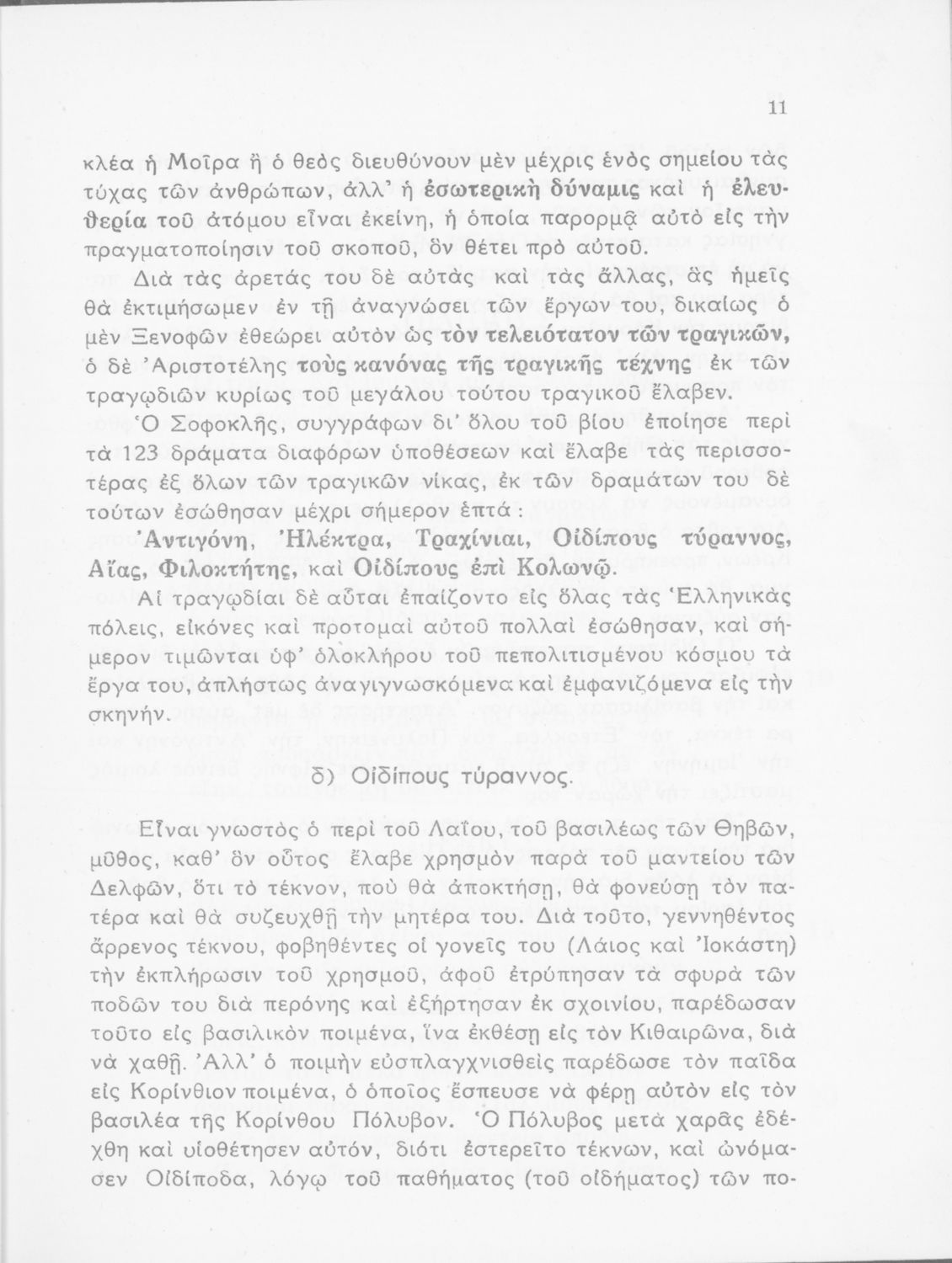 Σχολικό εγχειρίδιο Αρχαίων Ελληνικών που περιλαμβάνει τις τραγωδίες του Σοφοκλή Οιδίπους Τύραννος και Αντιγόνη, εισαγωγή και ερμηνευτικά σχόλια.