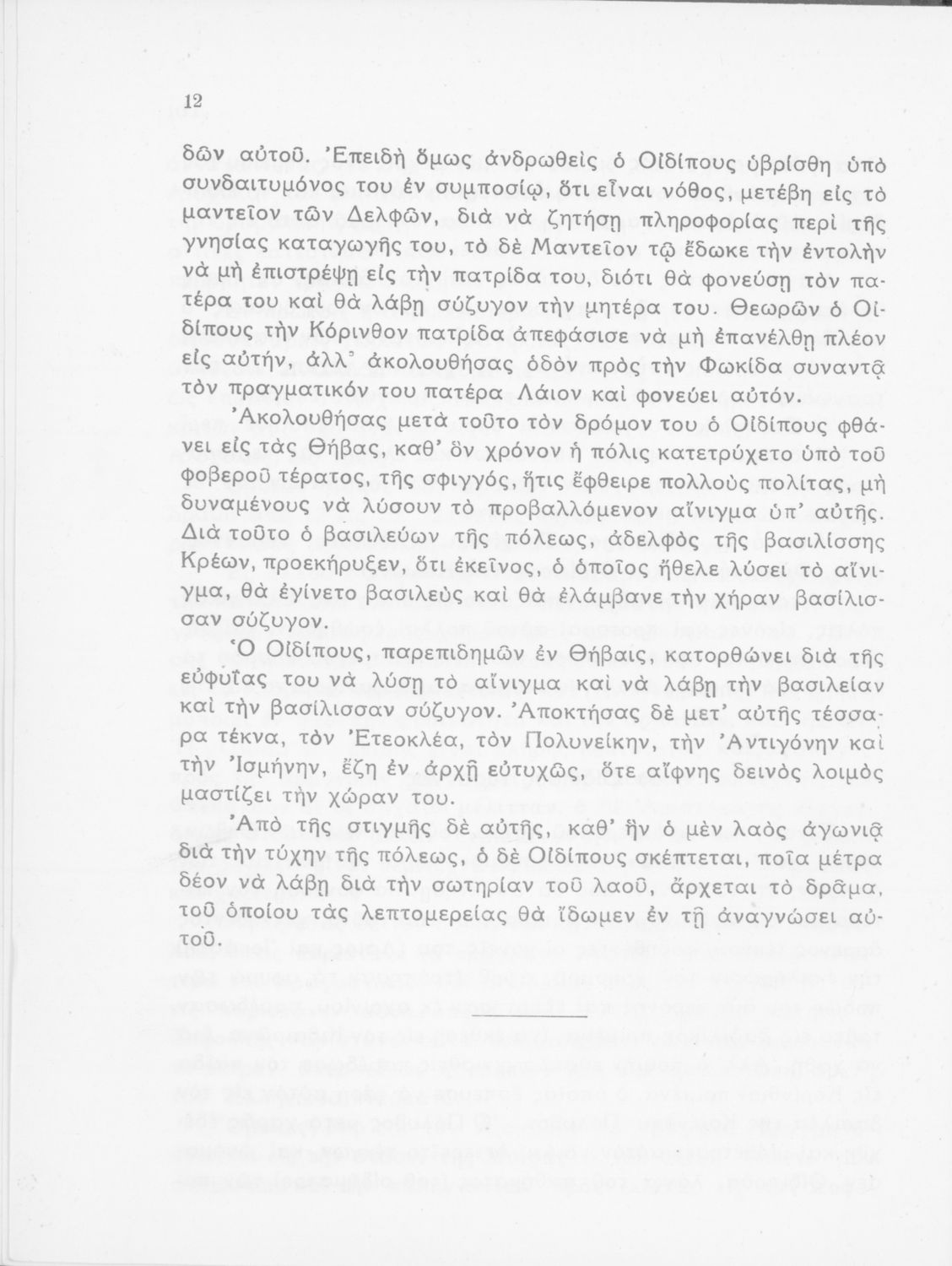 Σχολικό εγχειρίδιο του Γυμνασίου για το μάθημα των Αρχαίων Ελληνικών που περιέχει την τραγωδία του Σοφοκλή Οιδίπους Τύραννος, ερμηνευτικά και πραγματολογικά σχόλια και λεξιλογικές παρατηρήσεις.