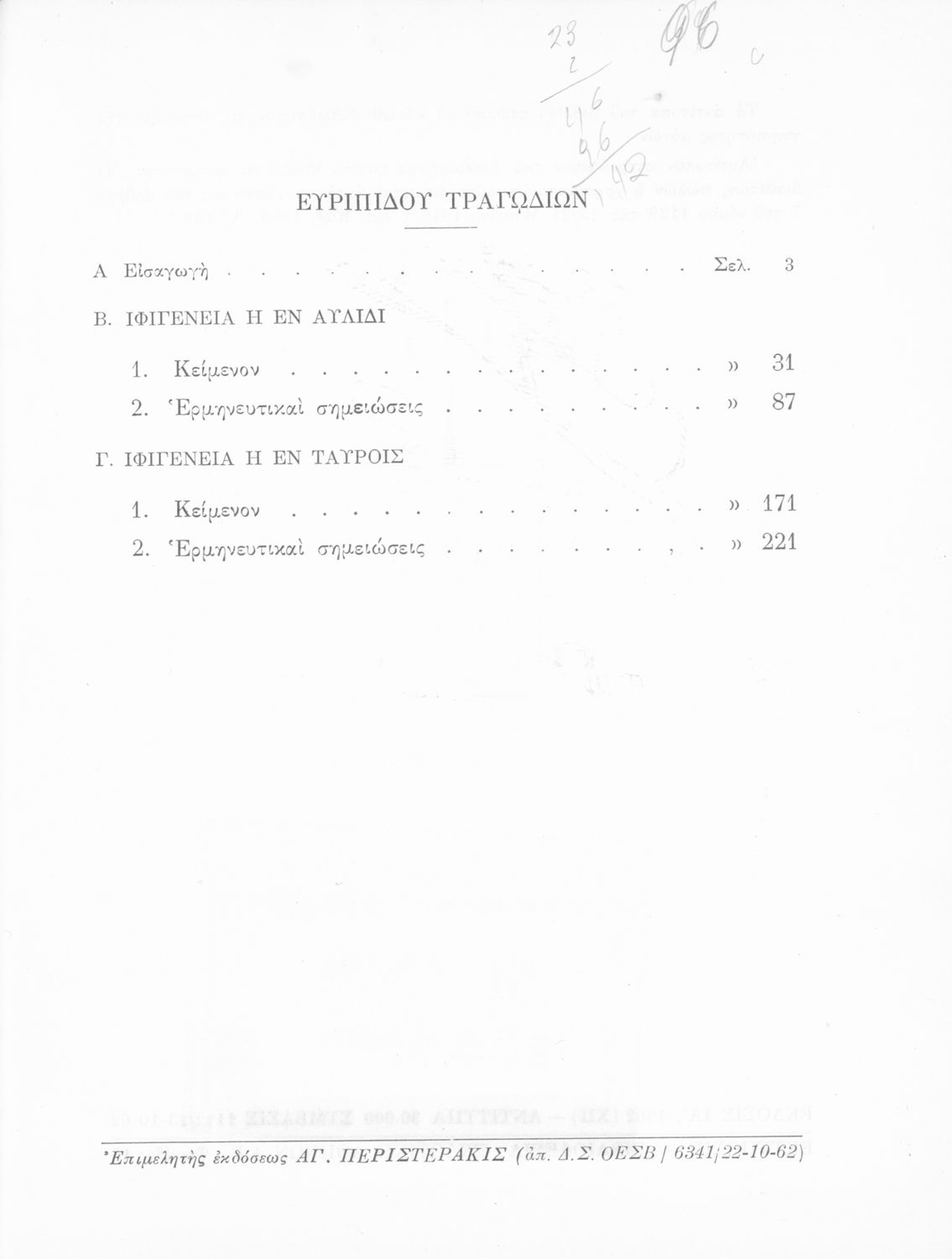 Τίτλος: Ευριπίδου Τραγωδίαι Ιφιγένεια η εν Αυλίδι Ιφιγένεια η εν Ταύροις δια την Ε΄ τάξιν των Γυμνασίων