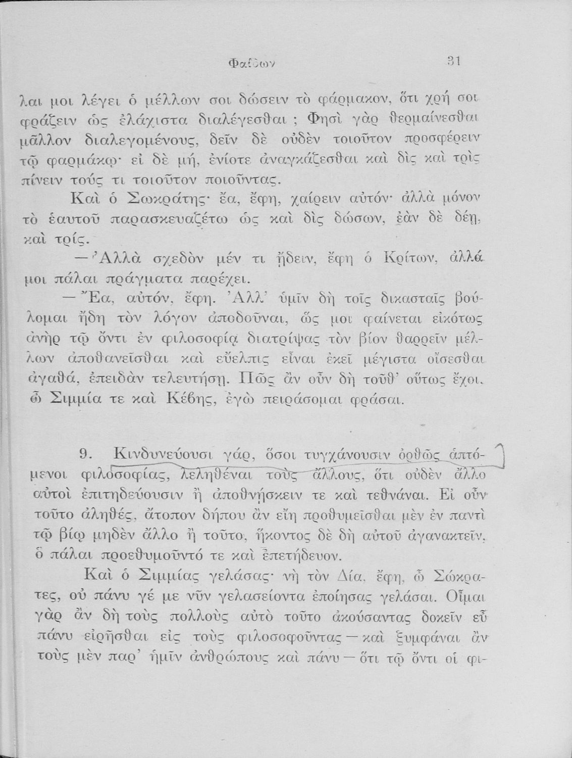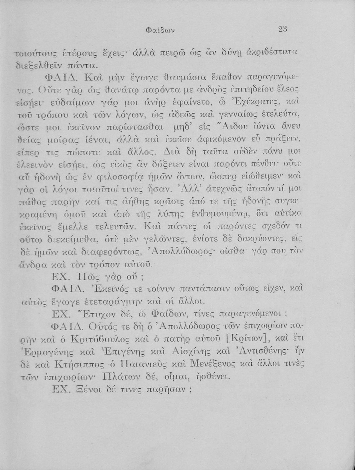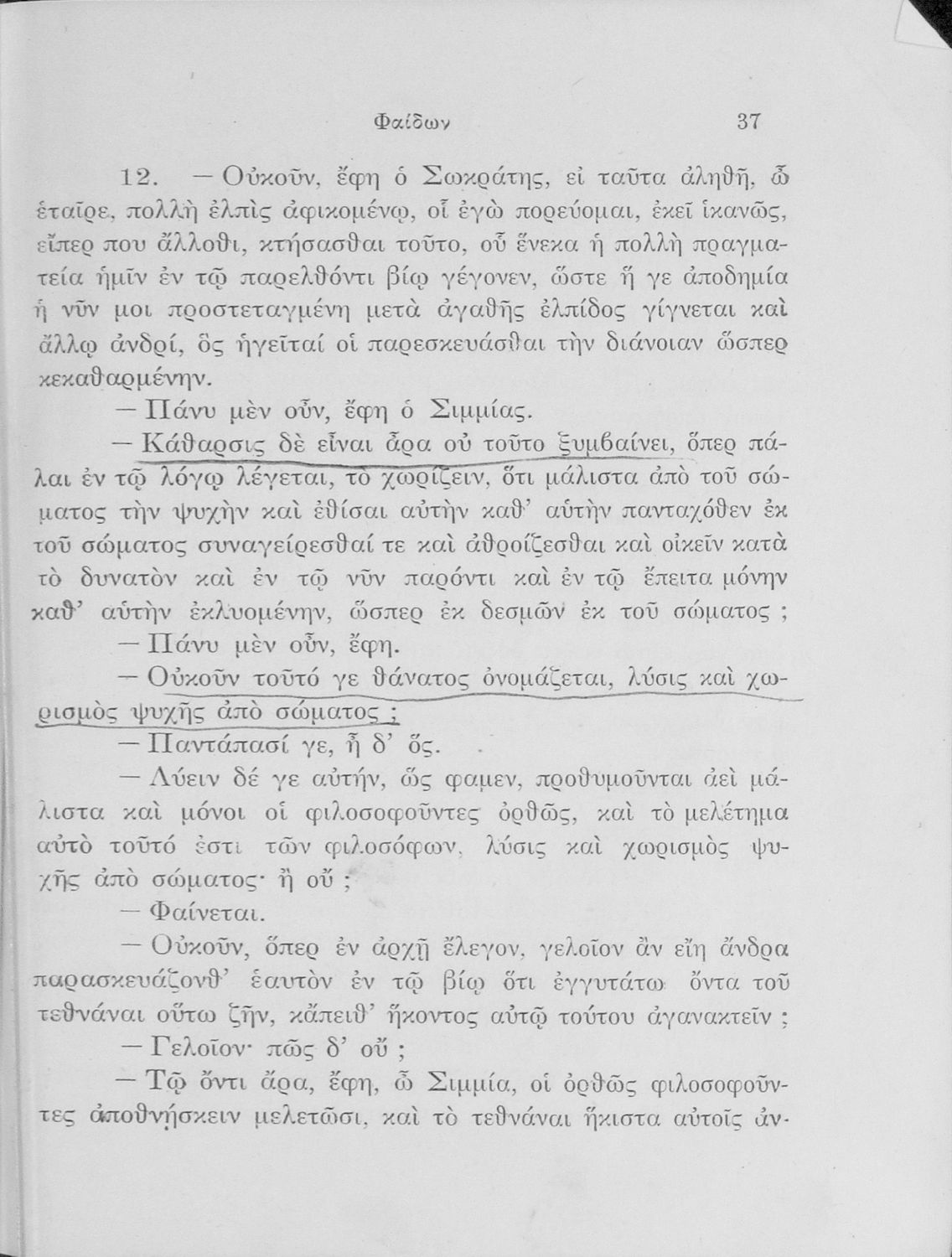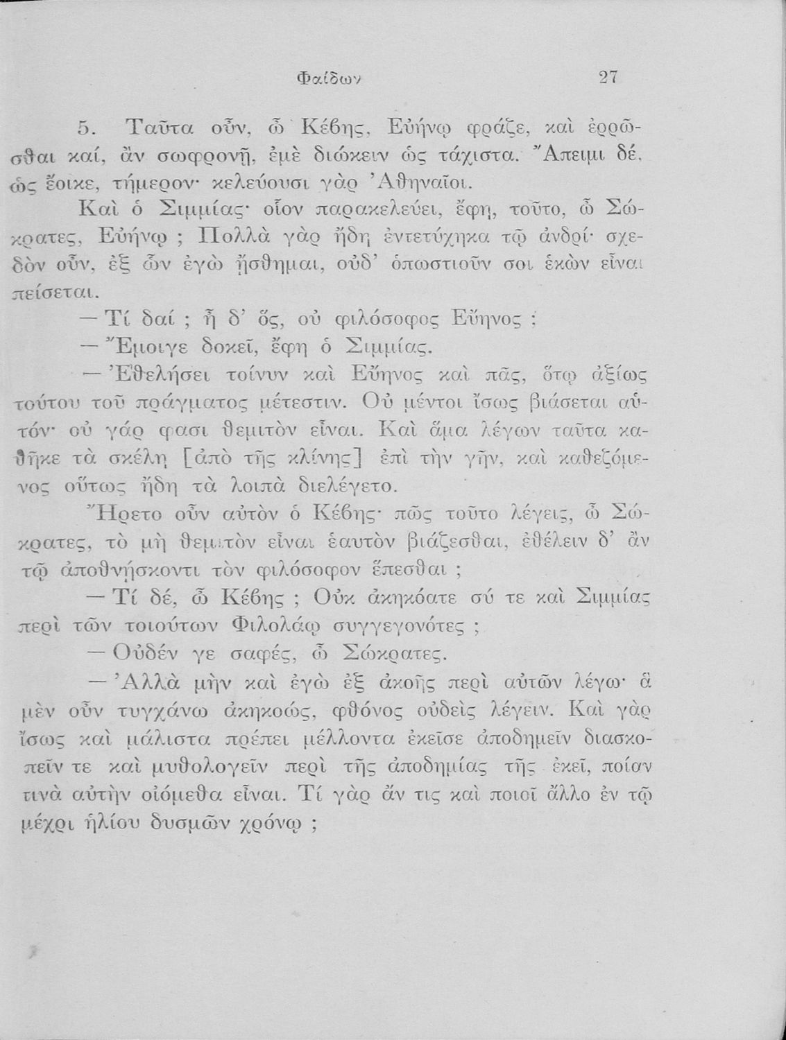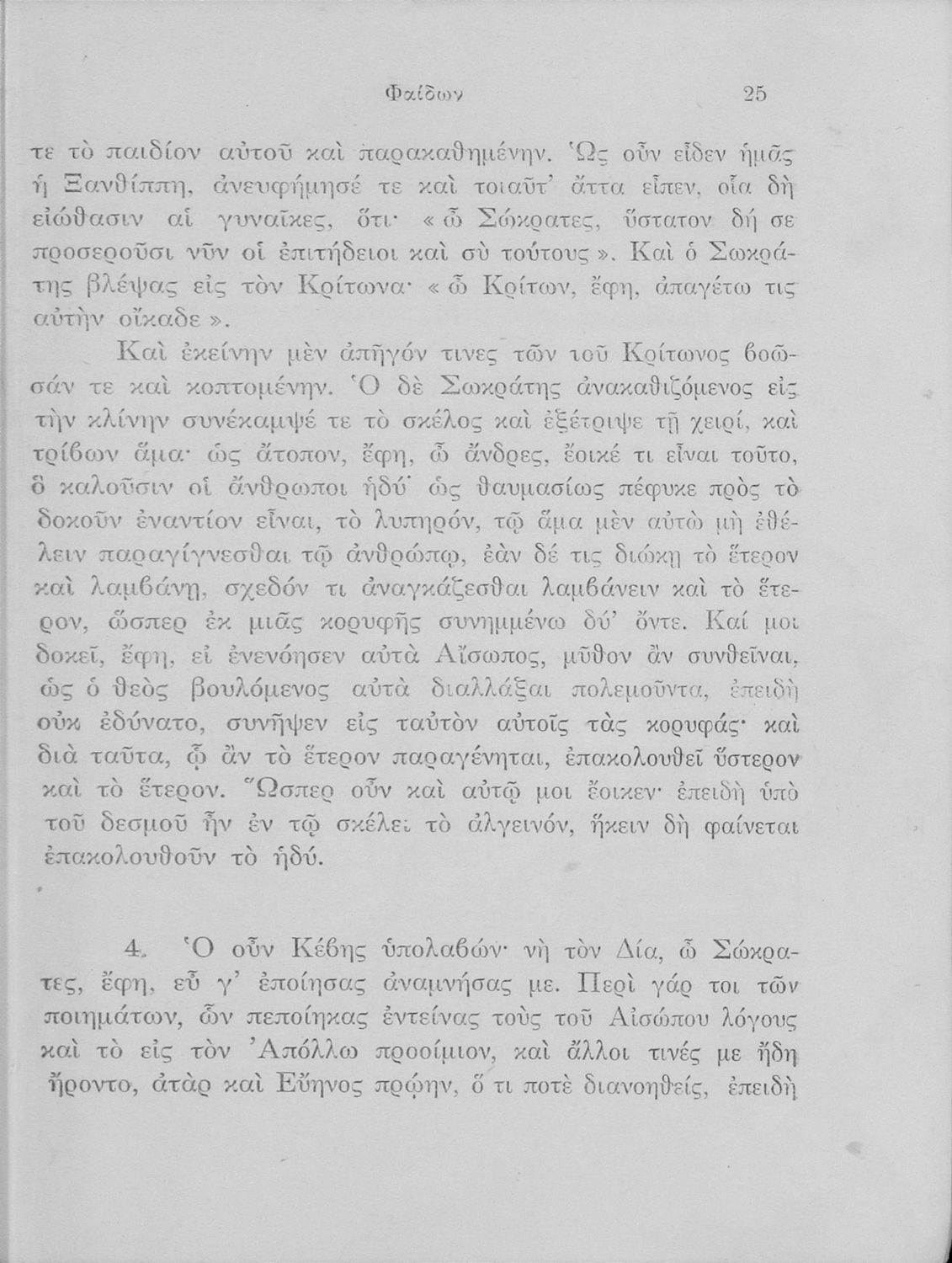 Σχολικό εγχειρίδιο Αρχαίων Ελληνικών. Το βιβλίο περιλαμβάνει εισαγωγή σχετικά με τη ζωή και το έργο του Πλάτωνα και αναφέρεται σε φιλοσόφους της εποχής. Παραθέτεται το κείμενο "Φαίδων : Η περί ψυχής ηθικός" το οποίο περιλαμβάνει τα κεφάλαια από το 1 έως το 34. Ακολουθεί η περίληψη των κεφαλαίων 35 έως 63 και ολοκληρώνεται με τις ερμηνευτικές σημειώσεις.