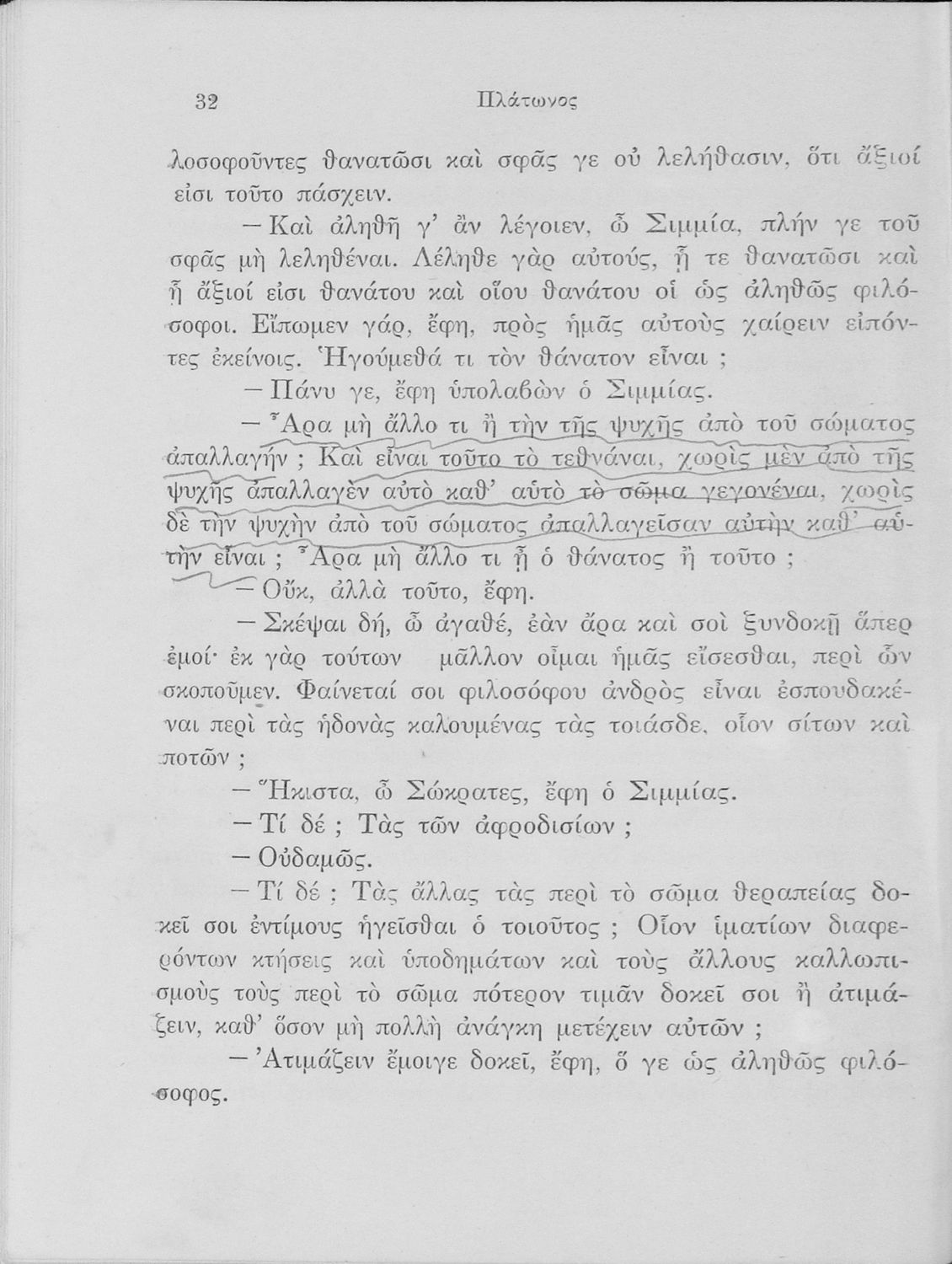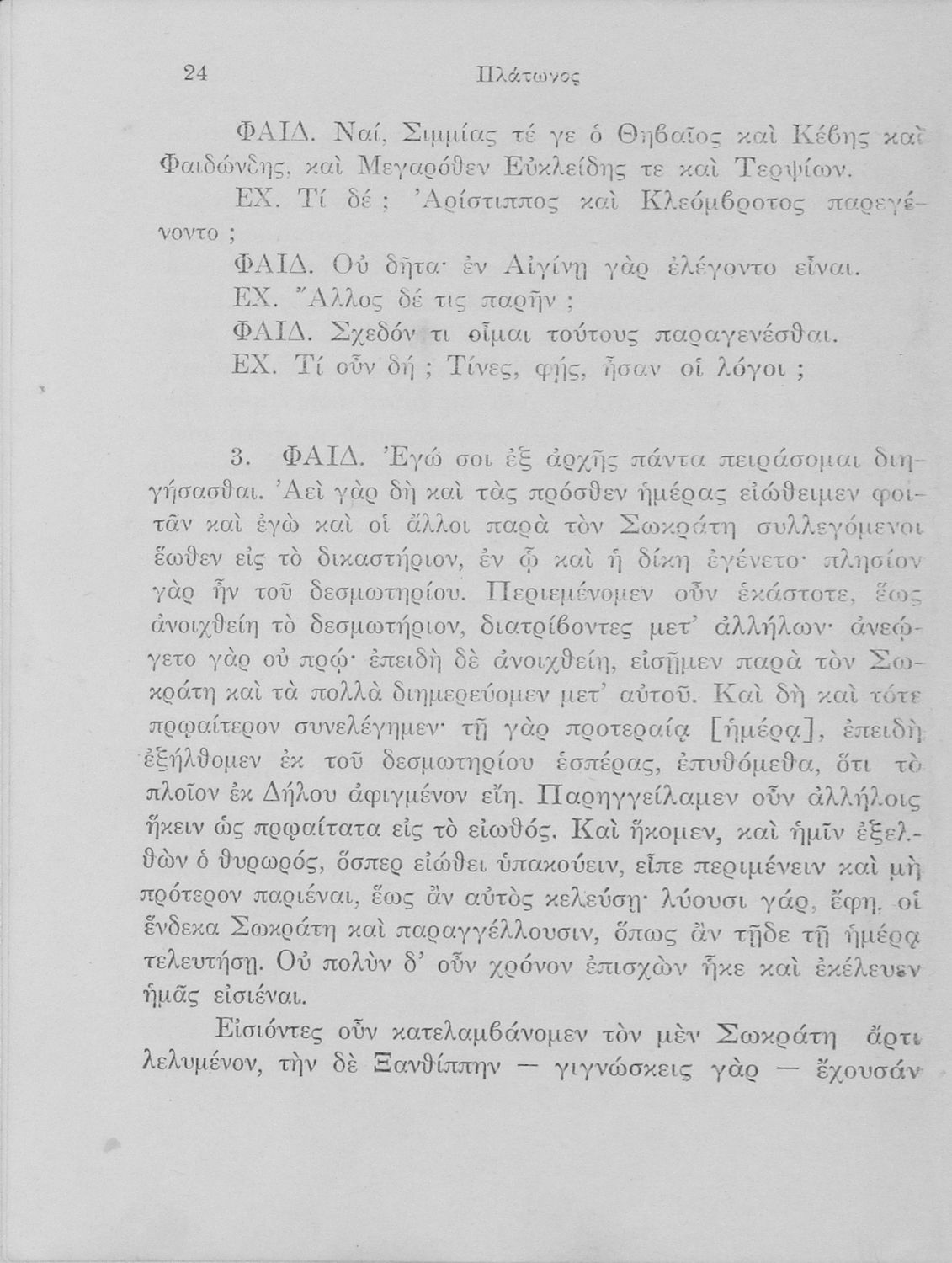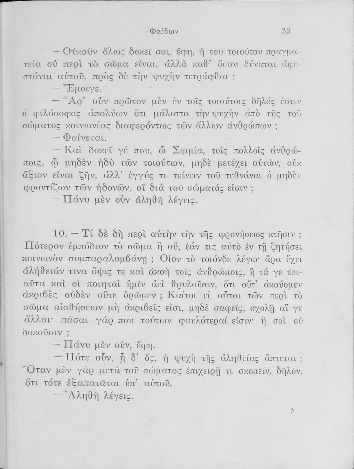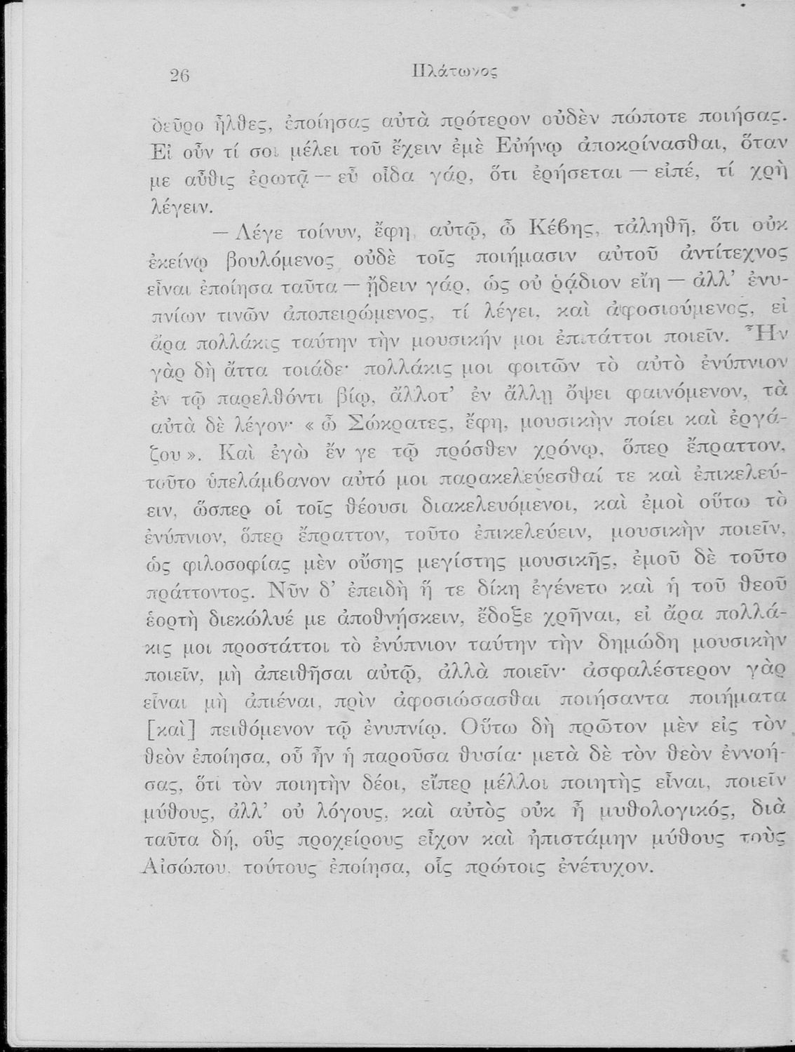 Σχολικό εγχειρίδιο Αρχαίων Ελληνικών. Το βιβλίο περιλαμβάνει εισαγωγή σχετικά με τη ζωή και το έργο του Πλάτωνα και αναφέρεται σε φιλοσόφους της εποχής. Παραθέτεται το κείμενο "Φαίδων : Η περί ψυχής ηθικός" το οποίο περιλαμβάνει τα κεφάλαια από το 1 έως το 34. Ακολουθεί η περίληψη των κεφαλαίων 35 έως 63 και ολοκληρώνεται με τις ερμηνευτικές σημειώσεις.