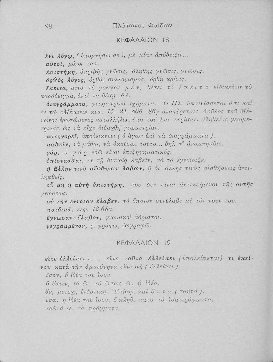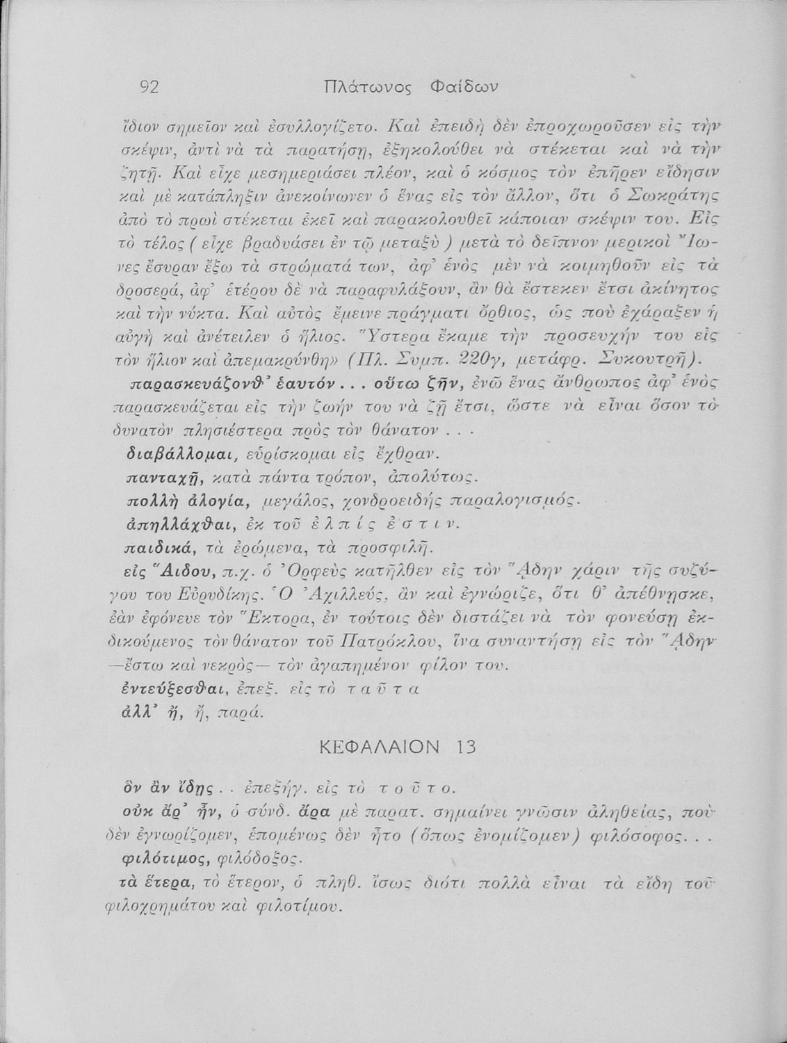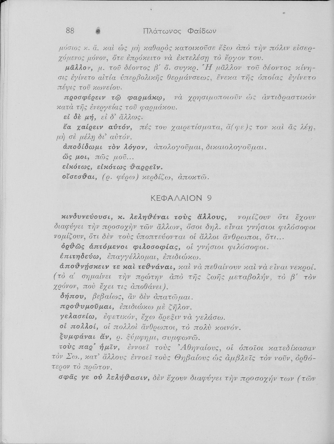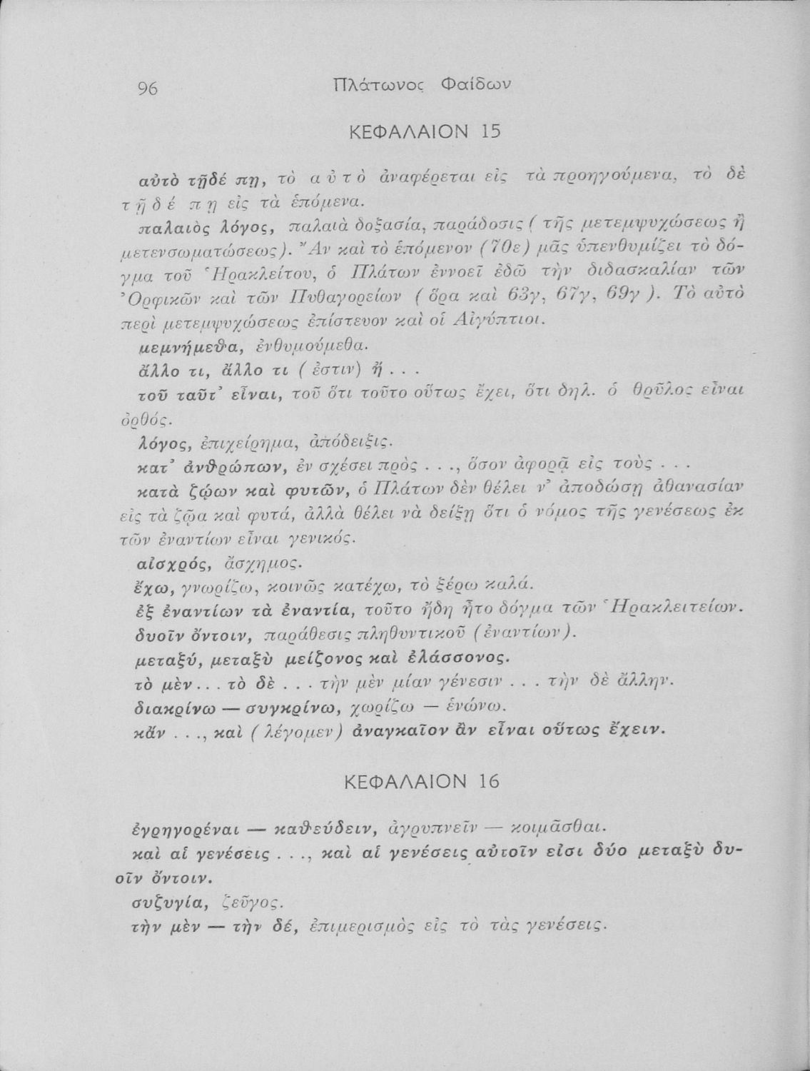 Σχολικό εγχειρίδιο Αρχαίων Ελληνικών. Το βιβλίο περιλαμβάνει εισαγωγή σχετικά με τη ζωή και το έργο του Πλάτωνα και αναφέρεται σε φιλοσόφους της εποχής. Παραθέτεται το κείμενο "Φαίδων : Η περί ψυχής ηθικός" το οποίο περιλαμβάνει τα κεφάλαια από το 1 έως το 34. Ακολουθεί η περίληψη των κεφαλαίων 35 έως 63 και ολοκληρώνεται με τις ερμηνευτικές σημειώσεις.