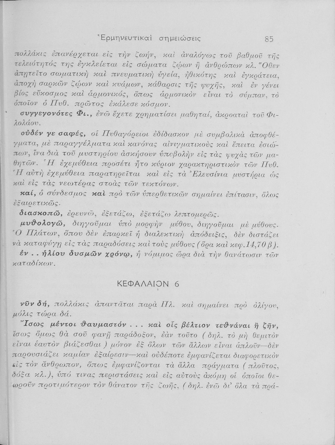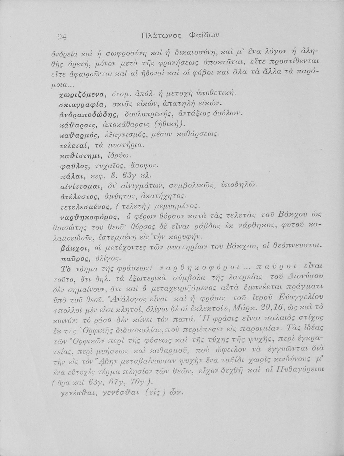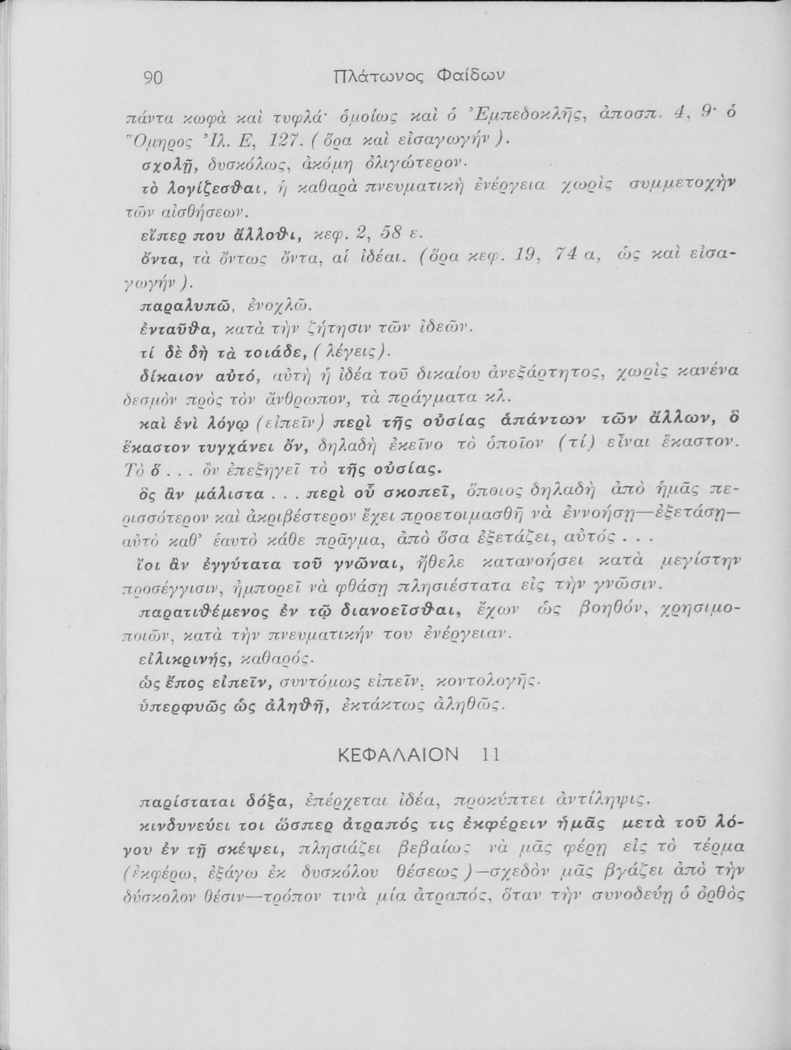 Σχολικό εγχειρίδιο Αρχαίων Ελληνικών. Το βιβλίο περιλαμβάνει εισαγωγή σχετικά με τη ζωή και το έργο του Πλάτωνα και αναφέρεται σε φιλοσόφους της εποχής. Παραθέτεται το κείμενο "Φαίδων : Η περί ψυχής ηθικός" το οποίο περιλαμβάνει τα κεφάλαια από το 1 έως το 34. Ακολουθεί η περίληψη των κεφαλαίων 35 έως 63 και ολοκληρώνεται με τις ερμηνευτικές σημειώσεις.