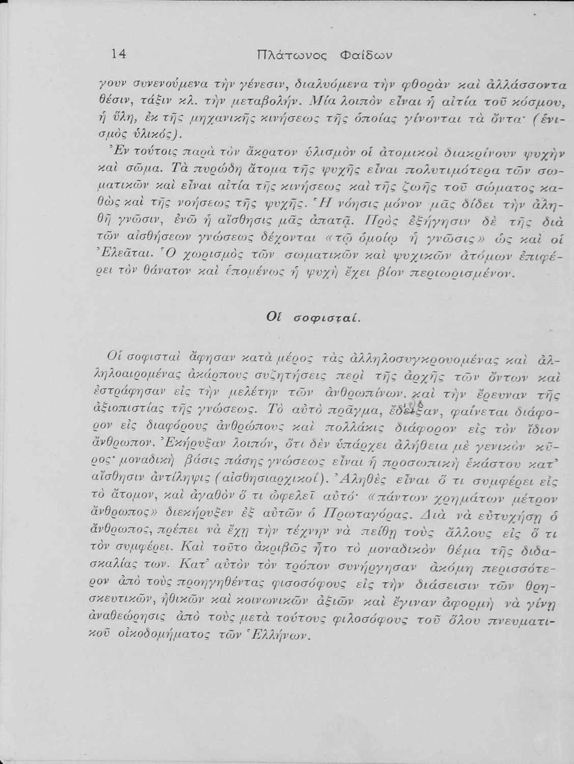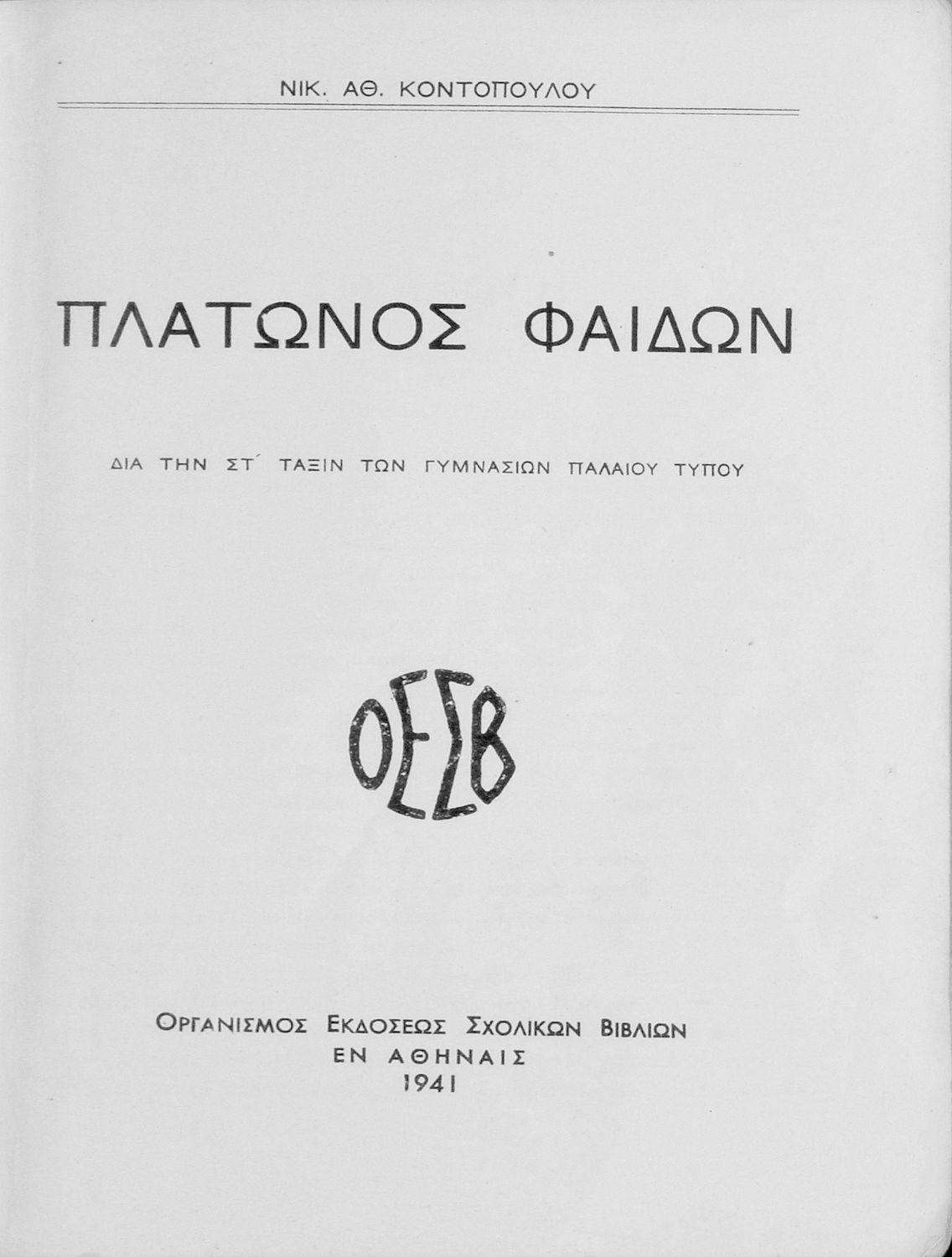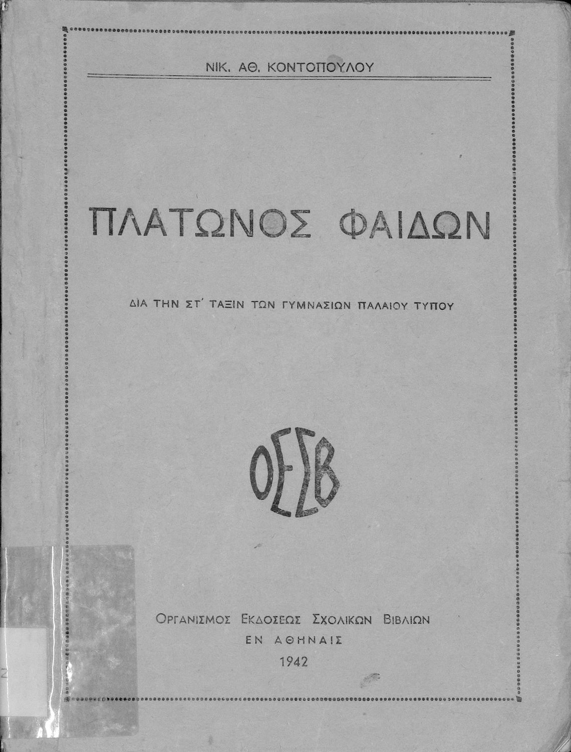 Σχολικό εγχειρίδιο Αρχαίων Ελληνικών. Το βιβλίο περιλαμβάνει εισαγωγή σχετικά με τη ζωή και το έργο του Πλάτωνα και αναφέρεται σε φιλοσόφους της εποχής. Παραθέτεται το κείμενο "Φαίδων : Η περί ψυχής ηθικός" το οποίο περιλαμβάνει τα κεφάλαια από το 1 έως το 34. Ακολουθεί η περίληψη των κεφαλαίων 35 έως 63 και ολοκληρώνεται με τις ερμηνευτικές σημειώσεις.