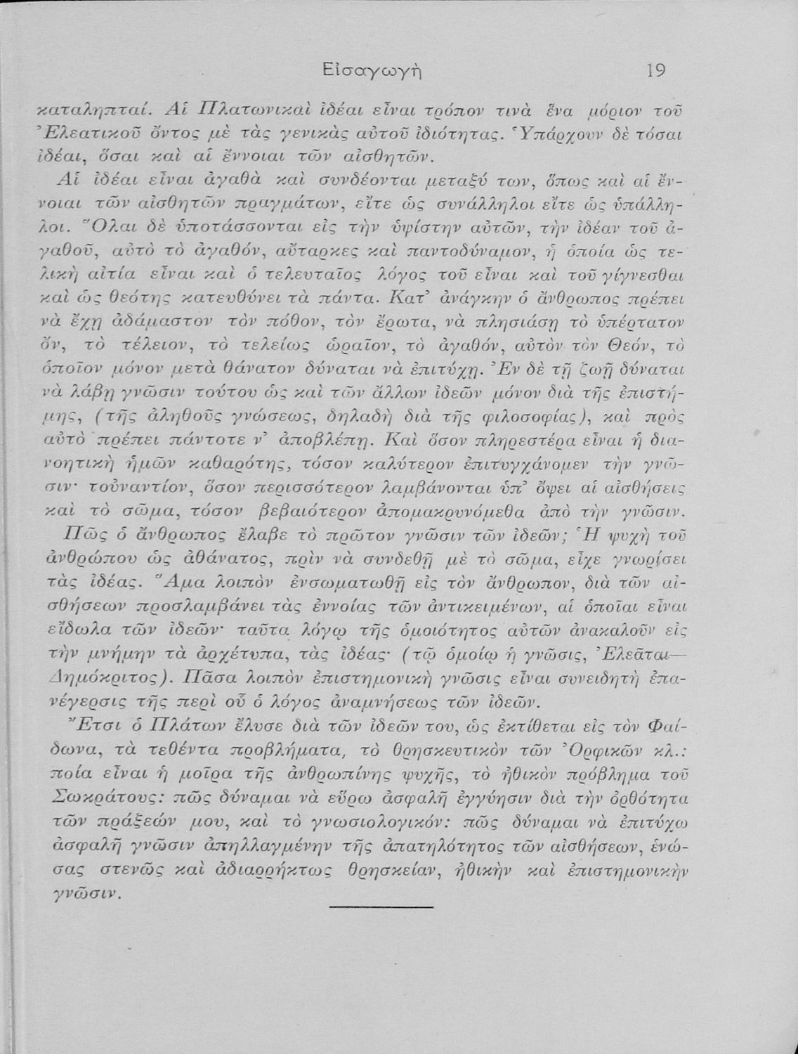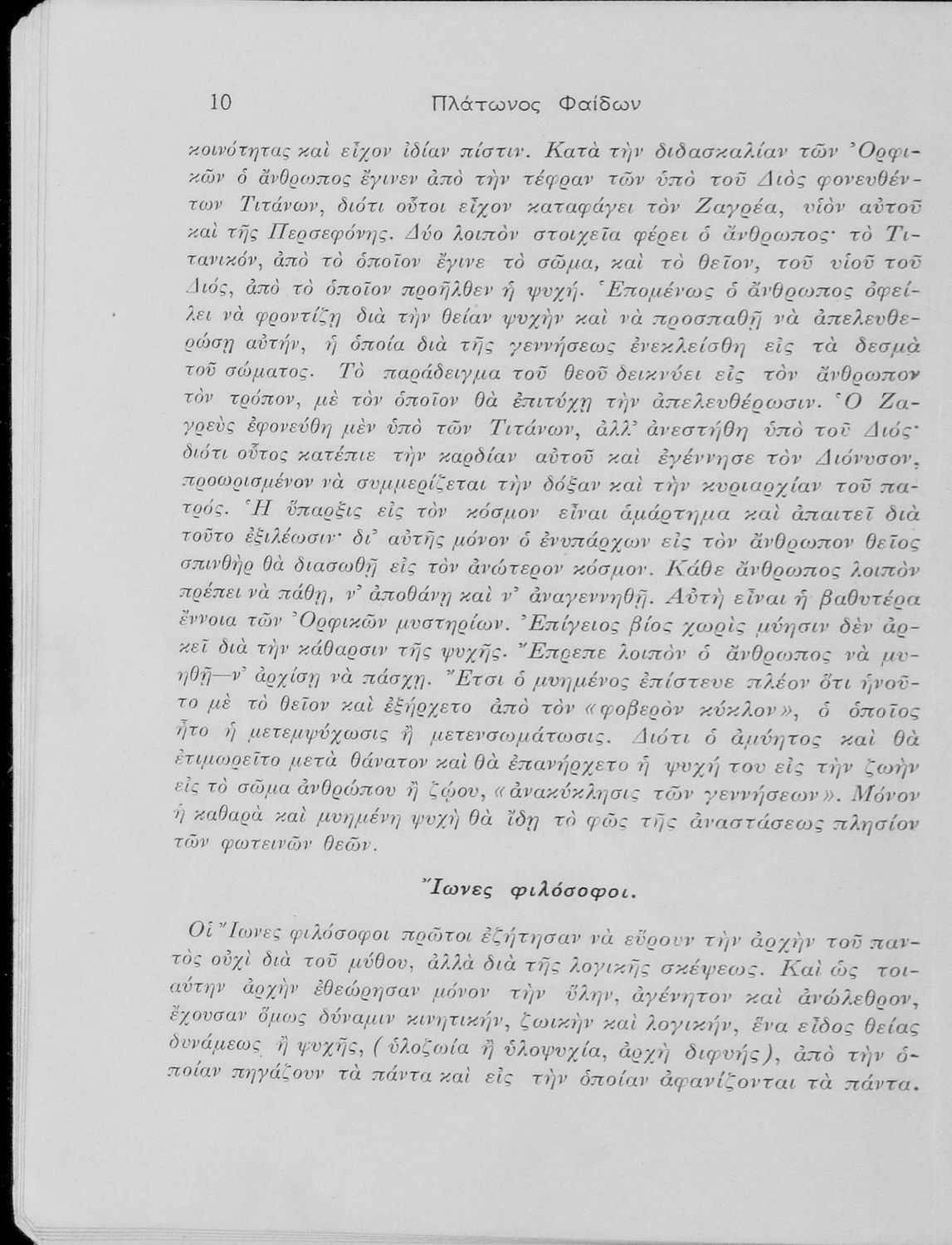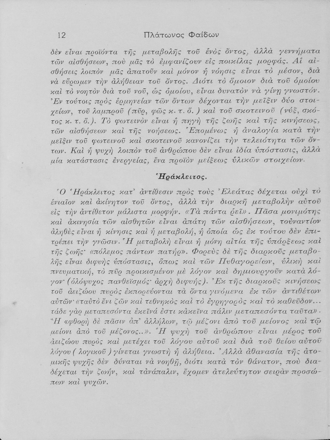 Σχολικό εγχειρίδιο Αρχαίων Ελληνικών. Το βιβλίο περιλαμβάνει εισαγωγή σχετικά με τη ζωή και το έργο του Πλάτωνα και αναφέρεται σε φιλοσόφους της εποχής. Παραθέτεται το κείμενο "Φαίδων : Η περί ψυχής ηθικός" το οποίο περιλαμβάνει τα κεφάλαια από το 1 έως το 34. Ακολουθεί η περίληψη των κεφαλαίων 35 έως 63 και ολοκληρώνεται με τις ερμηνευτικές σημειώσεις.