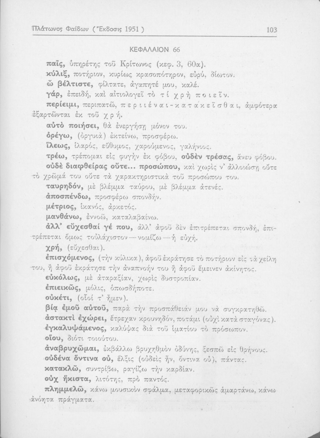 Σχολικό εγχειρίδιο της ΣΤ΄ Γυμνασίου για το μάθημα των Αρχαίων Ελληνικών. Περιέχει αποσπάσματα του αρχαίου κειμένου από το έργο του Πλάτωνα, Φαίδων. Επίσης, περιλαμβάνει λεξιλογικές παρατηρήσεις, ερμηνευτικά, πραγματολογικά σχόλια και γραμματικές παρατηρήσεις του συγγραφέα.