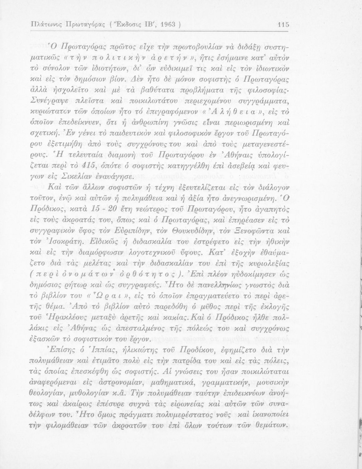 Σχολικό εγχειρίδιο Αρχαίων Ελληνικών για τη ΣΤ΄ τάξη των Εξαταξίων Γυμνασίων που περιλαμβάνει σύντομο βιογραφικό του Πλάτωνα, εισαγωγή στο έργο του, αποσπάσματα από τον Πρωταγόρα και ερμηνευτικές σημειώσεις.