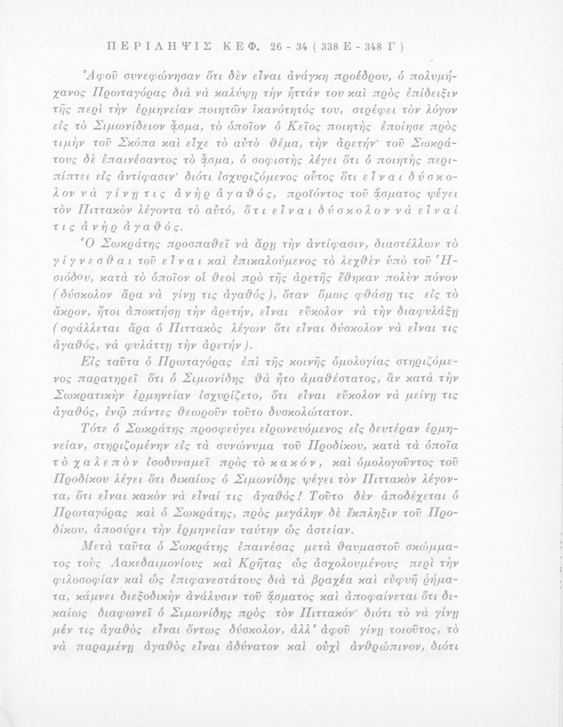 Σχολικό εγχειρίδιο Αρχαίων Ελληνικών για τη ΣΤ΄ τάξη των Εξαταξίων Γυμνασίων που περιλαμβάνει σύντομο βιογραφικό του Πλάτωνα, εισαγωγή στο έργο του, αποσπάσματα από τον Πρωταγόρα και ερμηνευτικές σημειώσεις.