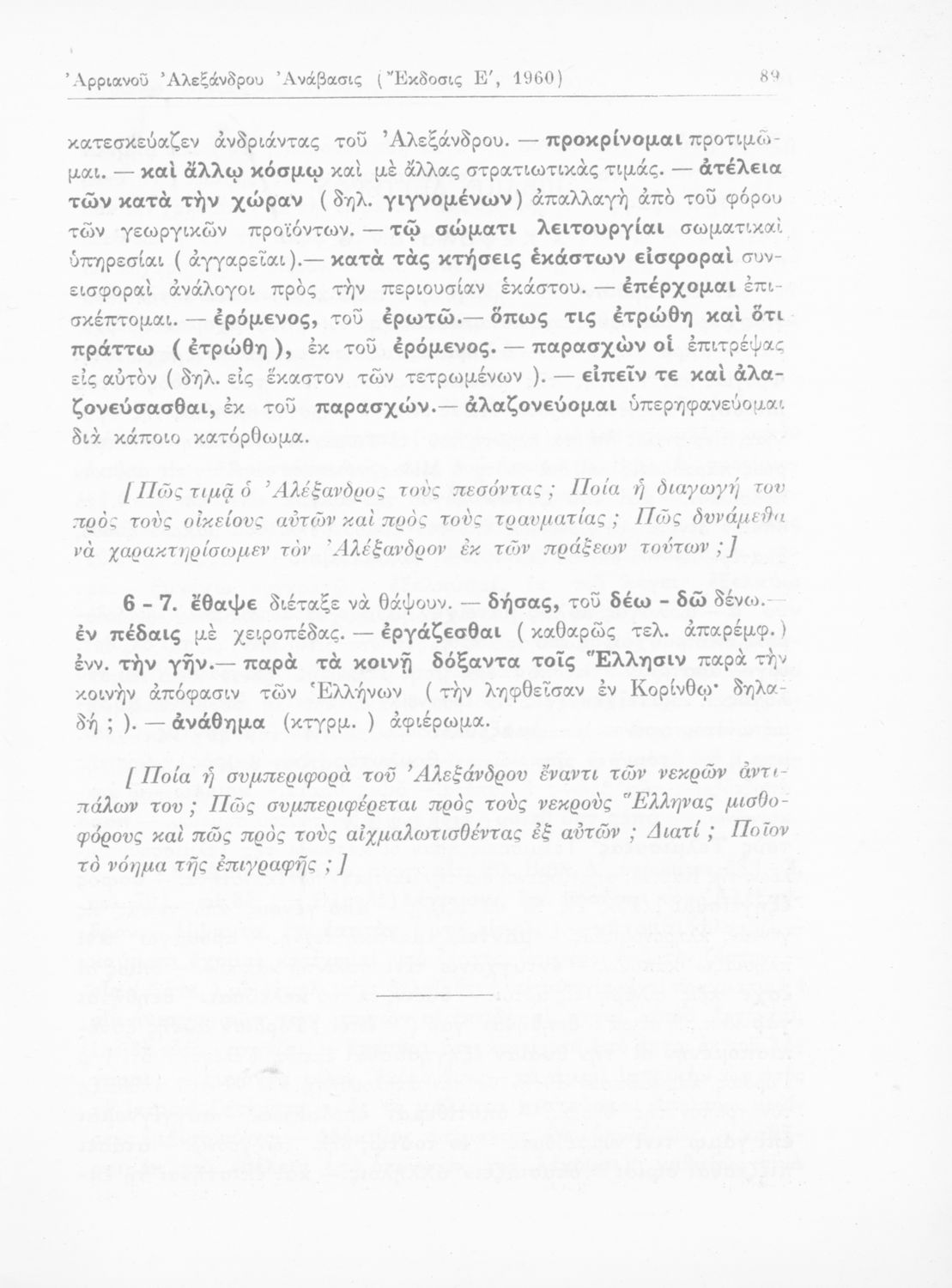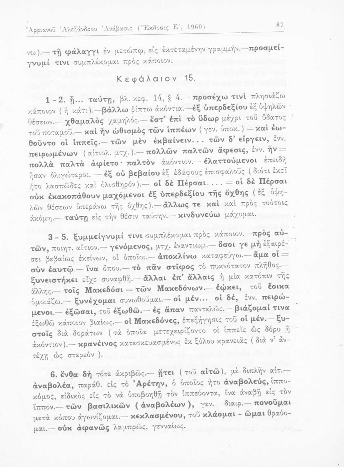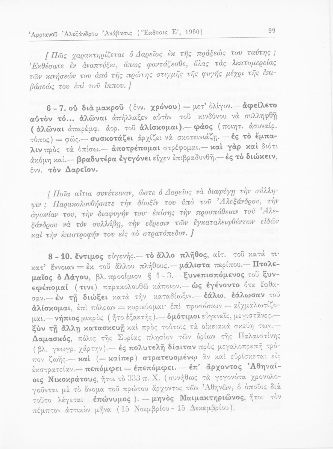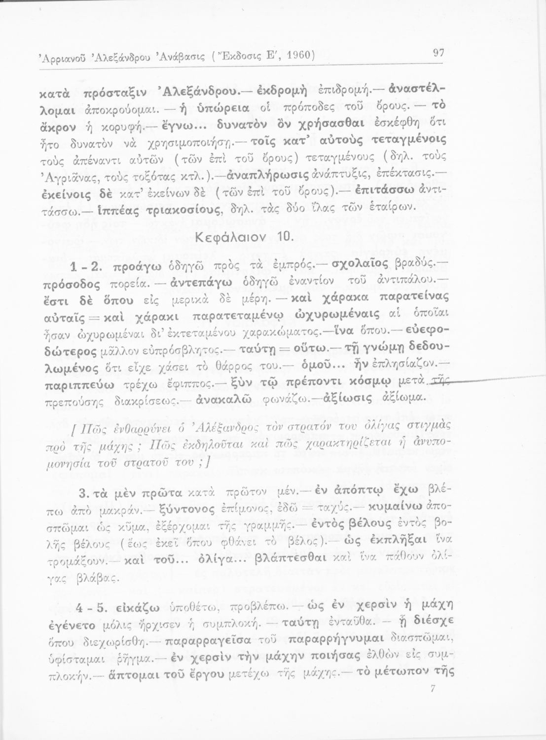 Σχολικό εγχειρίδιο Αρχαίων Ελληνικών Γ΄ Γυμνασίου που περιλαμβάνει αποσπάσματα από το έργο του Αρριανού Αλέξανδρου Ανάβασις και του Ηρόδοτου Ιστορίαι, ερμηνευτικές και λεξιλογικές παρατηρήσεις καθώς και τοπογραφικούς πίνακες και χάρτες..