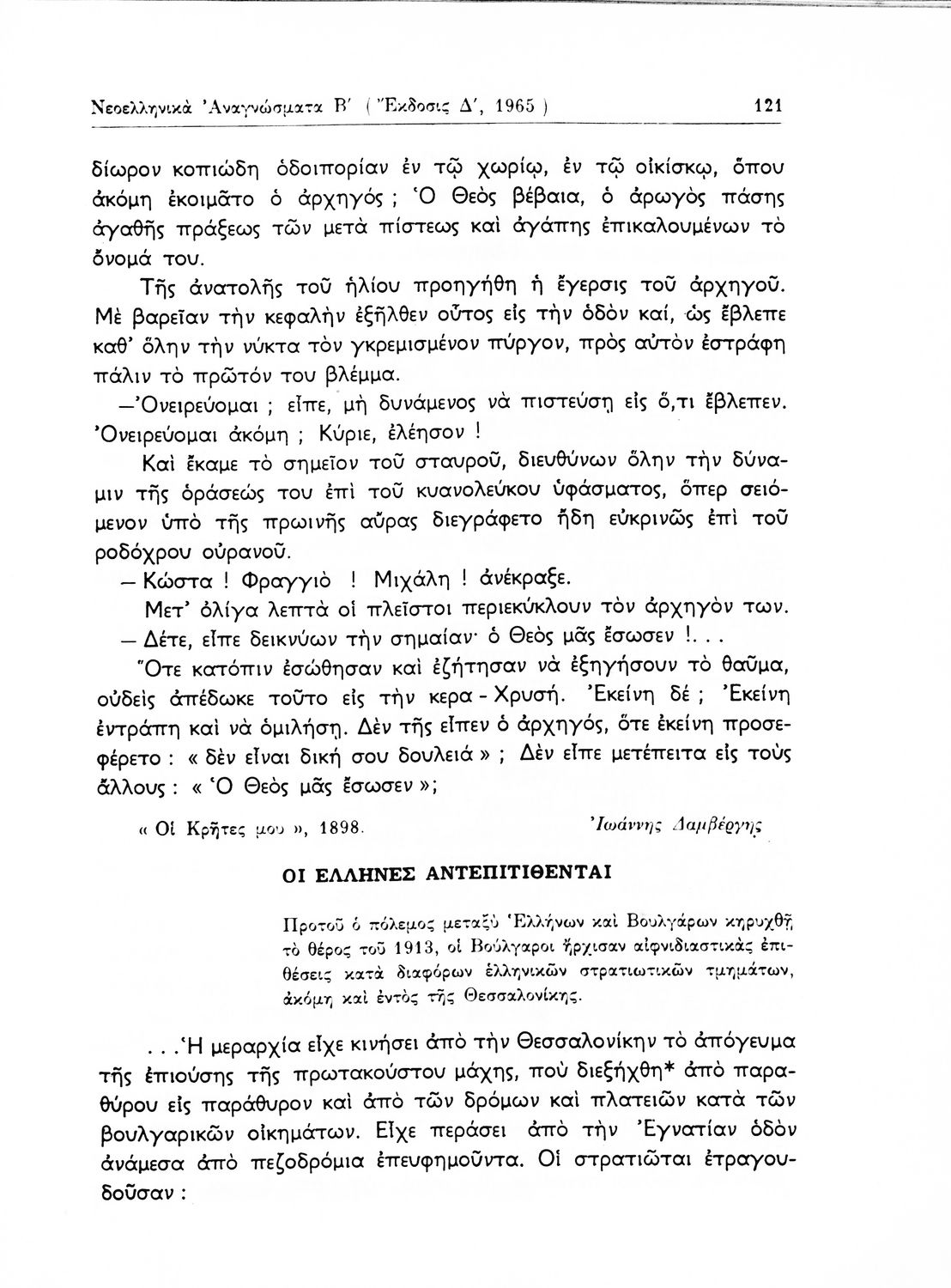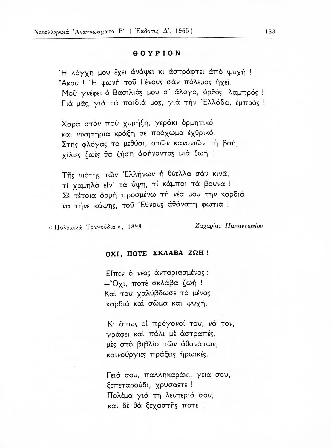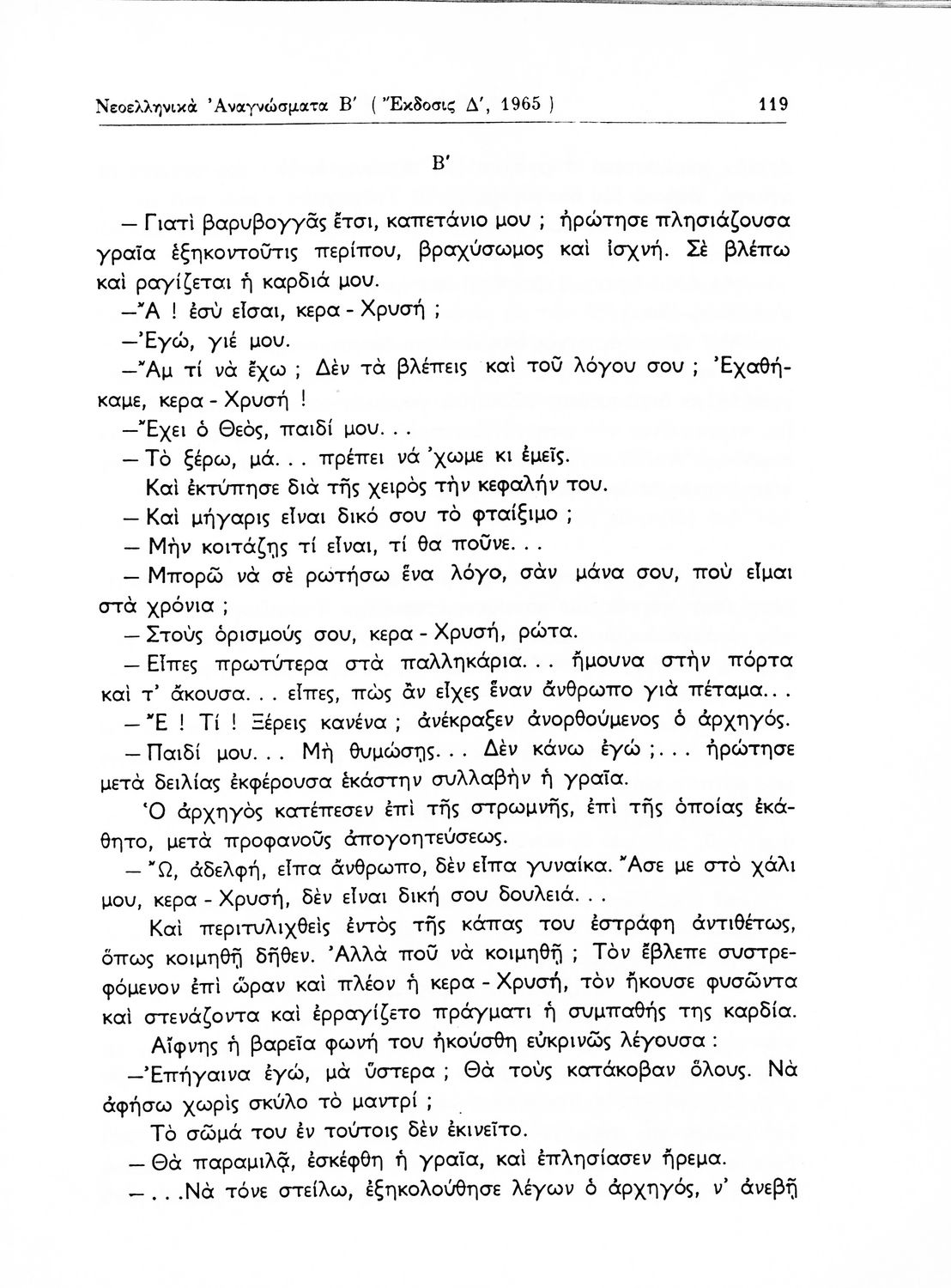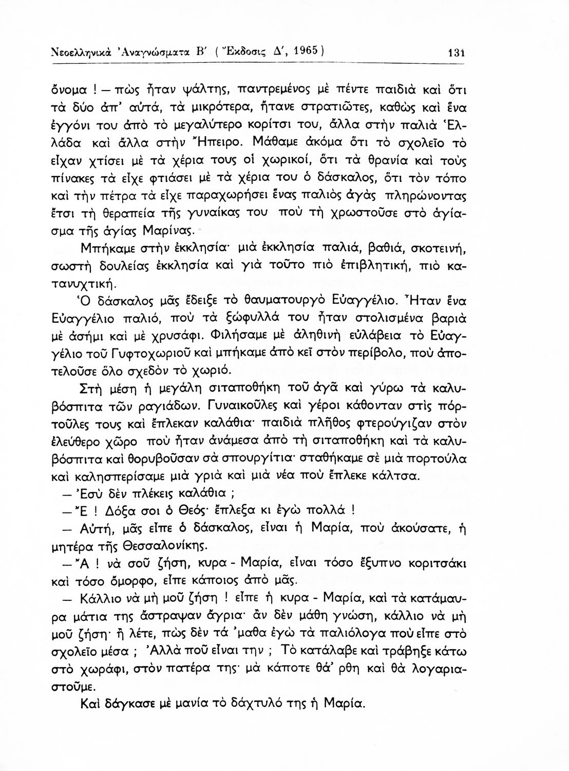 Βαθμίδα εκπαίδευσης: Δευτεροβάθμια Τάξη: Β' Γυμνασίου Μάθημα: Νέα Ελληνικά Γλώσσα: Απλή καθαρεύουσα Παρουσίαση περιεχομένου: Σχολικό εγχειρίδιο της Β΄ Γυμνασίου για το μάθημα των Νέων Ελληνικών. Περιέχει κείμενα πεζά και διηγήματα από την κοινωνική ζωή, τη μυθολογία, την ελληνική ιστορία και τη φυσική ιστορία. Επίσης, περιλαμβάνει διηγήματα και ποιήματα γνωστών Ελλήνων λογοτεχνών. Μέσα από τα κείμενα καλλιεργούνται ηθικές αξίες και η εθνική συνείδηση των μαθητών. |