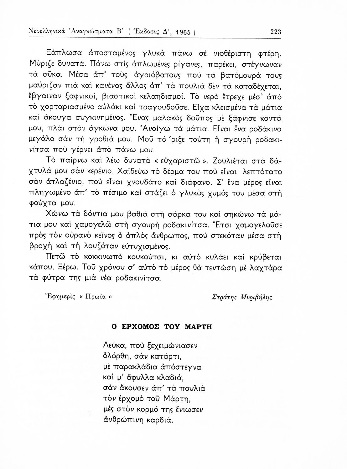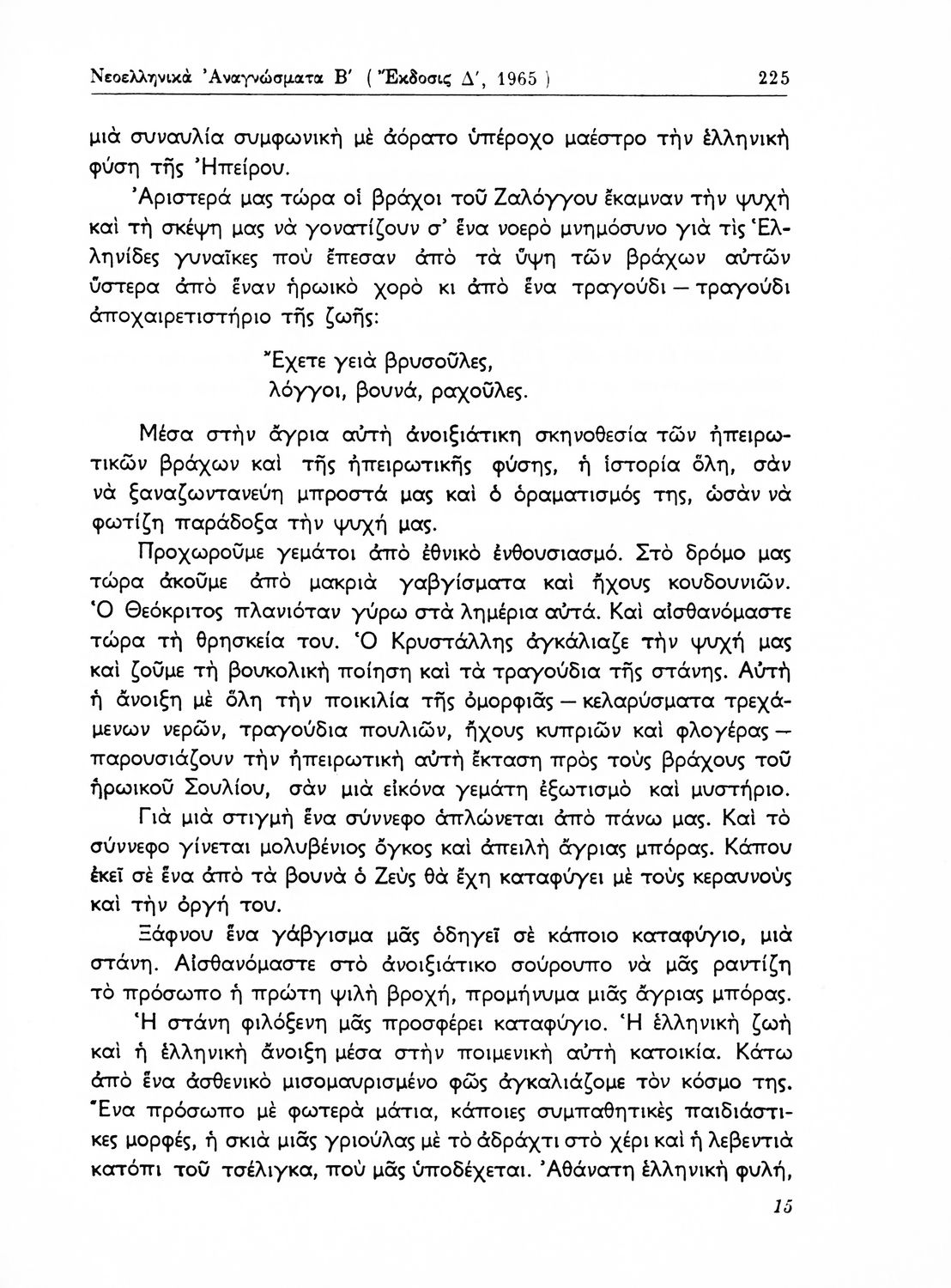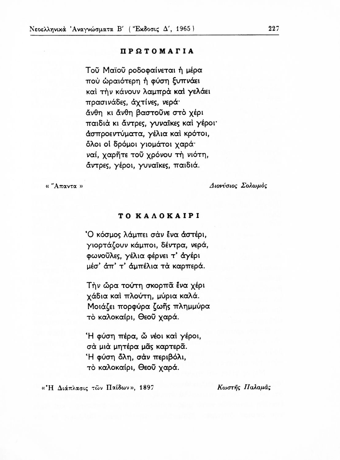 Σχολικό εγχειρίδιο Νέων Ελληνικών Β' Γυμνασίου που περιέχει ποιήματα και πεζά Ελλήνων συγγραφέων εμπνευσμένα από τη θρησκευτική, εθνική, οικογενειακή και κοινωνική ζωή και την ελληνική φύση. Περιέχει παράρτημα