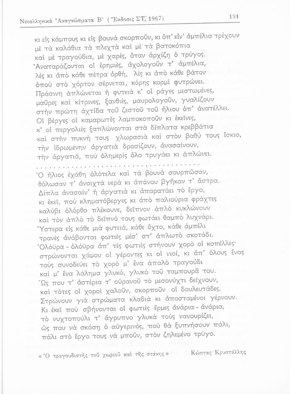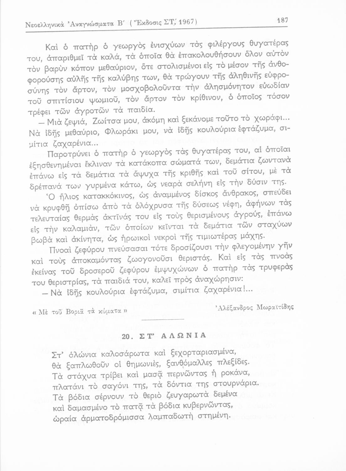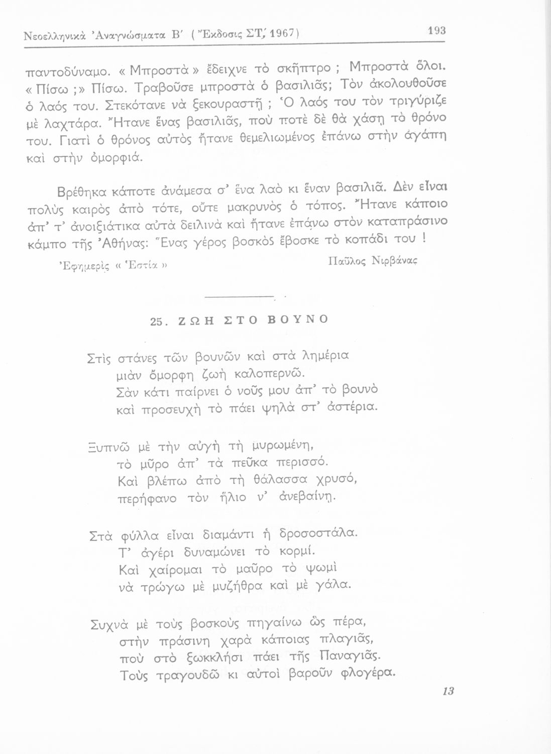 Σχολικό εγχειρίδιο Νέων Ελληνικών Β' Γυμνασίου που περιέχει ποιήματα και πεζά Ελλήνων συγγραφέων εμπνευσμένα από τη θρησκευτική, εθνική, οικογενειακή και κοινωνική ζωή και την ελληνική φύση. Περιέχει παράρτημα με βιογραφίες των συγγραφέων και λεξιλόγιο.