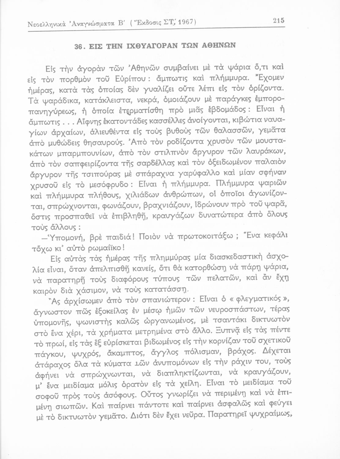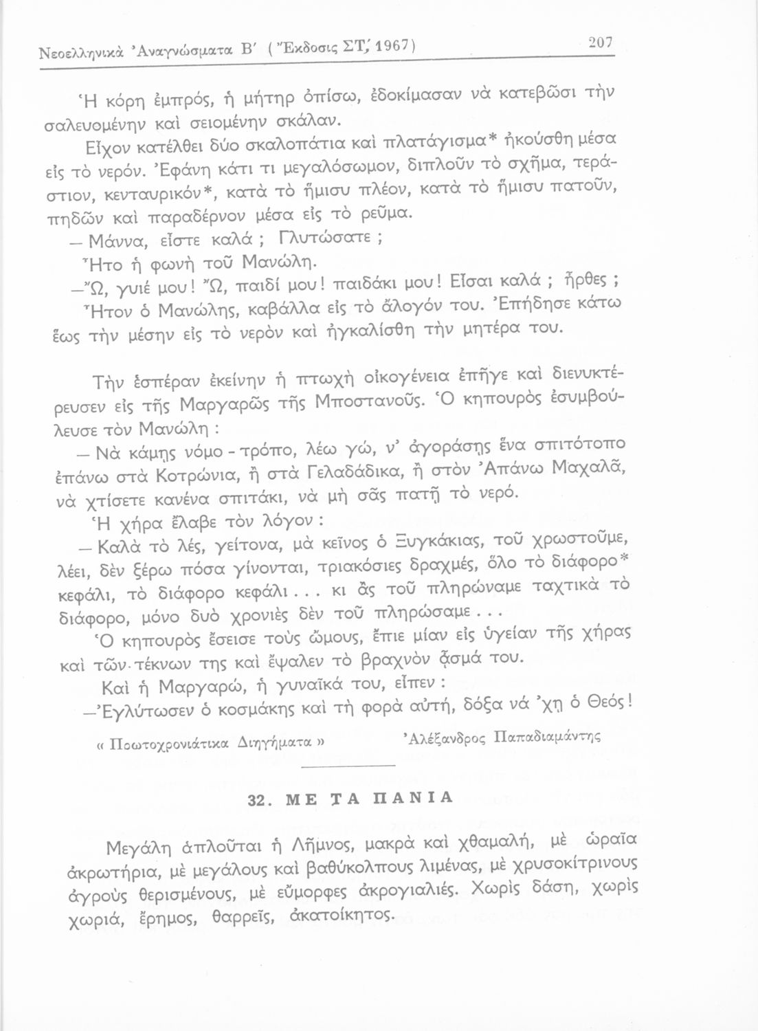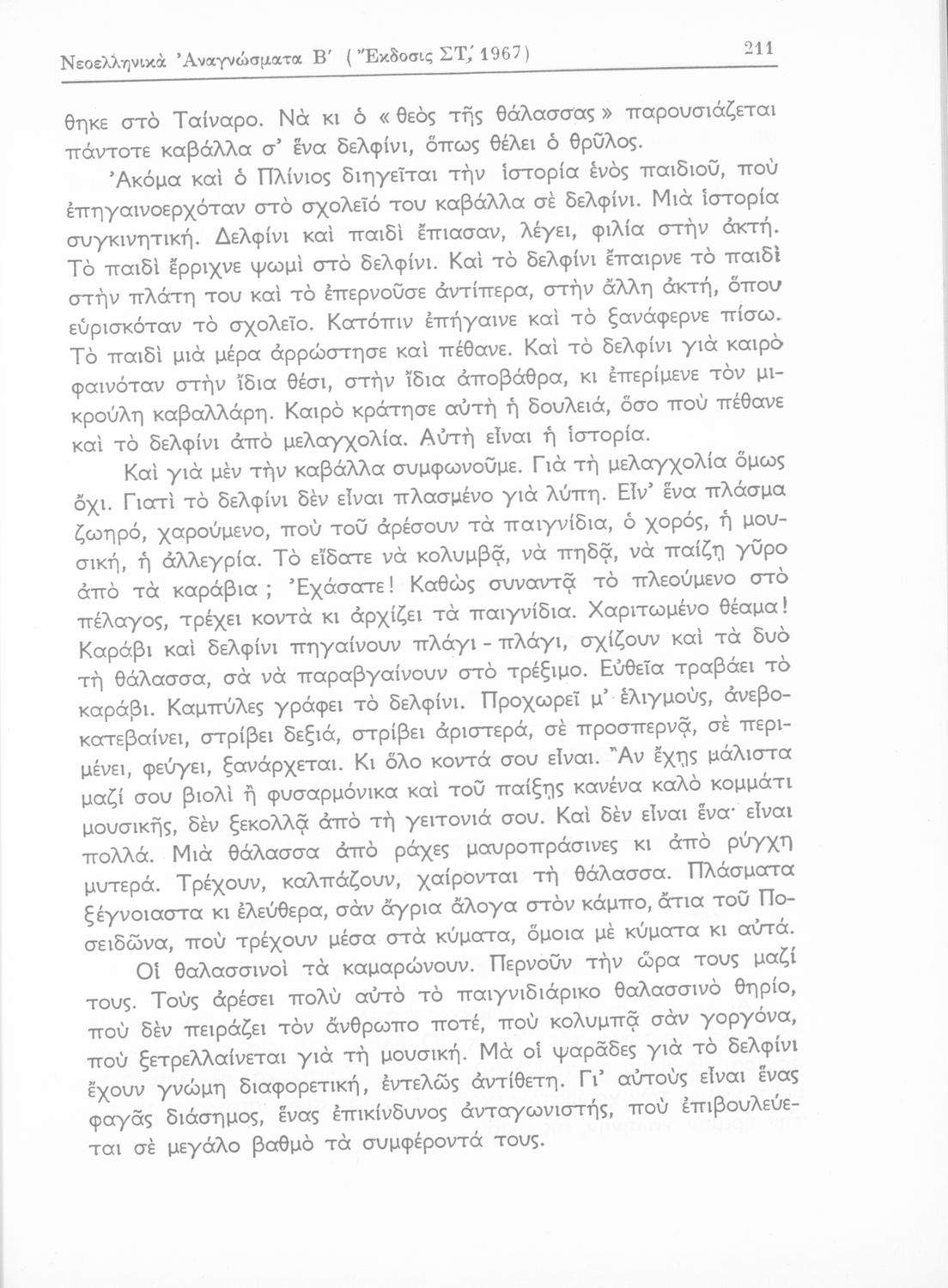 Βαθμίδα εκπαίδευσης: Δευτεροβάθμια Τάξη: Β' Γυμνασίου Μάθημα: Νέα Ελληνικά Γλώσσα: Καθαρεύουσα Παρουσίαση περιεχομένου: Σχολικό εγχειρίδιο Νέων Ελληνικών Β' Γυμνασίου που περιέχει ποιήματα και πεζά Ελλήνων συγγραφέων εμπνευσμένα από τη θρησκευτική, εθνική, οικογενειακή και κοινωνική ζωή και την ελληνική φύση. Περιέχει παράρτημα με βιογραφίες των συγγραφέων και λεξιλόγιο. |