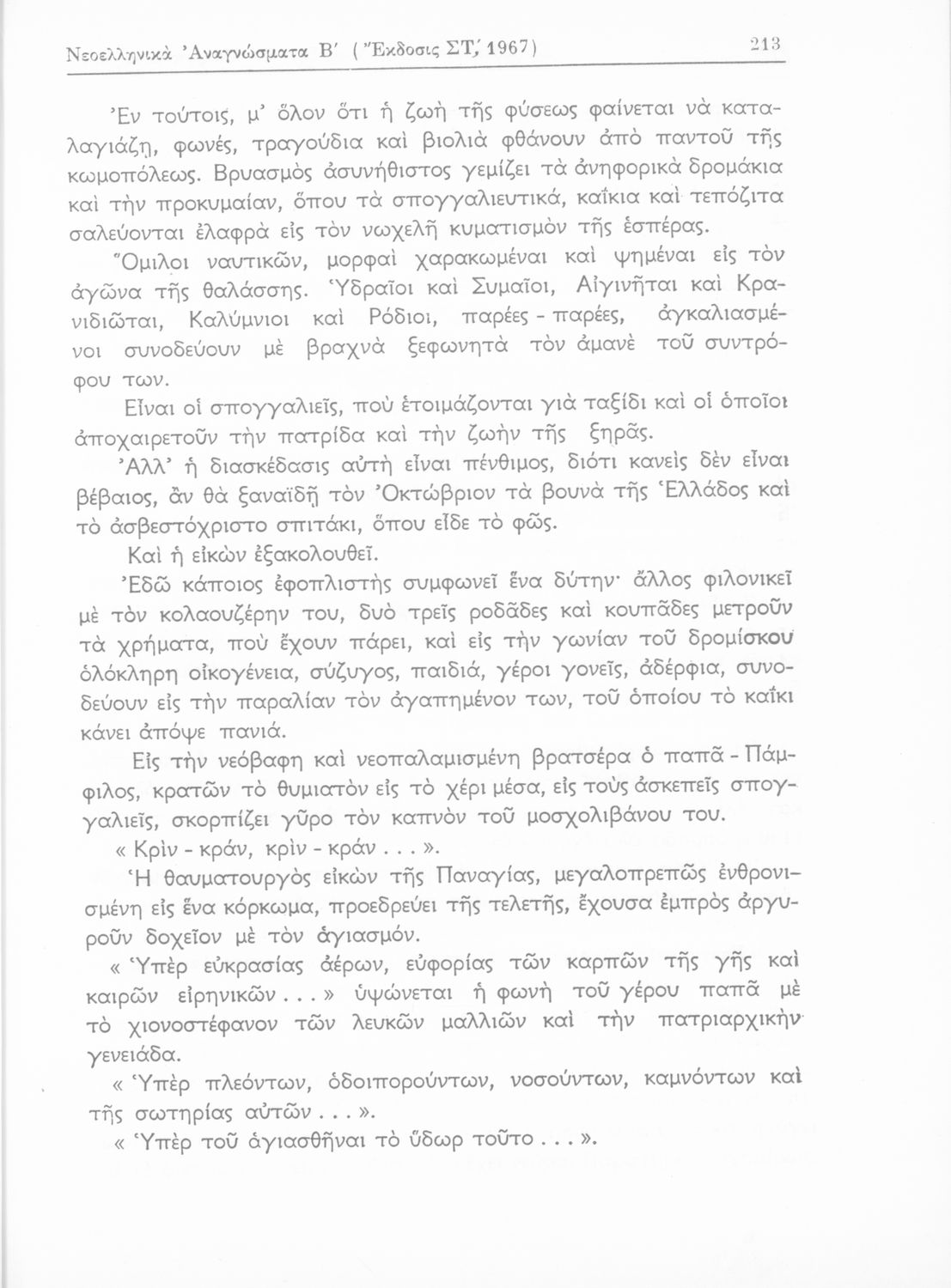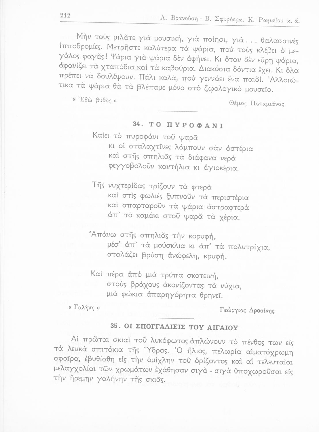 Σχολικό εγχειρίδιο Νέων Ελληνικών Β' Γυμνασίου που περιέχει ποιήματα και πεζά Ελλήνων συγγραφέων εμπνευσμένα από τη θρησκευτική, εθνική, οικογενειακή και κοινωνική ζωή και την ελληνική φύση. Περιέχει παράρτημα με βιογραφίες των συγγραφέων και λεξιλόγιο.