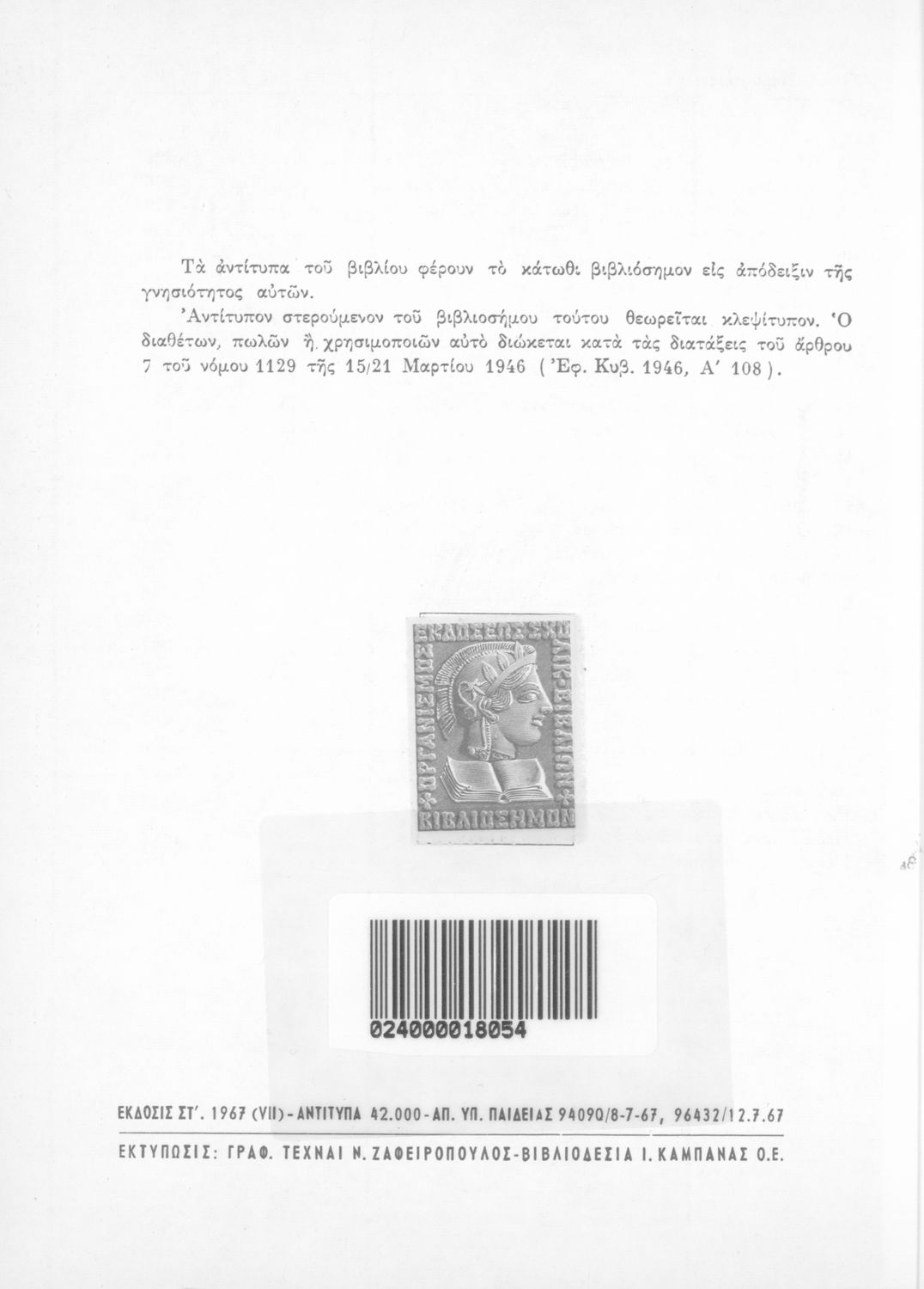 Εκδότης: Οργανισμός Εκδόσεως Διδακτικών Βιβλίων Έτος έκδοσης: 1967 Τόπος έκδοσης: Αθήνα Έκδοση: 6η Υπουργική απόφαση / Σύμβαση: 94090/8-7-1967 Έτος έγκρισης: 1967 |