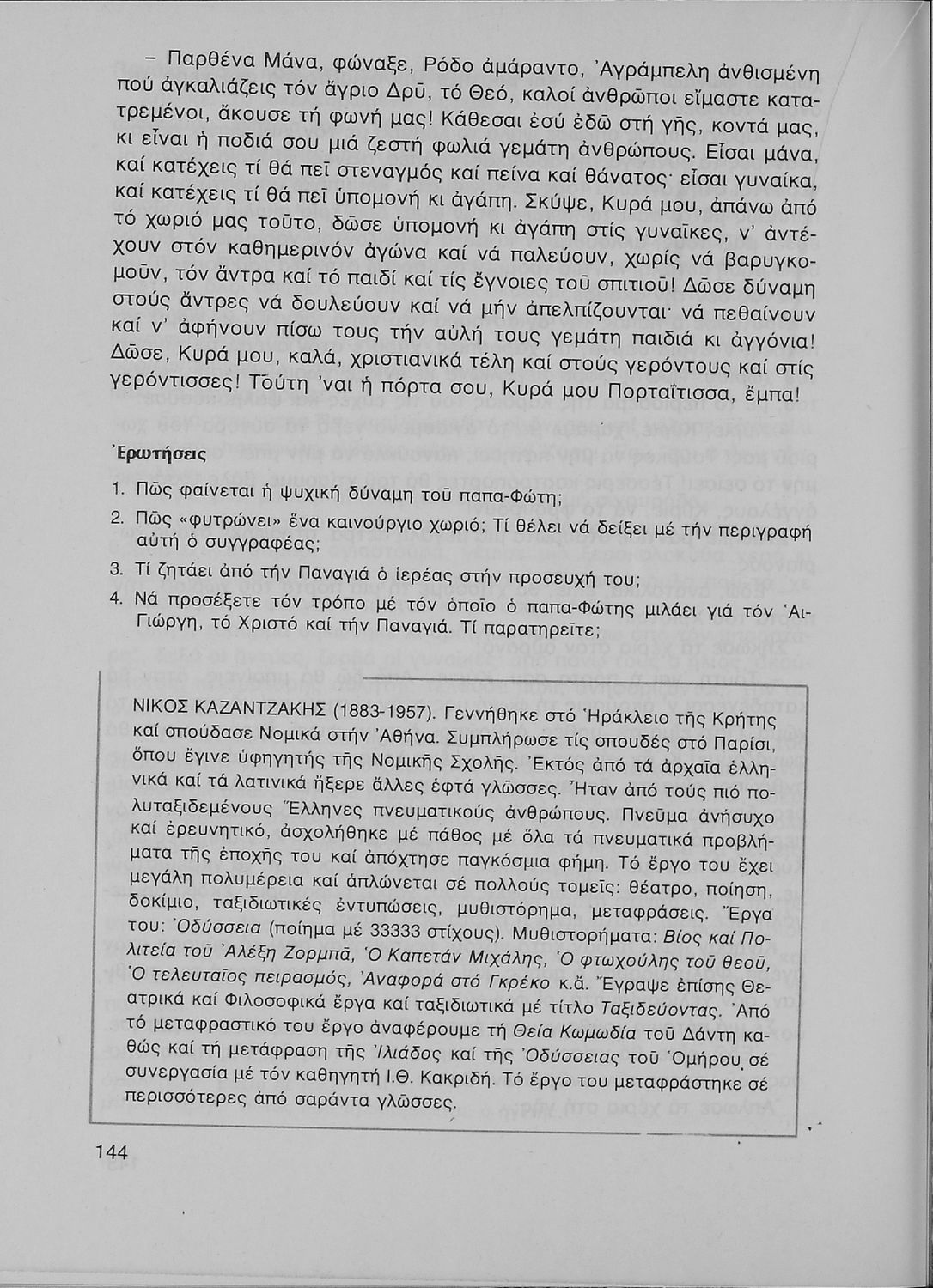 Σχολικό εγχειρίδιο Νέων Ελληνικών Α΄ Γυμνασίου που περιλαμβάνει δοκίμια, πεζά και ποιήματα Ελλήνων συγγραφέων και δημοτικά τραγούδια εμπνευσμένα από τη θρησκευτική, εθνική και κοινωνική ζωή, τη "δοκιμασία της ...