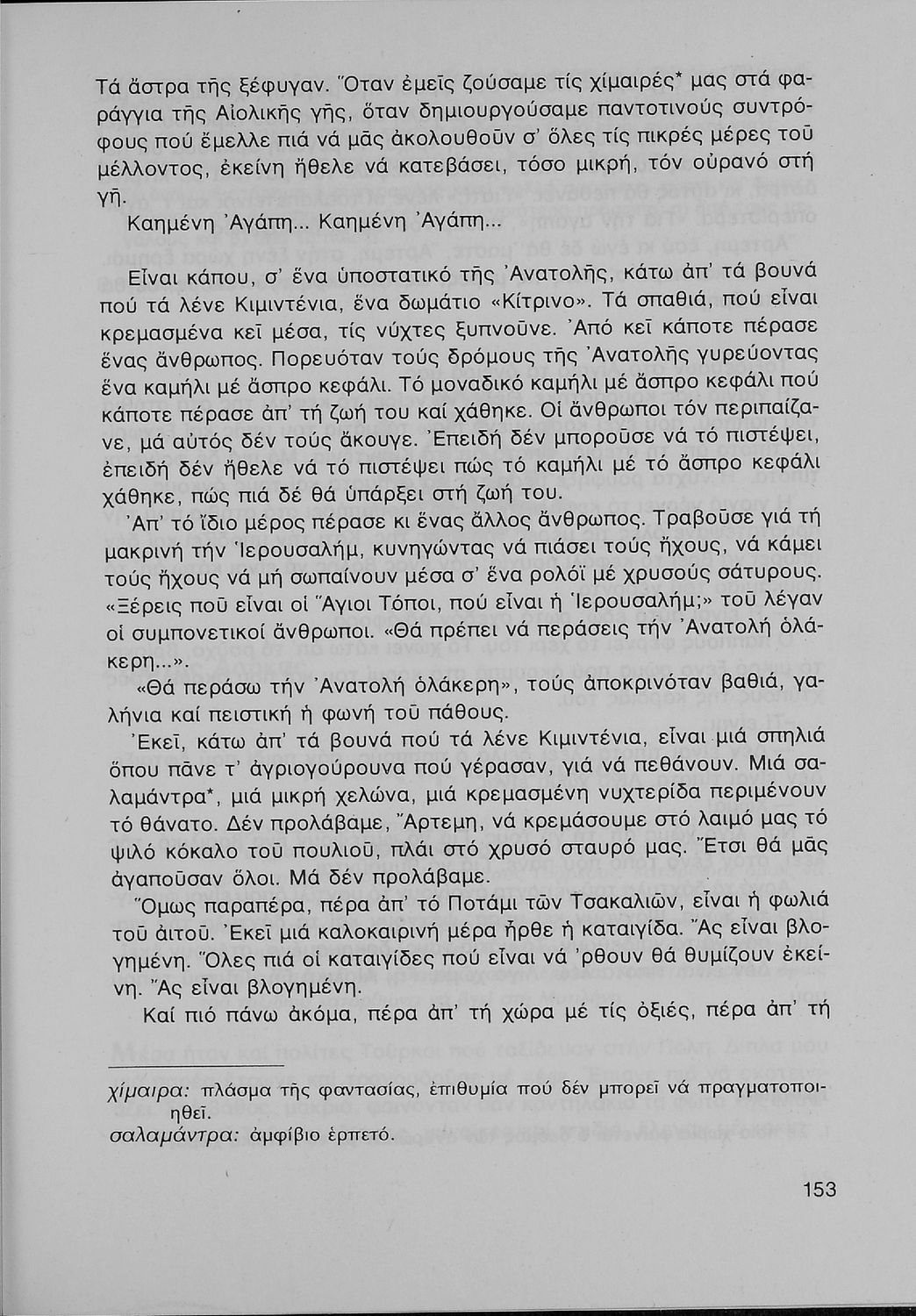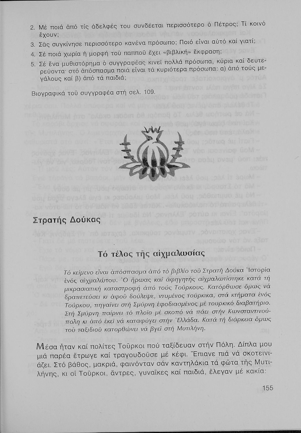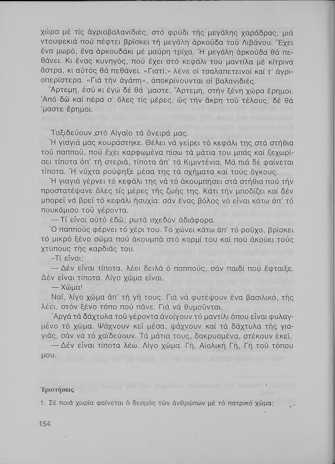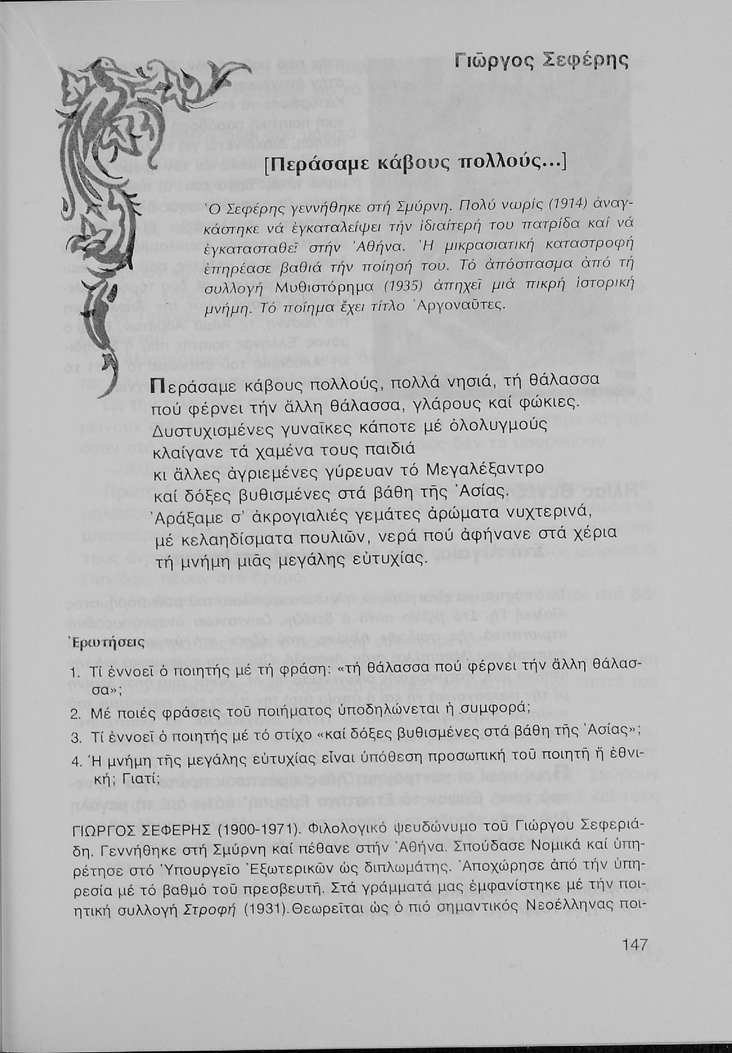Σχολικό εγχειρίδιο Νέων Ελληνικών Β' Γυμνασίου που περιέχει δημοτικά τραγούδια, πεζά, δοκίμια και ποιήματα σύγχρονων Ελλήνων συγγραφέων και είναι χωρισμένο σε θεματικές ενότητες όπως η πόλη και η ύπαιθρος, η εποχή του 40' και η κατοχή, η θρησκευτική ζωή, ο καημός της ξενιτιάς, ο ελληνισμός έξω από τα σύνορα, οι αγώνες Ακριτών-Κλεφτών κ.α. Περιλαμβάνει και έργα ευρωπαίων λογοτεχνών.