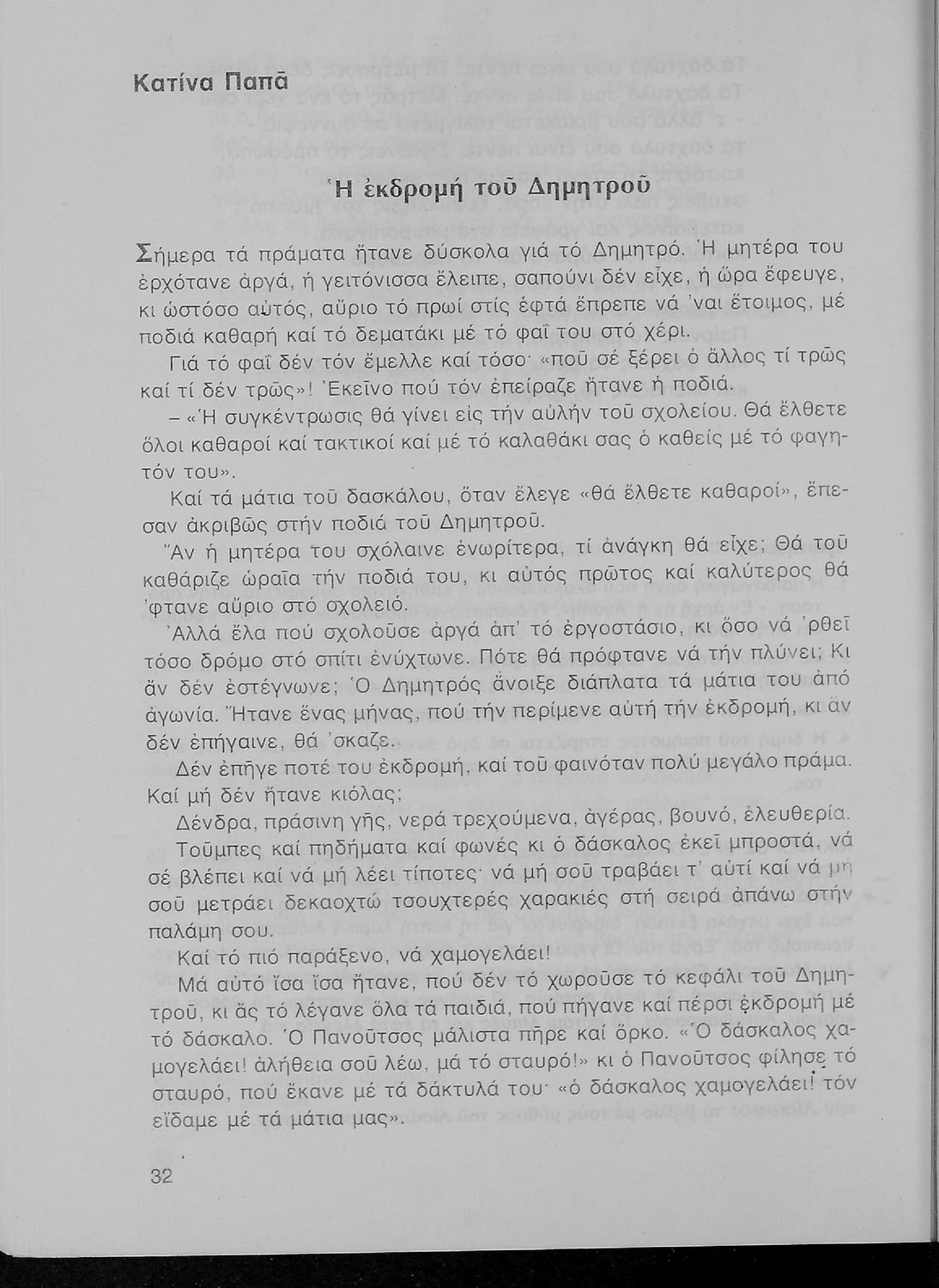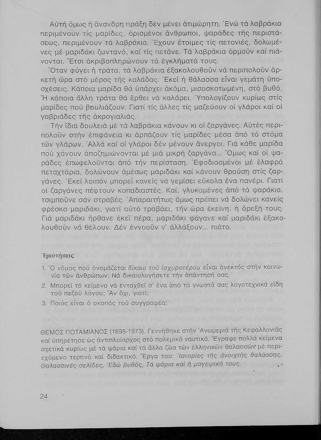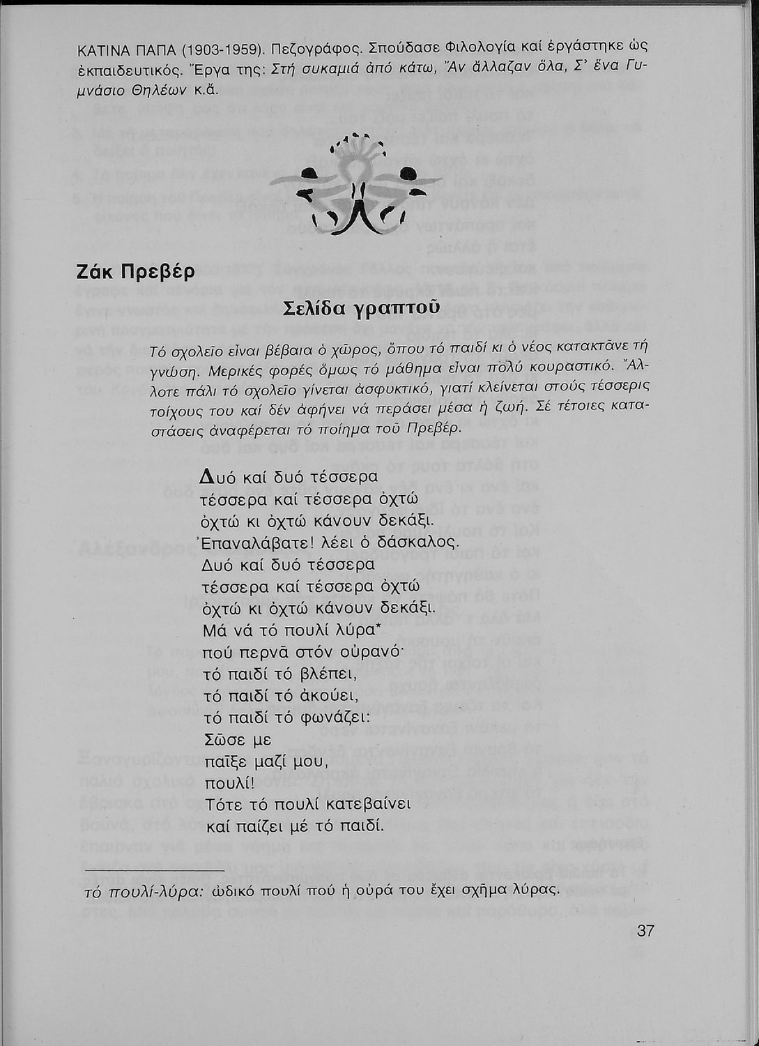 Σχολικό εγχειρίδιο Νέων Ελληνικών Α΄ Γυμνασίου που περιλαμβάνει δοκίμια, πεζά και ποιήματα Ελλήνων συγγραφέων και δημοτικά τραγούδια εμπνευσμένα από τη θρησκευτική, εθνική και κοινωνική ζωή, τη "δοκιμασία της ...