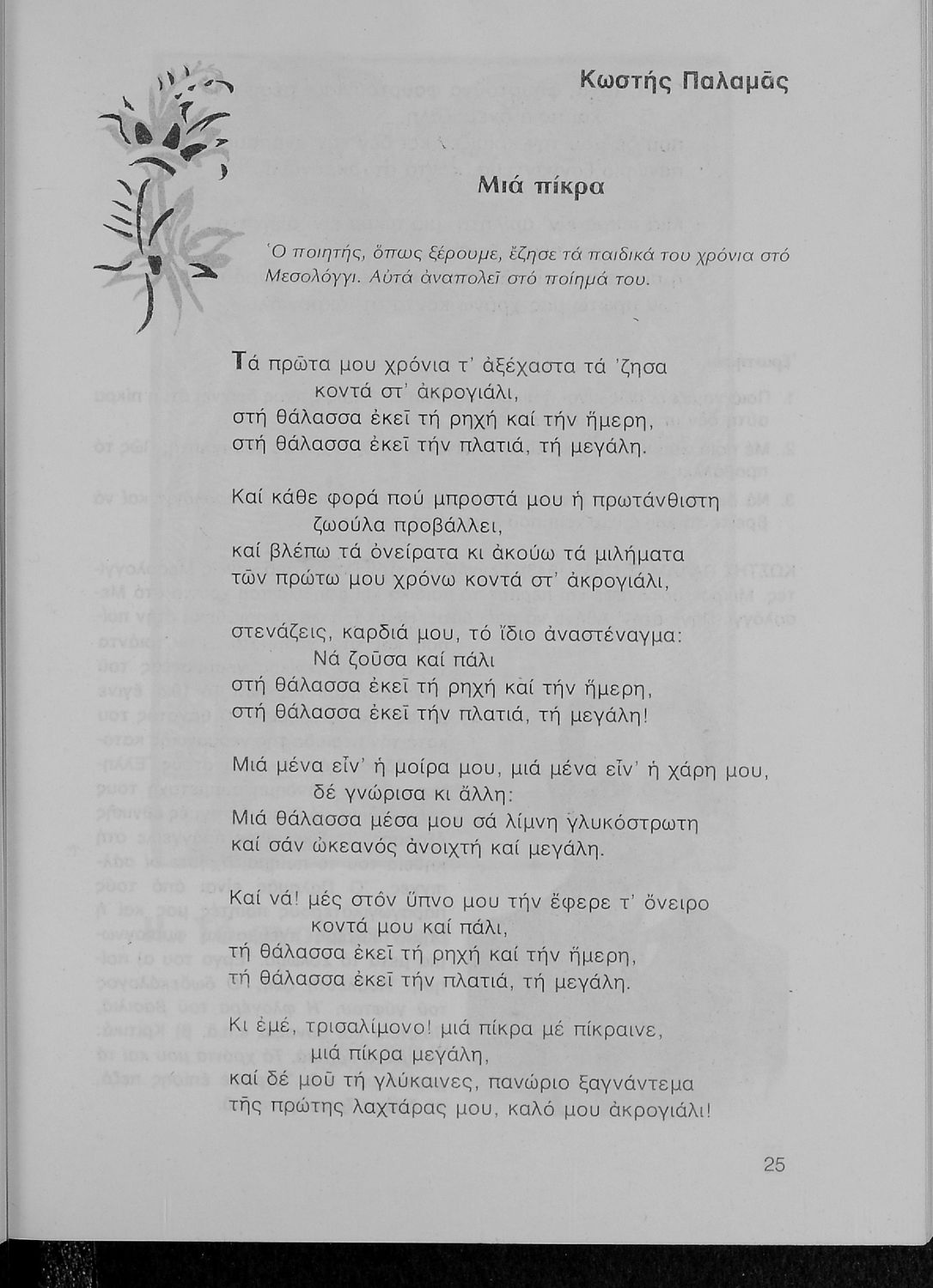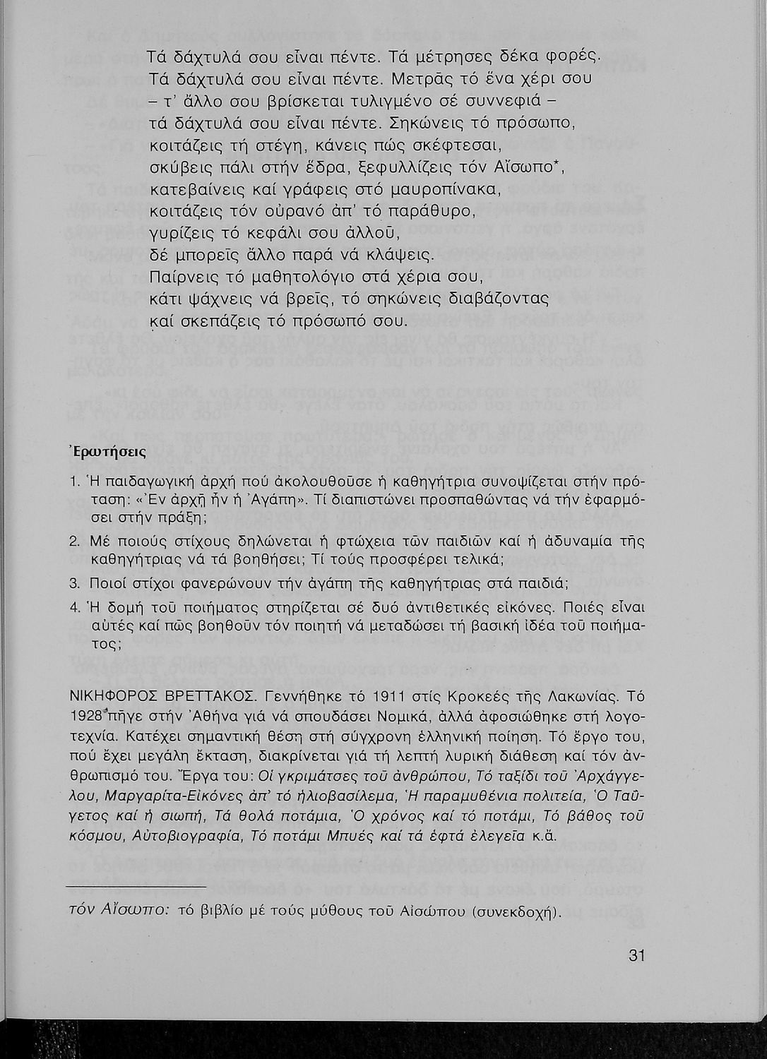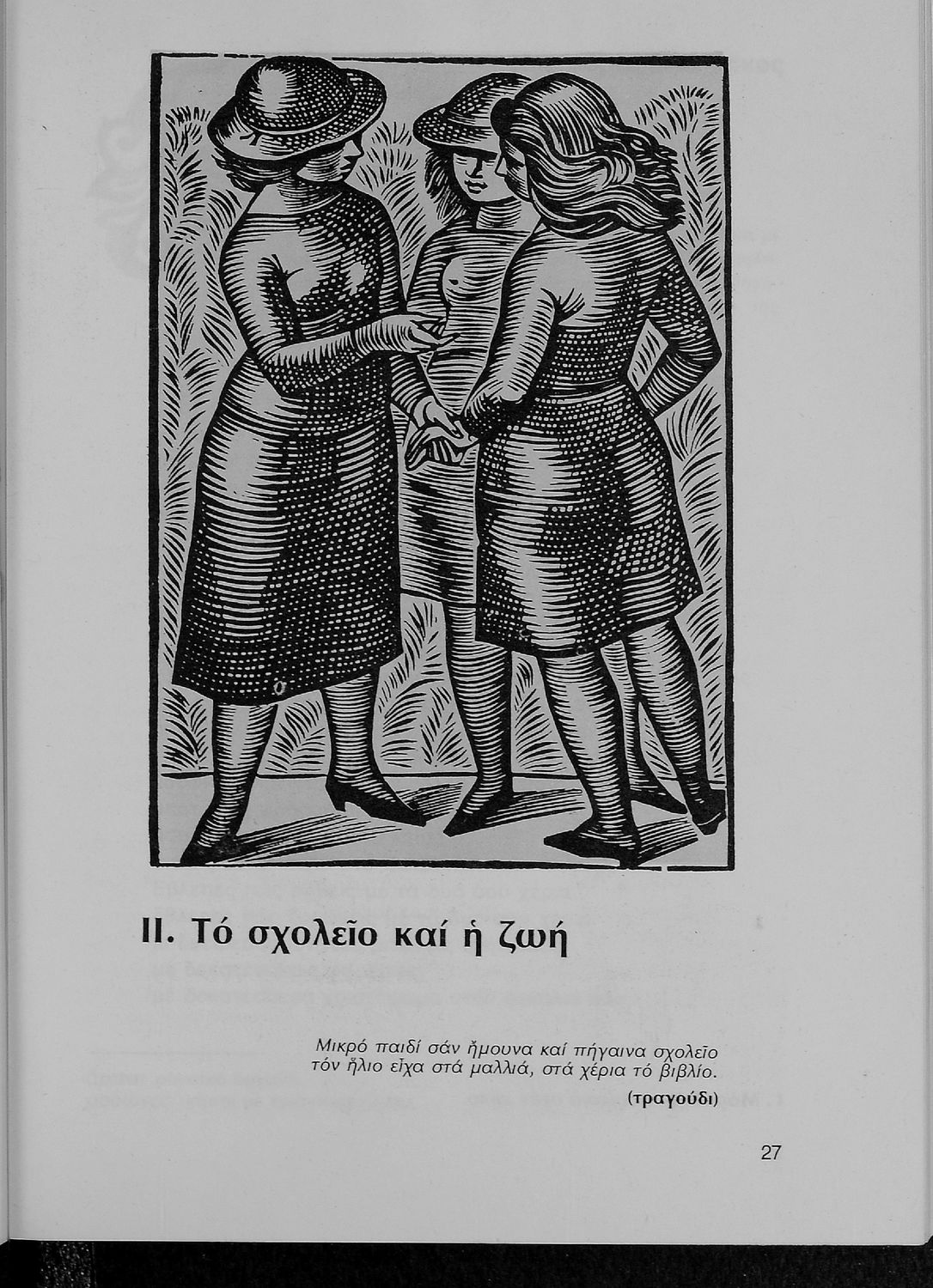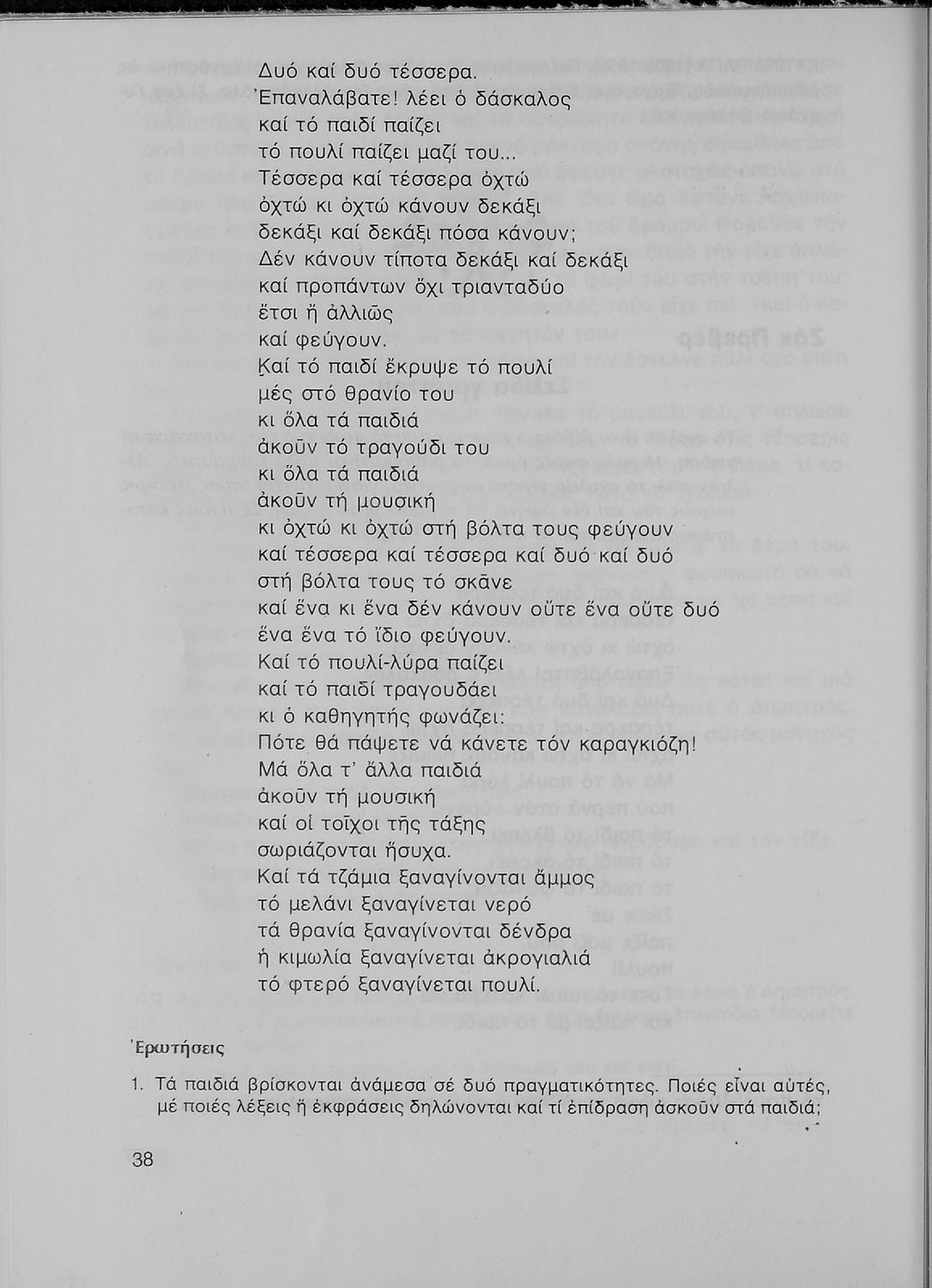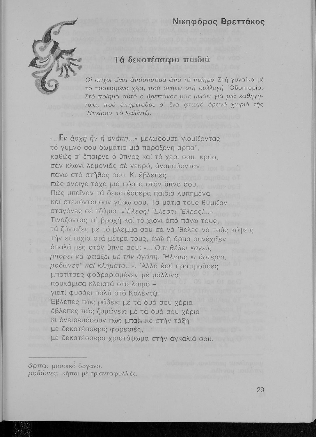 Σχολικό εγχειρίδιο Νέων Ελληνικών Β' Γυμνασίου που περιέχει δημοτικά τραγούδια, πεζά, δοκίμια και ποιήματα σύγχρονων Ελλήνων συγγραφέων και είναι χωρισμένο σε θεματικές ενότητες όπως η πόλη και η ύπαιθρος, η εποχή του 40' και η κατοχή, η θρησκευτική ζωή, ο καημός της ξενιτιάς, ο ελληνισμός έξω από τα σύνορα, οι αγώνες Ακριτών-Κλεφτών κ.α. Περιλαμβάνει και έργα ευρωπαίων λογοτεχνών.