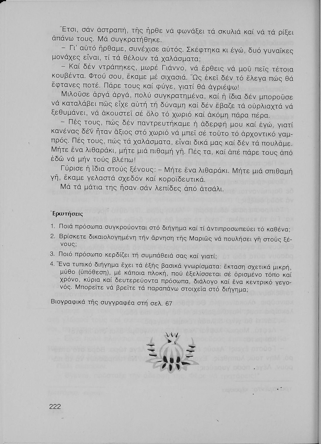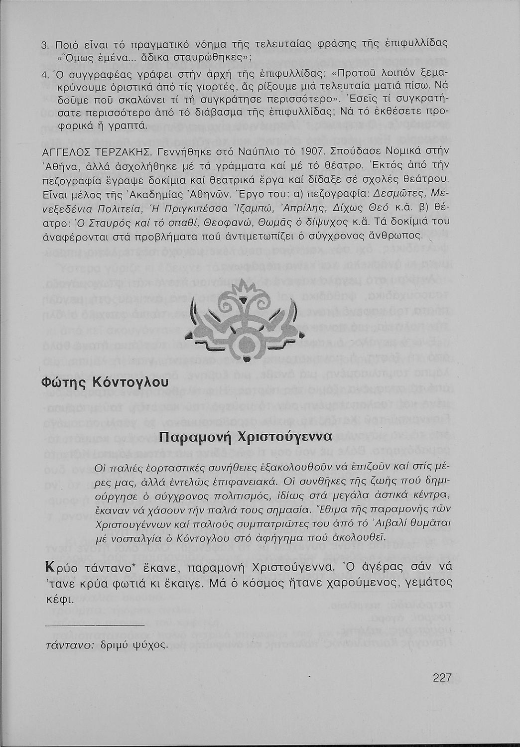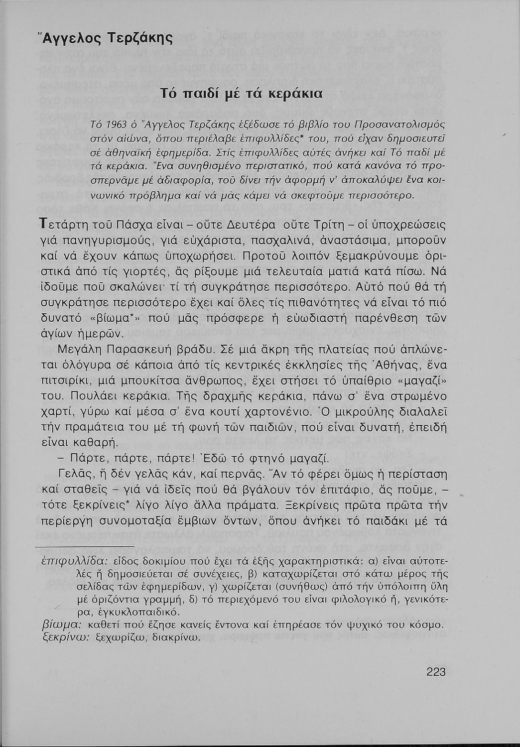 Σχολικό εγχειρίδιο Νέων Ελληνικών Α΄ Γυμνασίου που περιλαμβάνει δοκίμια, πεζά και ποιήματα Ελλήνων συγγραφέων και δημοτικά τραγούδια εμπνευσμένα από τη θρησκευτική, εθνική και κοινωνική ζωή, τη "δοκιμασία της ...