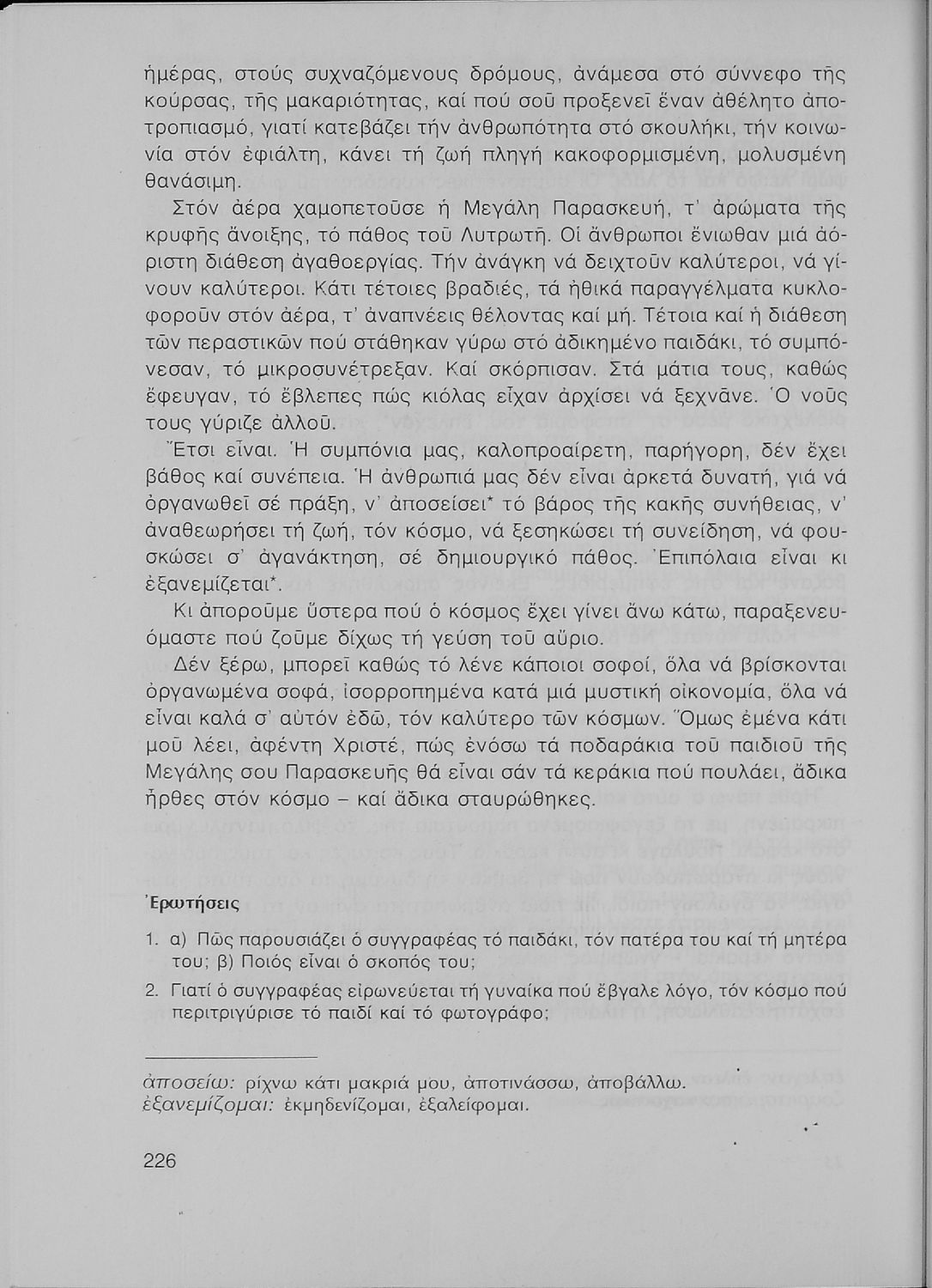 Παρουσίαση περιεχομένου: Σχολικό εγχειρίδιο Νέων Ελληνικών Β' Γυμνασίου που περιέχει δημοτικά τραγούδια, πεζά, δοκίμια και ποιήματα σύγχρονων Ελλήνων συγγραφέων και είναι χωρισμένο σε θεματικές ενότητες όπως η πόλη και η ύπαιθρος, η εποχή του 40' και η κατοχή, η θρησκευτική ζωή, ο καημός της ξενιτιάς, ο ελληνισμός έξω από τα σύνορα, οι αγώνες Ακριτών-Κλεφτών κ.α. Περιλαμβάνει και έργα ευρωπαίων λογοτεχνών.