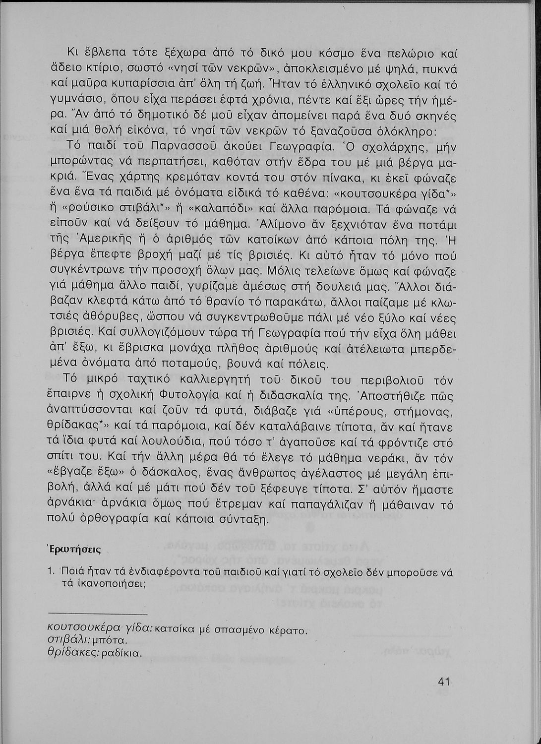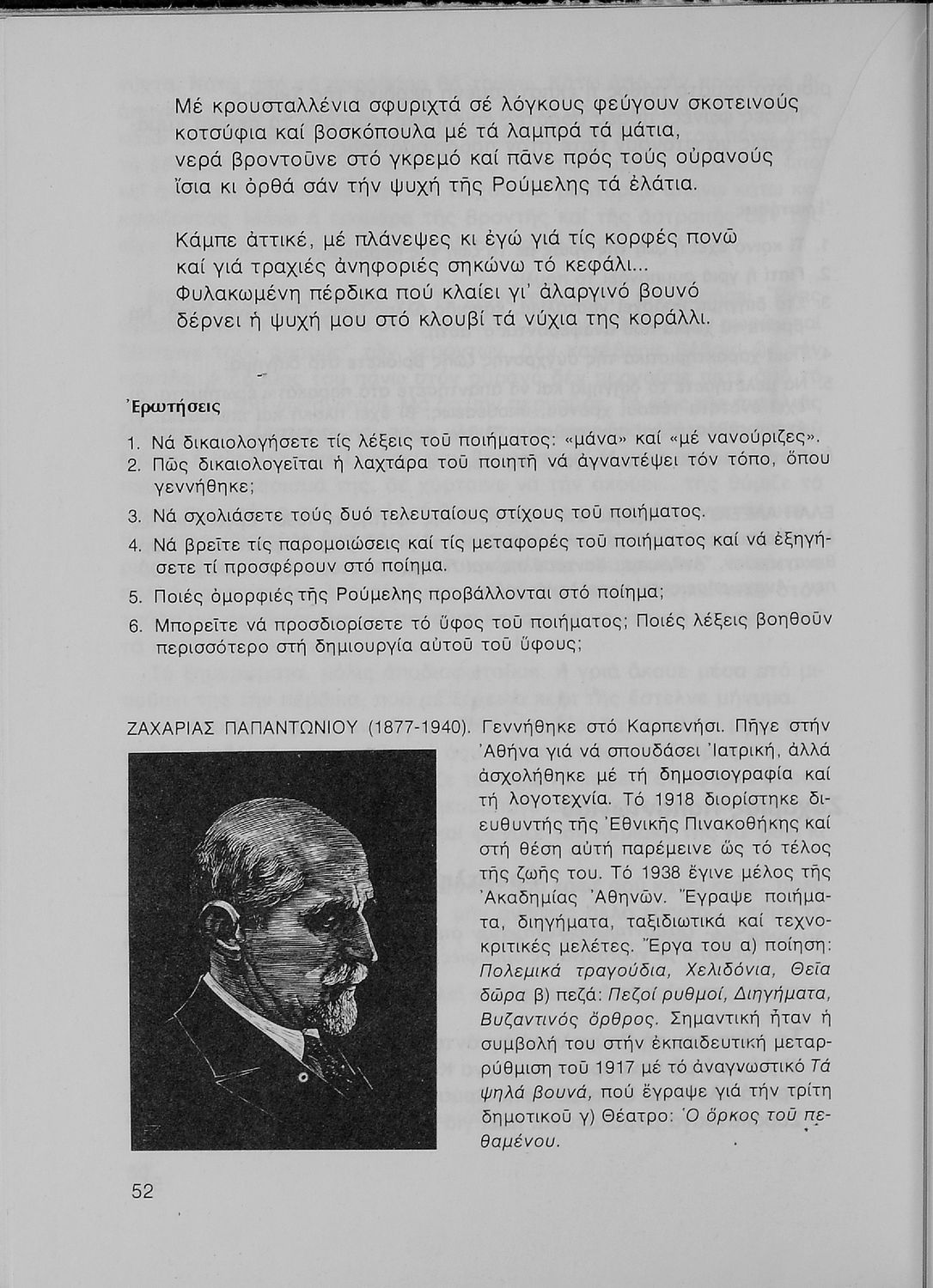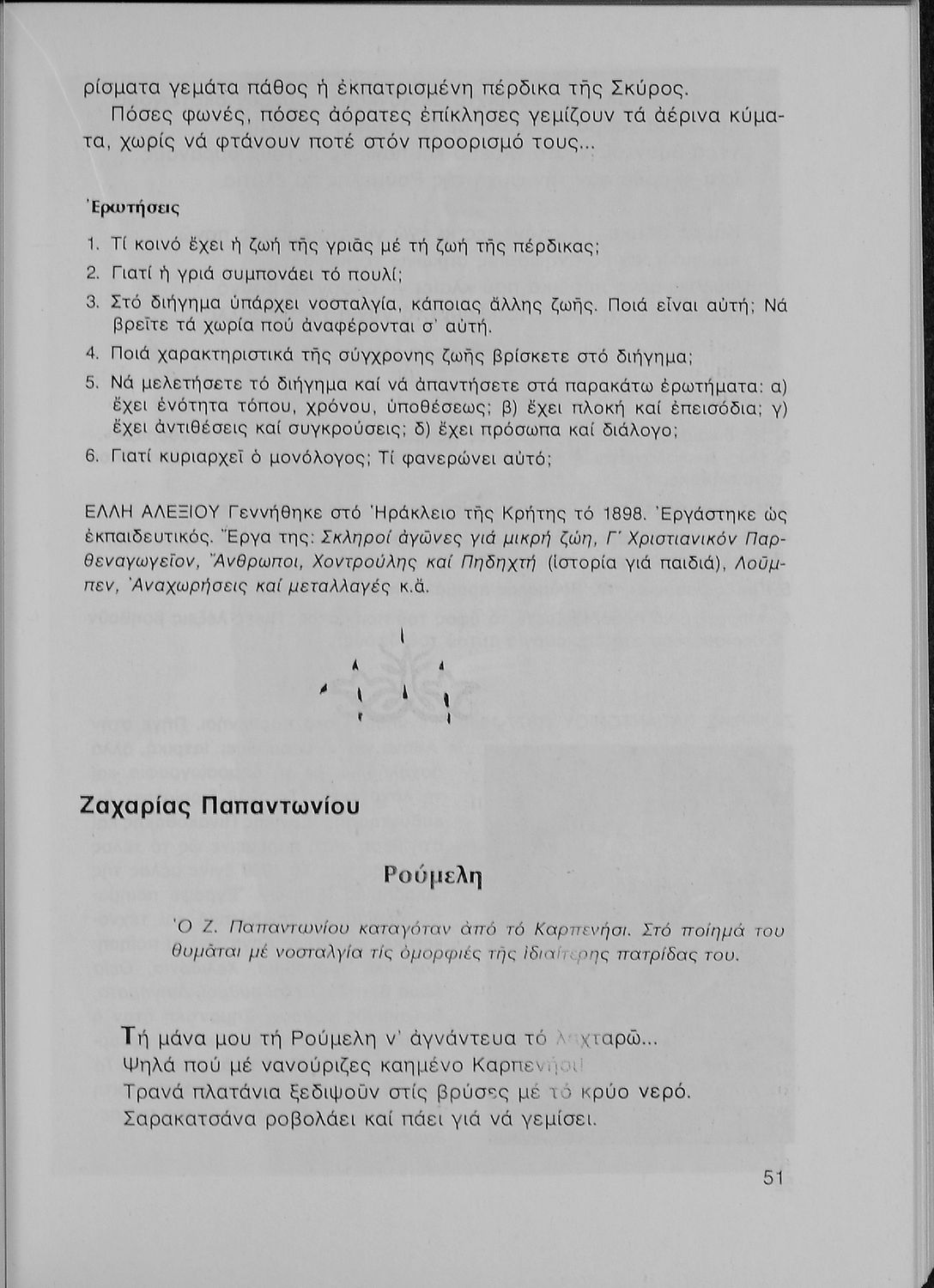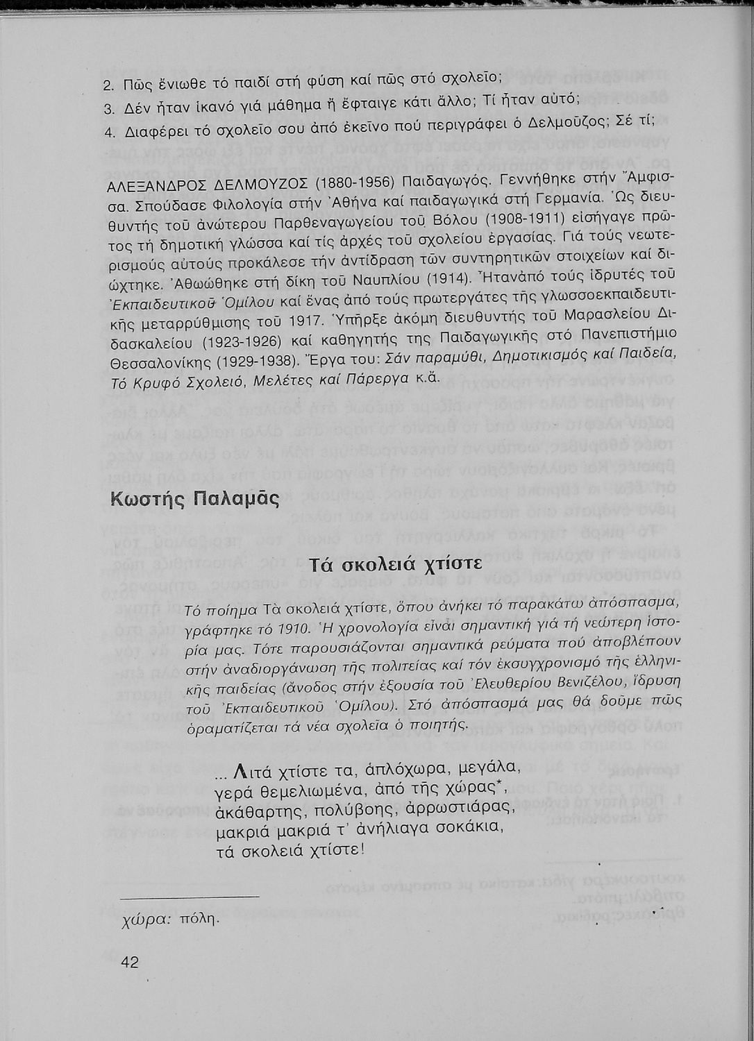 Σχολικό εγχειρίδιο Νέων Ελληνικών Β' Γυμνασίου που περιέχει δημοτικά τραγούδια, πεζά, δοκίμια και ποιήματα σύγχρονων Ελλήνων συγγραφέων και είναι χωρισμένο σε θεματικές ενότητες όπως η πόλη και η ύπαιθρος, η εποχή του 40' και η κατοχή, η θρησκευτική ζωή, ο καημός της ξενιτιάς, ο ελληνισμός έξω από τα σύνορα, οι αγώνες Ακριτών-Κλεφτών κ.α. Περιλαμβάνει και έργα ευρωπαίων λογοτεχνών.