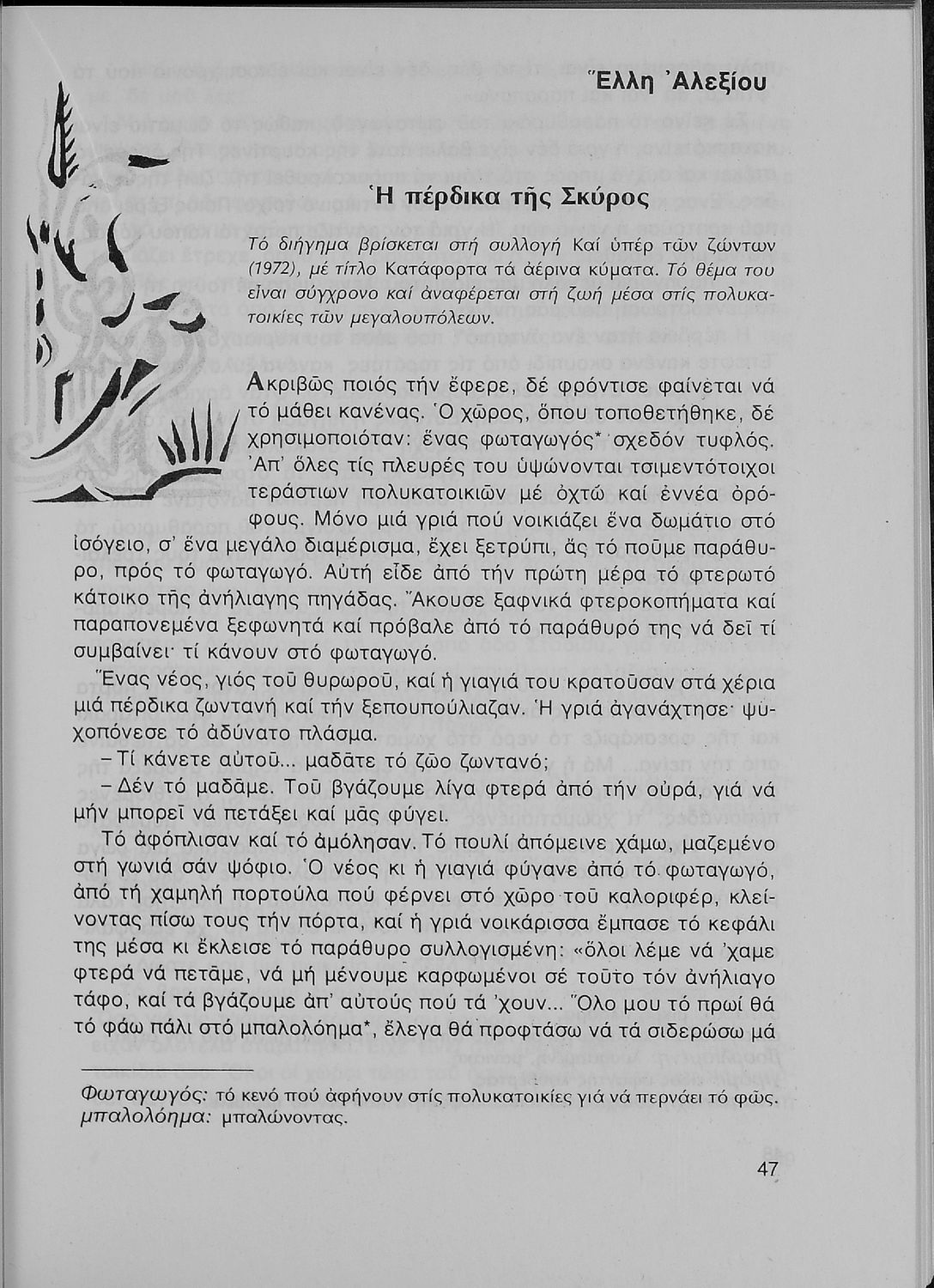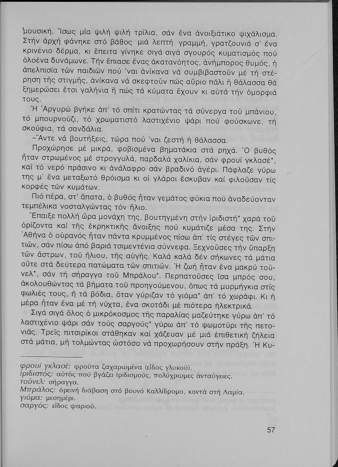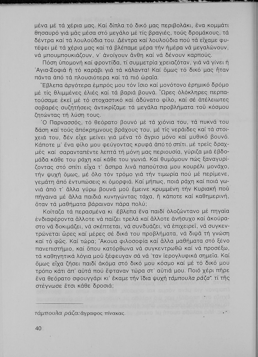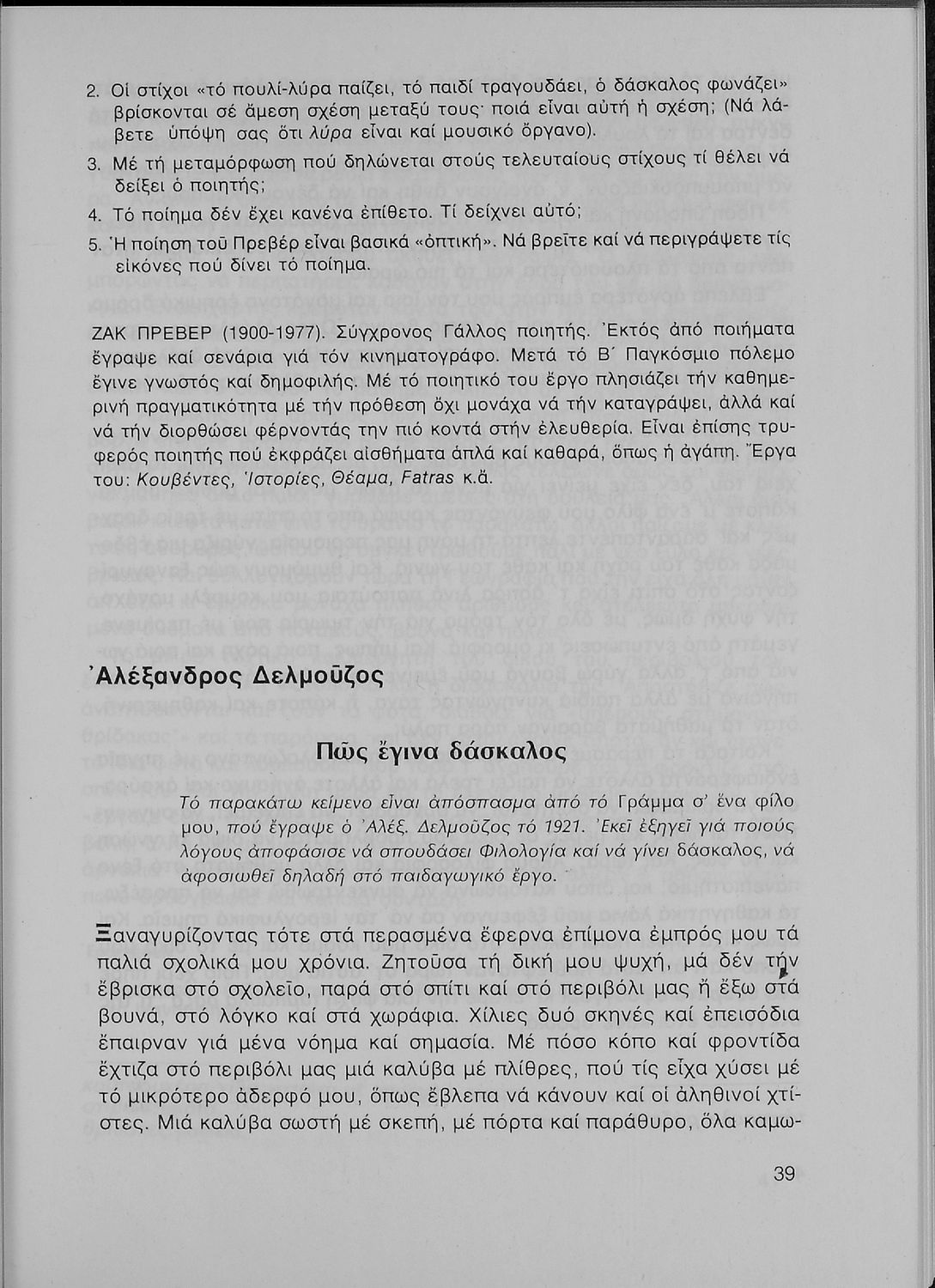 Σχολικό εγχειρίδιο Νέων Ελληνικών Β' Γυμνασίου που περιέχει δημοτικά τραγούδια, πεζά, δοκίμια και ποιήματα σύγχρονων Ελλήνων συγγραφέων και είναι χωρισμένο σε θεματικές ενότητες όπως η πόλη και η ύπαιθρος, η εποχή του 40' και η κατοχή, η θρησκευτική ζωή, ο καημός της ξενιτιάς, ο ελληνισμός έξω από τα σύνορα, οι αγώνες Ακριτών-Κλεφτών κ.α. Περιλαμβάνει και έργα ευρωπαίων λογοτεχνών.
