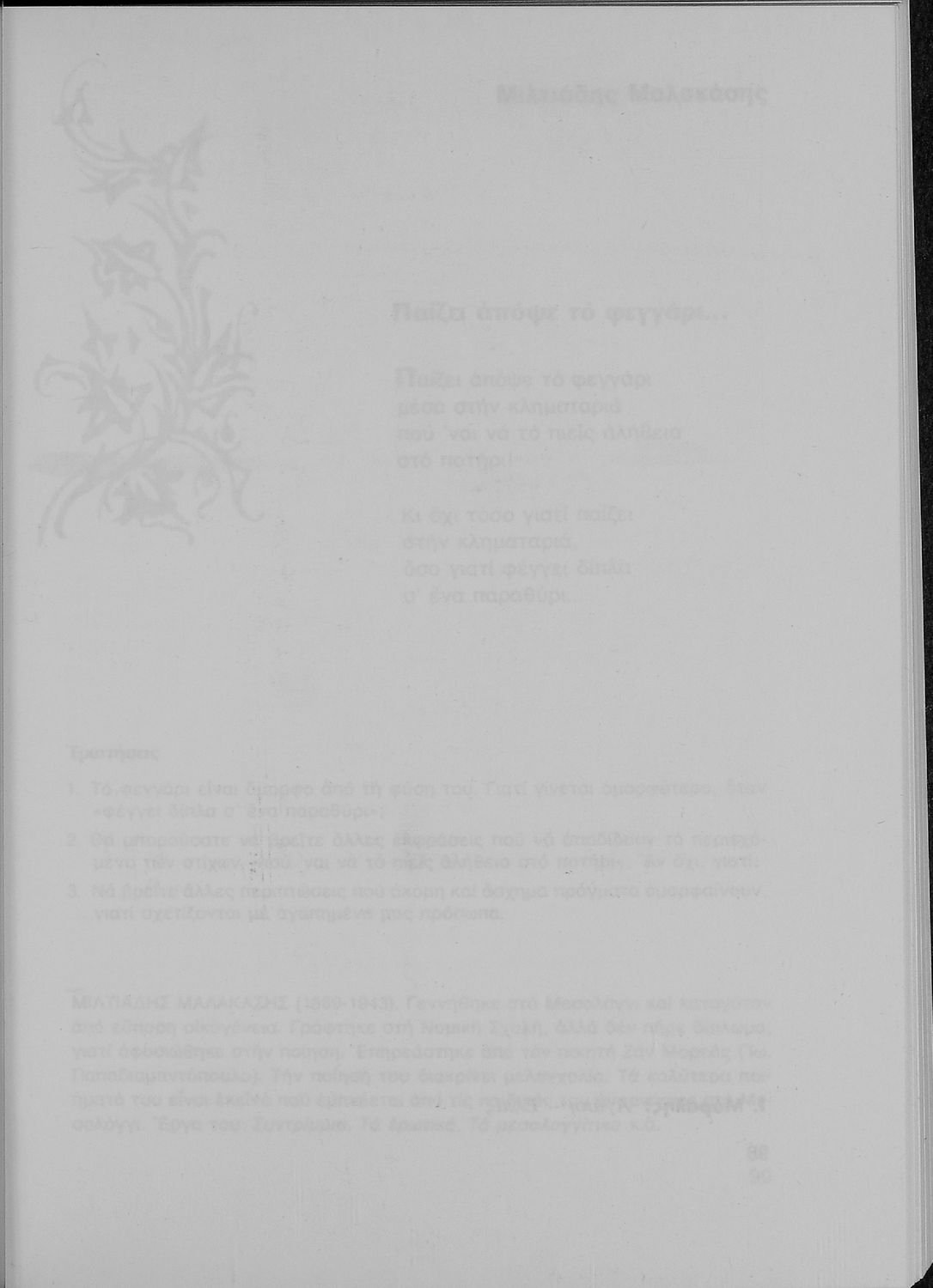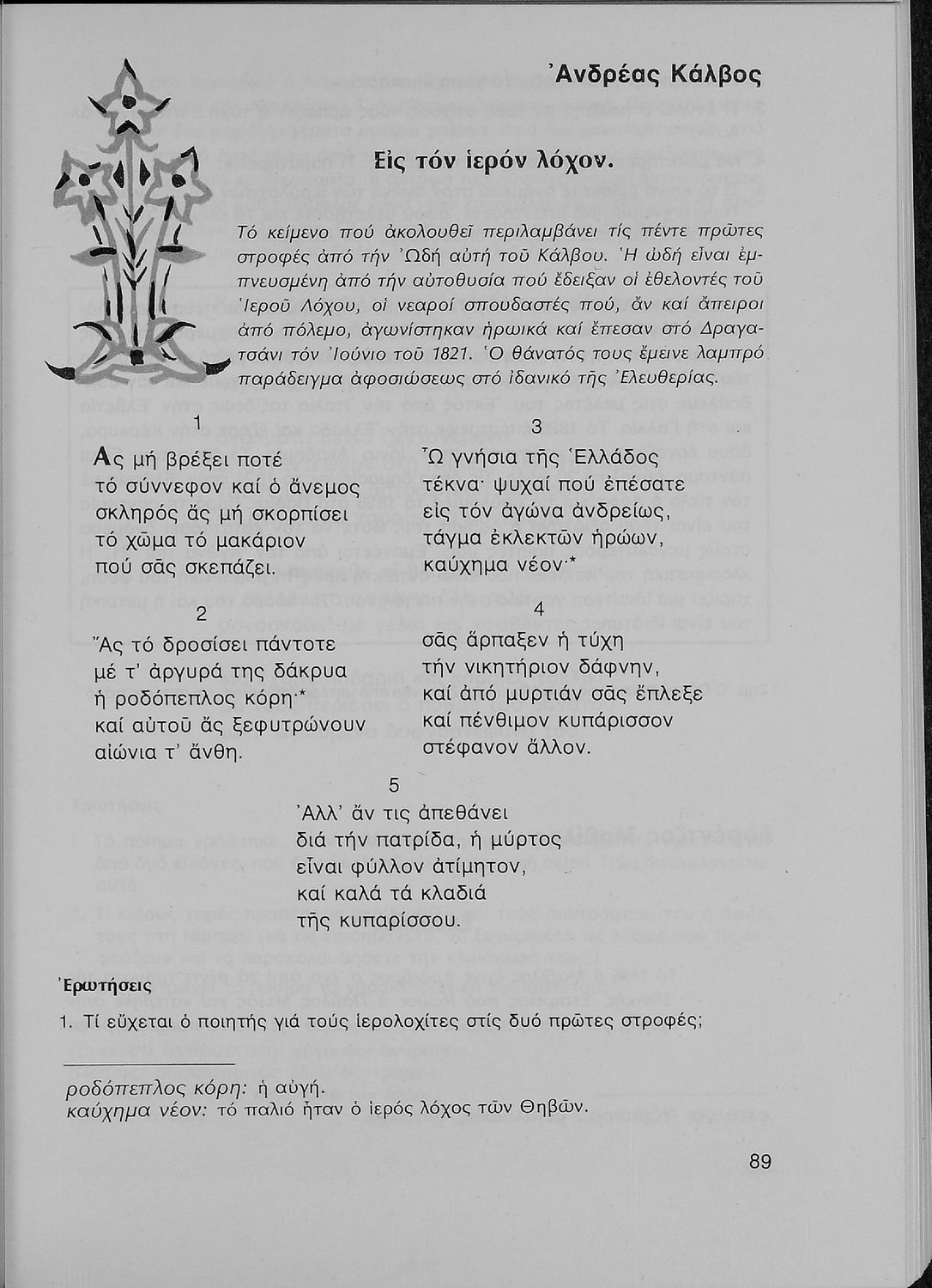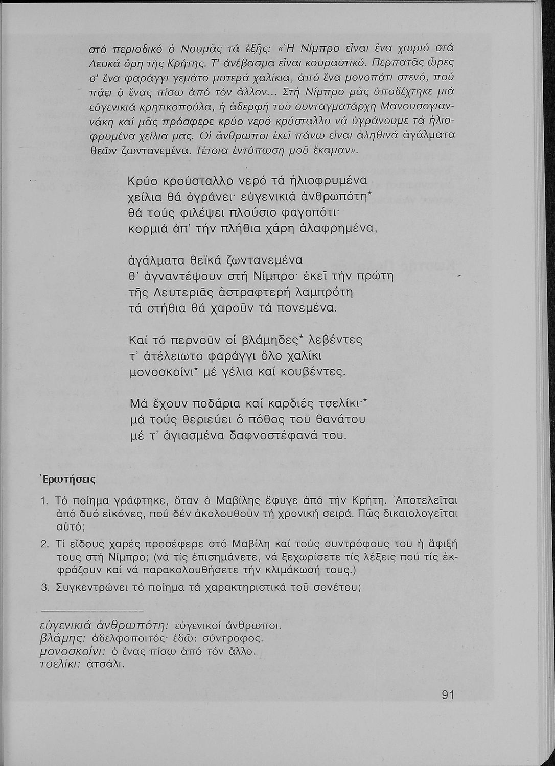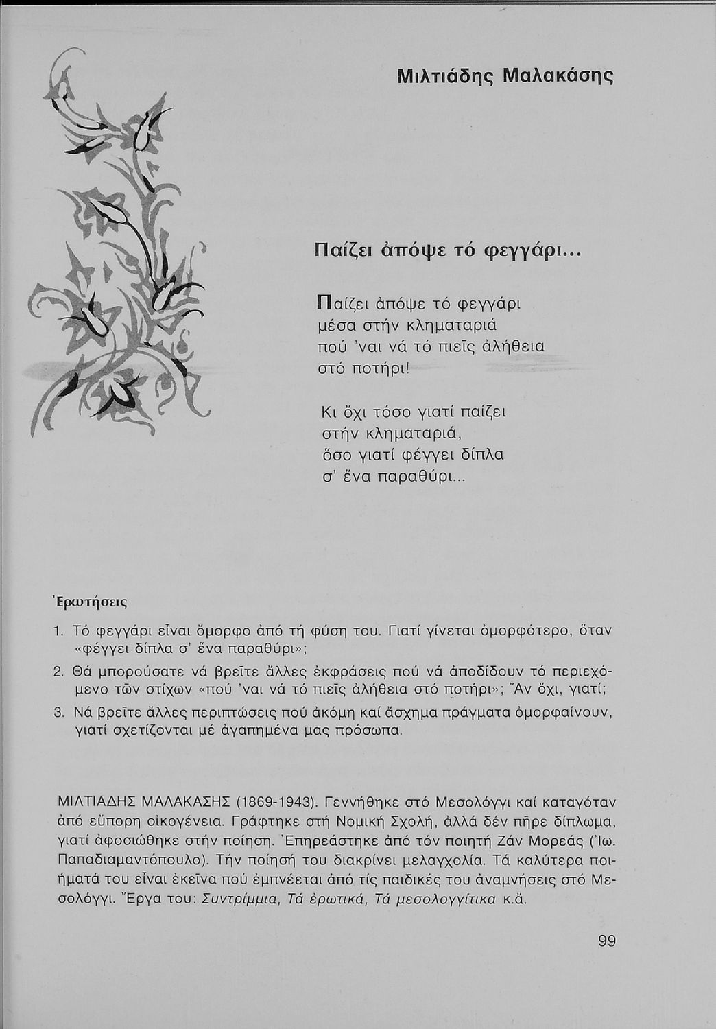 Σχολικό εγχειρίδιο Νέων Ελληνικών Β' Γυμνασίου που περιέχει δημοτικά τραγούδια, πεζά, δοκίμια και ποιήματα σύγχρονων Ελλήνων συγγραφέων και είναι χωρισμένο σε θεματικές ενότητες όπως η πόλη και η ύπαιθρος, η εποχή του 40' και η κατοχή, η θρησκευτική ζωή, ο καημός της ξενιτιάς, ο ελληνισμός έξω από τα σύνορα, οι αγώνες Ακριτών-Κλεφτών κ.α. Περιλαμβάνει και έργα ευρωπαίων λογοτεχνών.