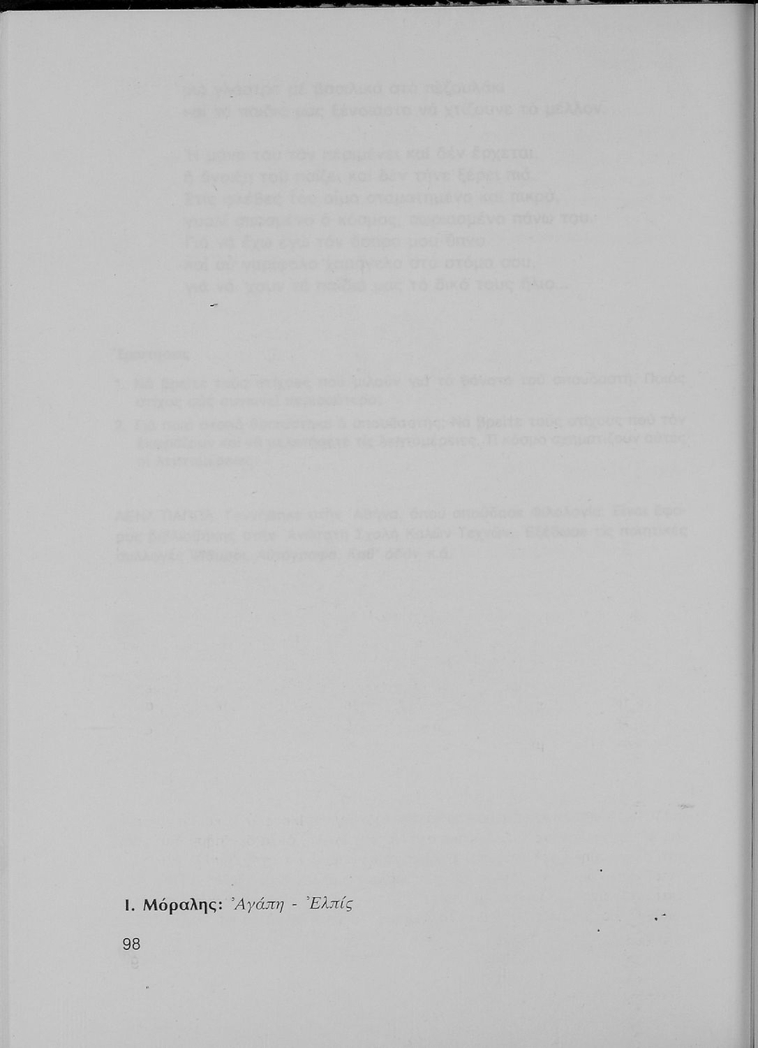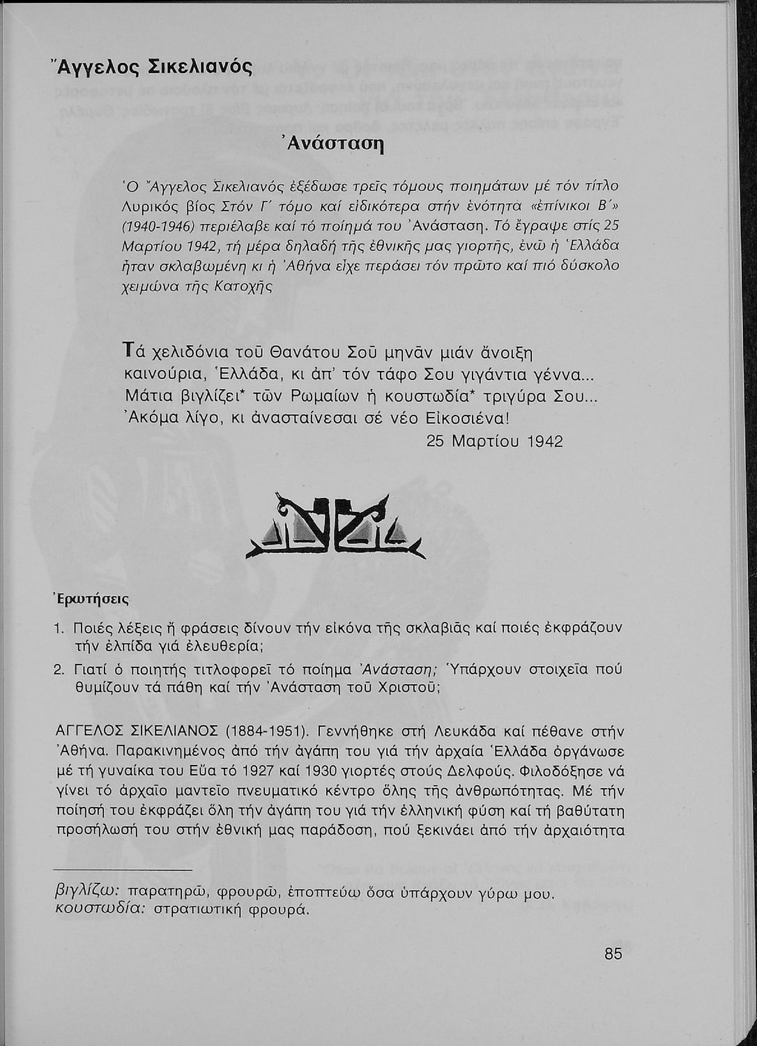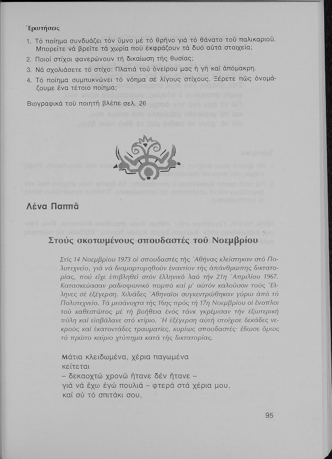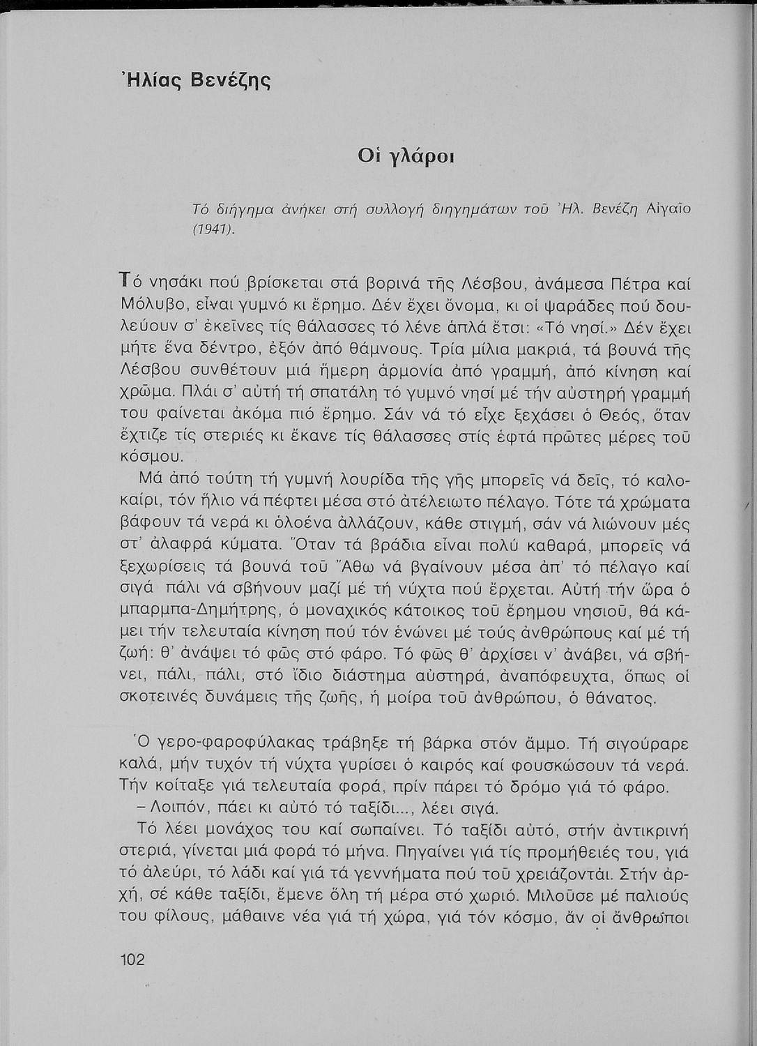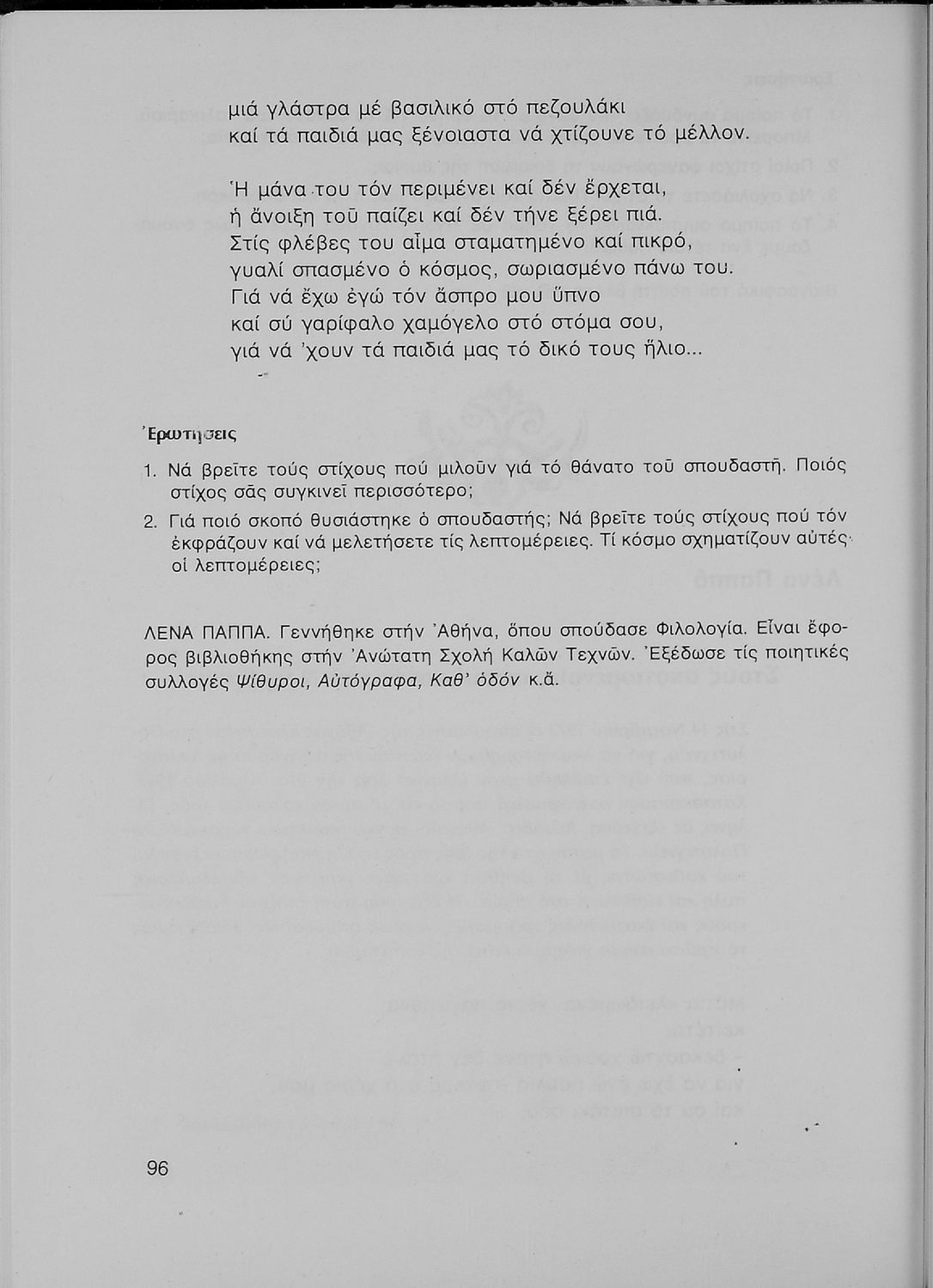 Σχολικό εγχειρίδιο Νέων Ελληνικών Β' Γυμνασίου που περιέχει δημοτικά τραγούδια, πεζά, δοκίμια και ποιήματα σύγχρονων Ελλήνων συγγραφέων και είναι χωρισμένο σε θεματικές ενότητες όπως η πόλη και η ύπαιθρος, η εποχή του 40' και η κατοχή, η θρησκευτική ζωή, ο καημός της ξενιτιάς, ο ελληνισμός έξω από τα σύνορα, οι αγώνες Ακριτών-Κλεφτών κ.α. Περιλαμβάνει και έργα ευρωπαίων λογοτεχνών.