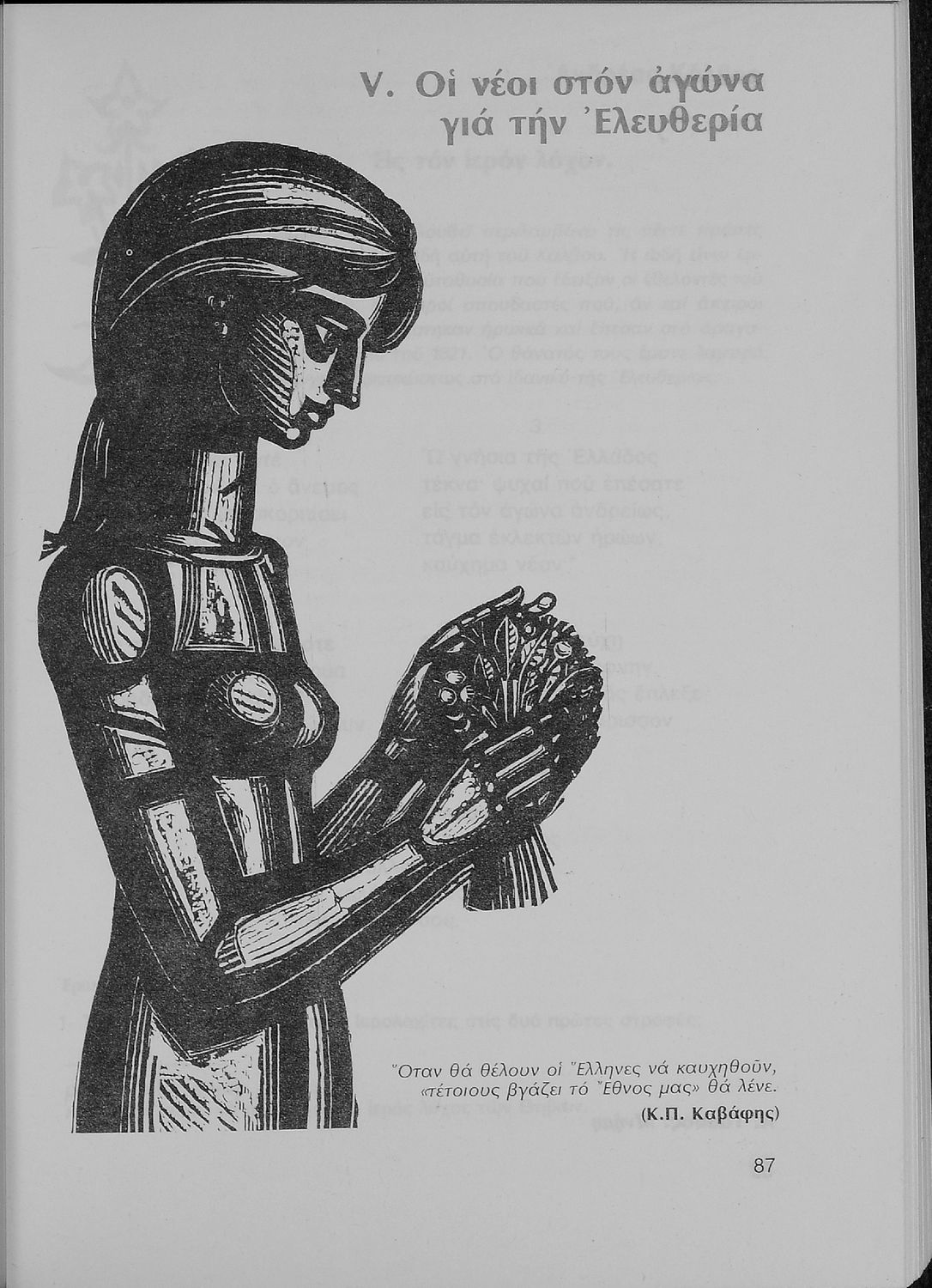 Σχολικό εγχειρίδιο Νέων Ελληνικών Α΄ Γυμνασίου που περιλαμβάνει δοκίμια, πεζά και ποιήματα Ελλήνων συγγραφέων και δημοτικά τραγούδια εμπνευσμένα από τη θρησκευτική, εθνική και κοινωνική ζωή, τη "δοκιμασία της ...