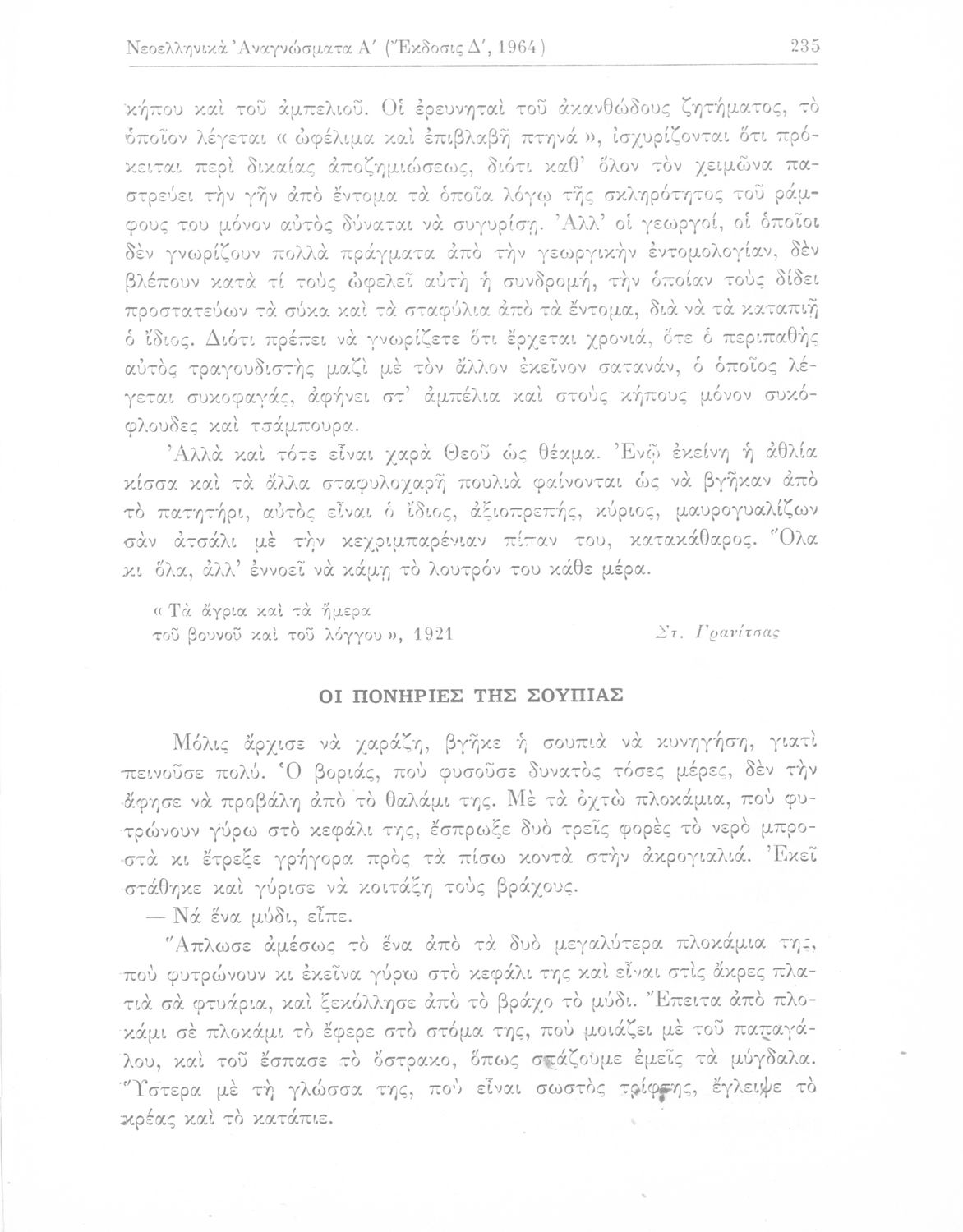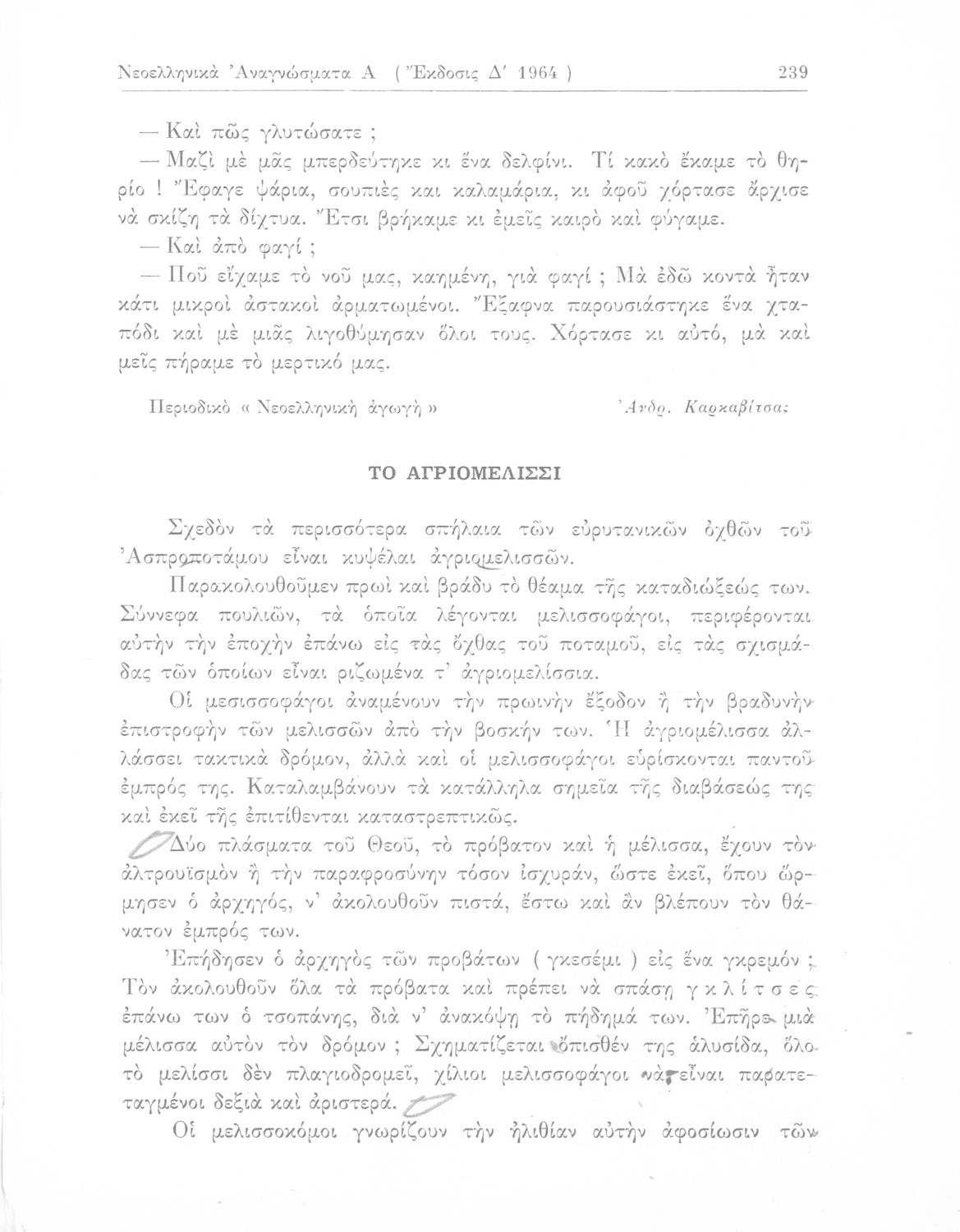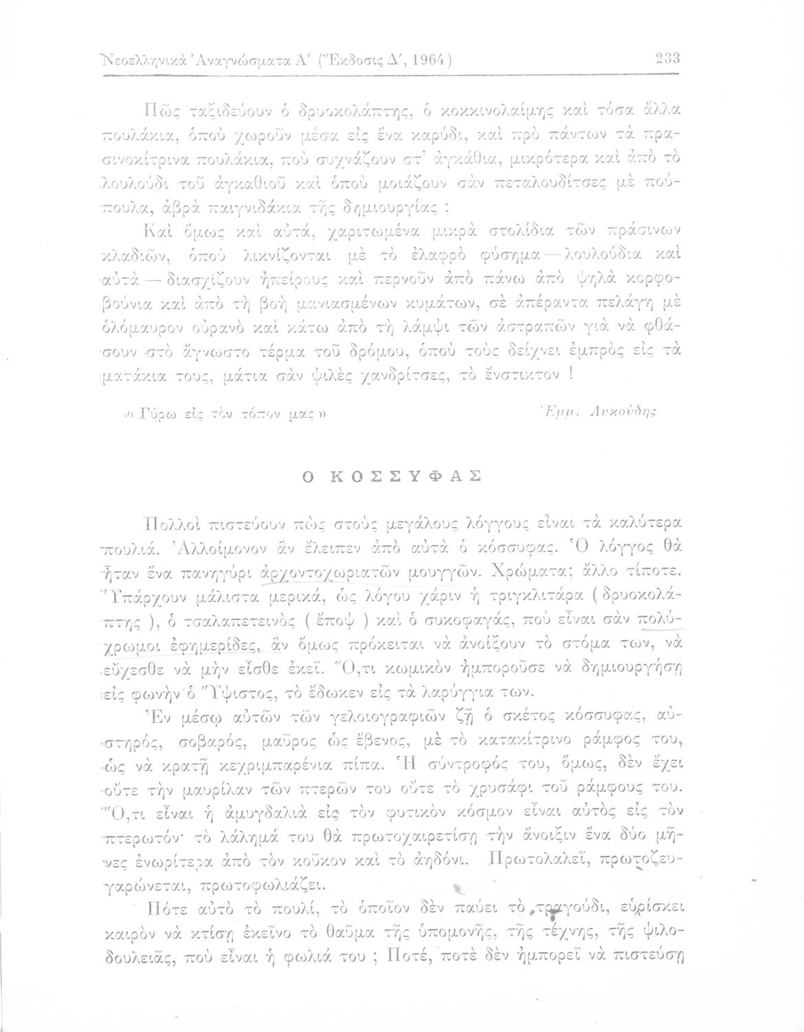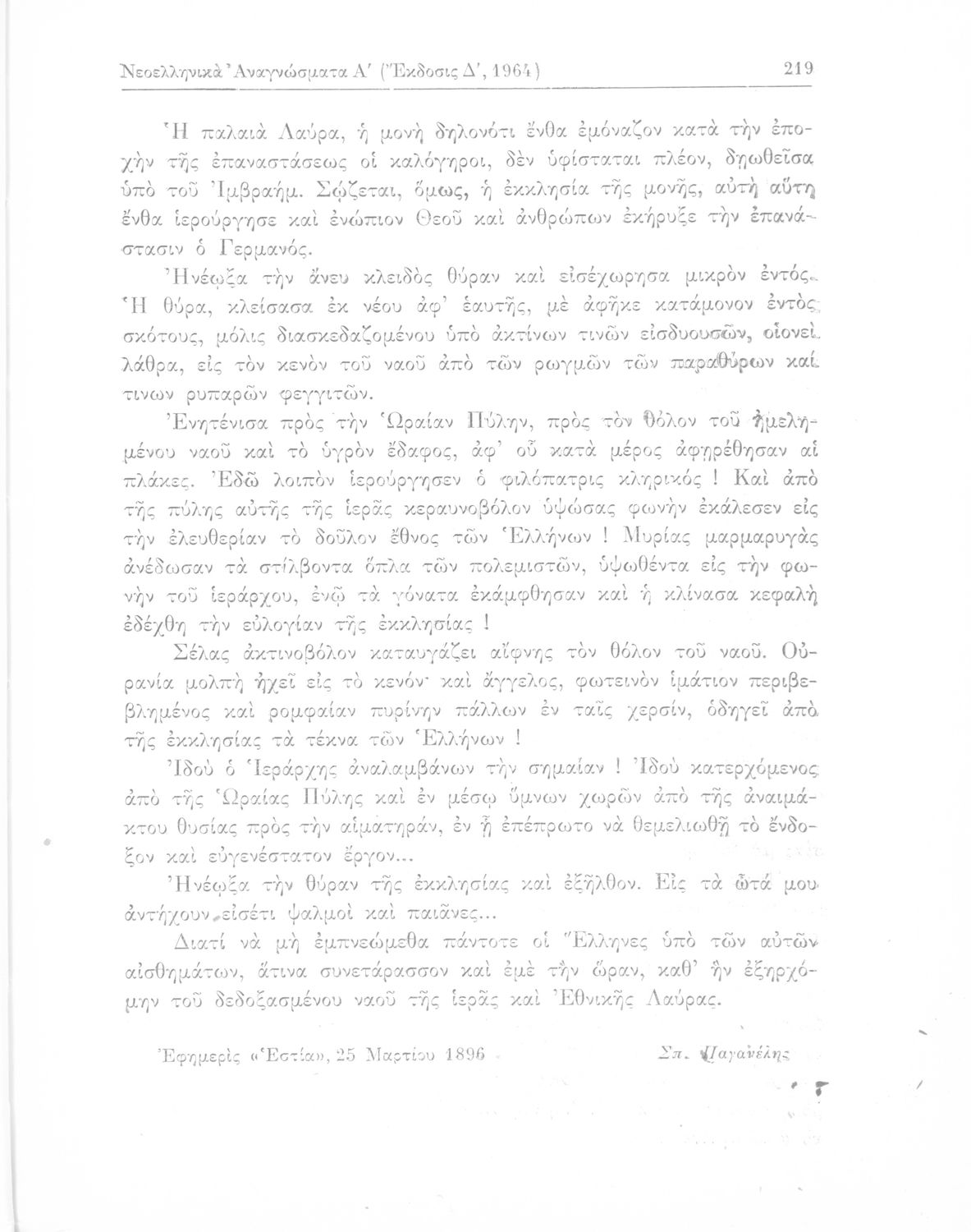 Σχολικό εγχειρίδιο Νέων Ελληνικών Γ΄ Γυμνασίου και Α' Αστικού Σχολείου που περιέχει πεζά και ποιήματα Ελλήνων συγγραφέων εμπνευσμένα από τη θρησκευτική και κοινωνική ζωή, την ελληνική μυθολογία, την αρχαία και